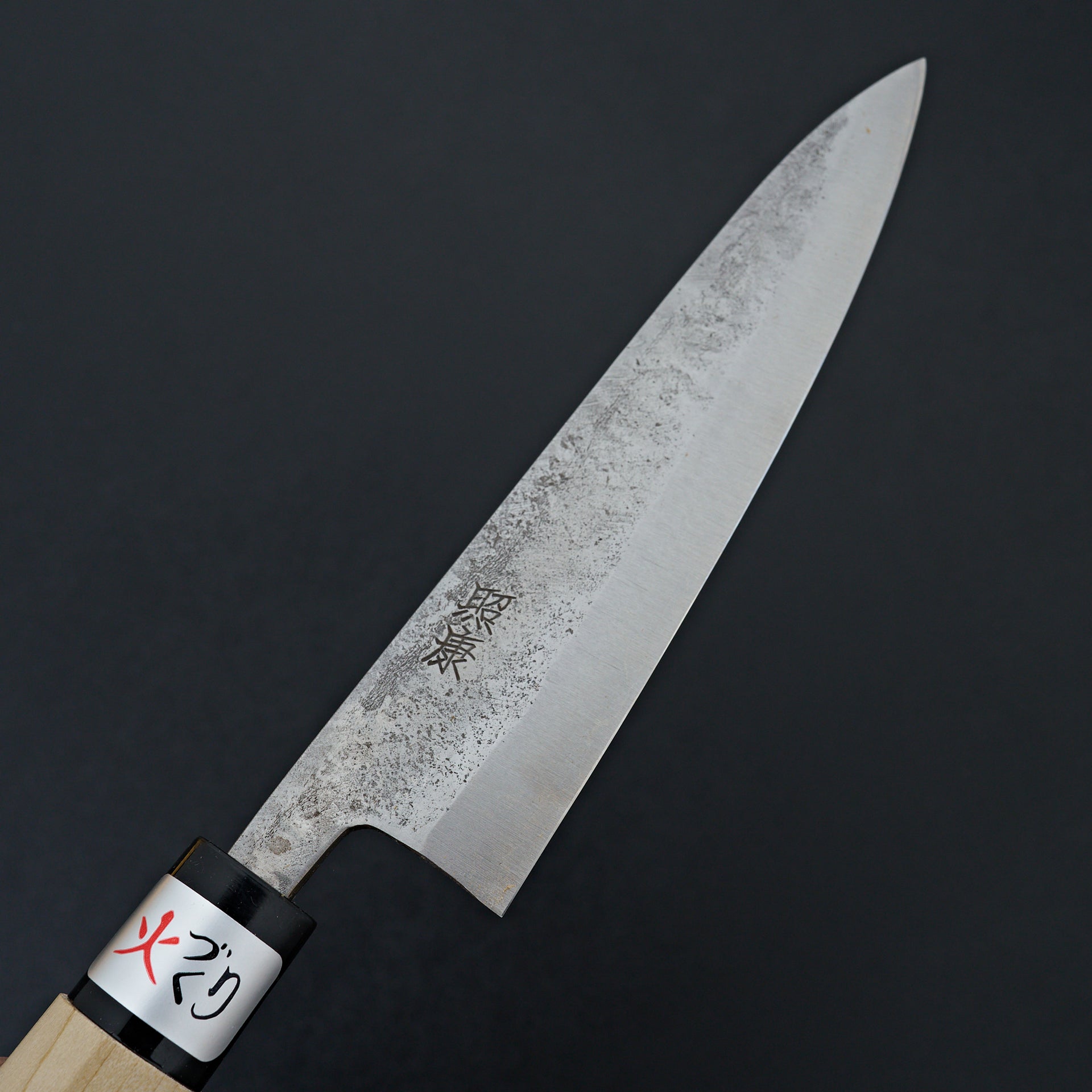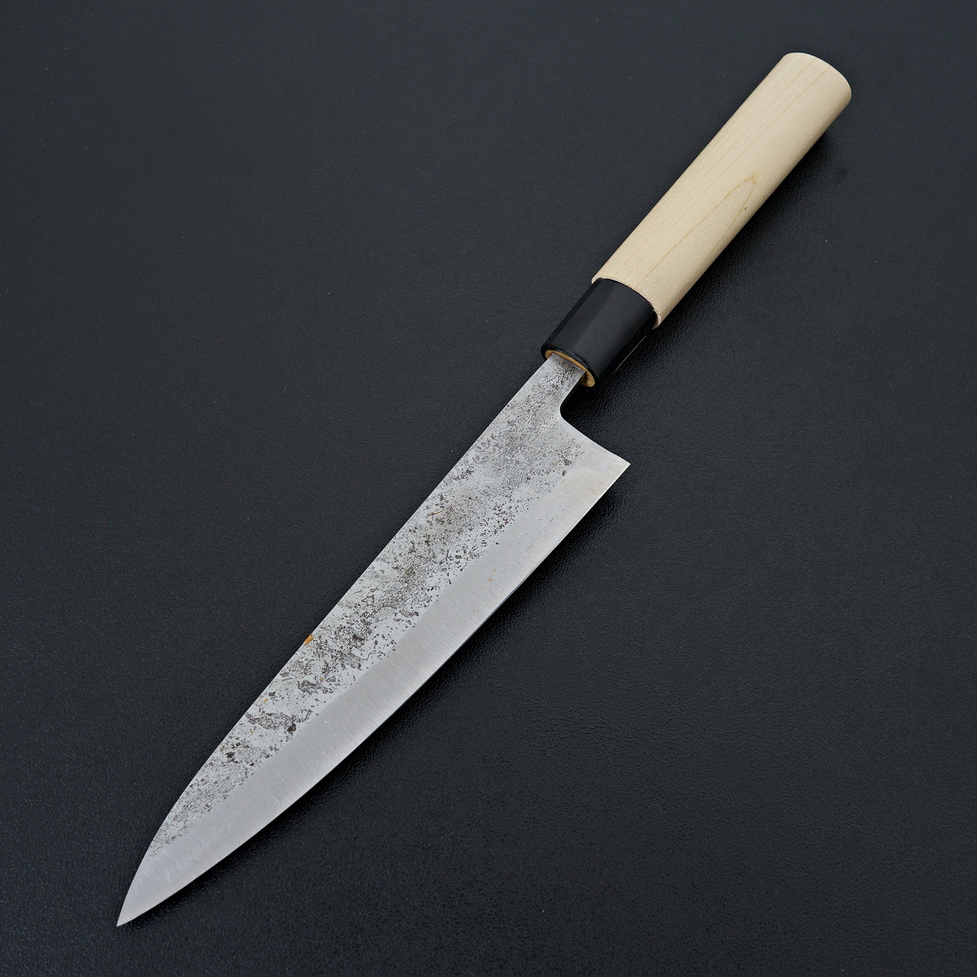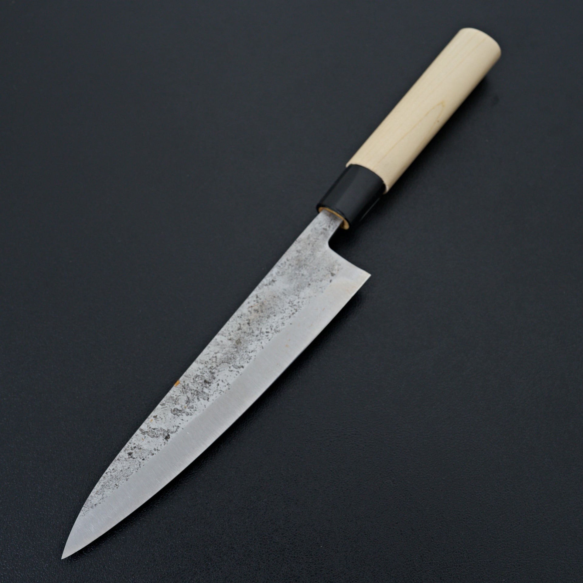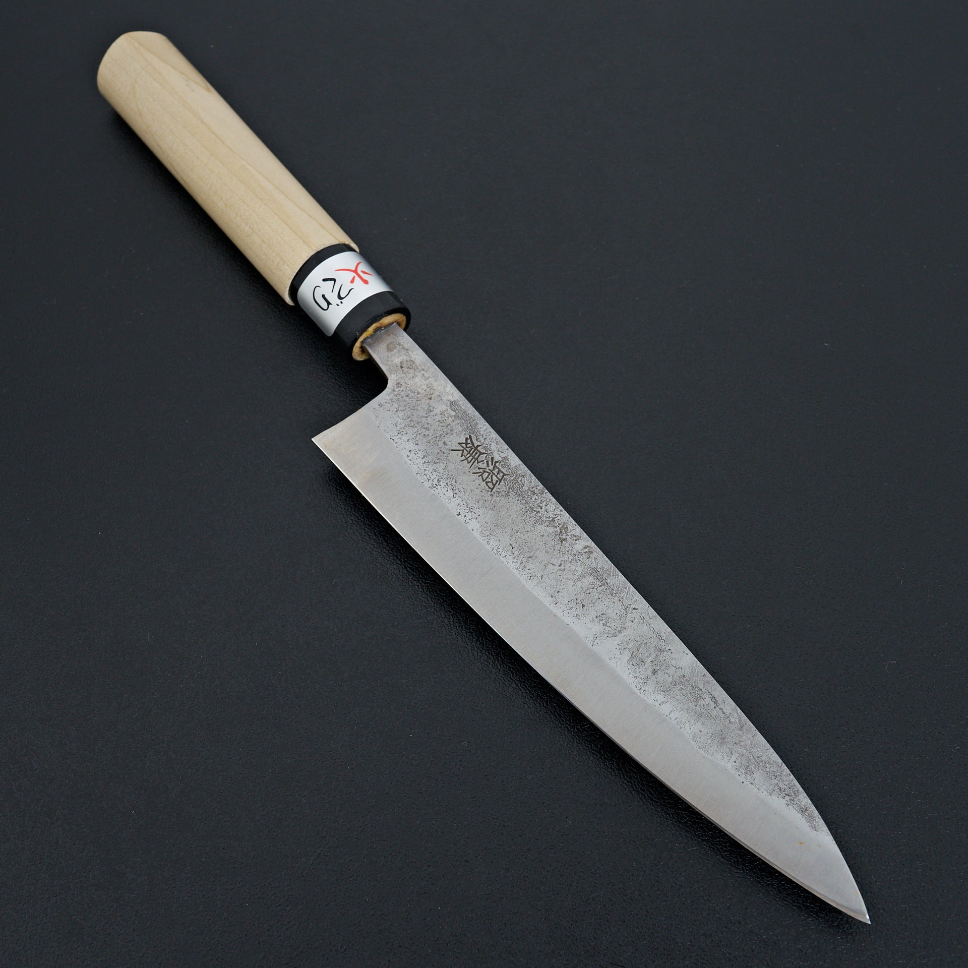 His Nashiji (skin of Asian pear) line is forged from white #1 steel, 64-65 HRC, and takes on a scary sharp edge! Cladded with stainless steel, fitted with a magnolia D handle and plastic ferrule.
