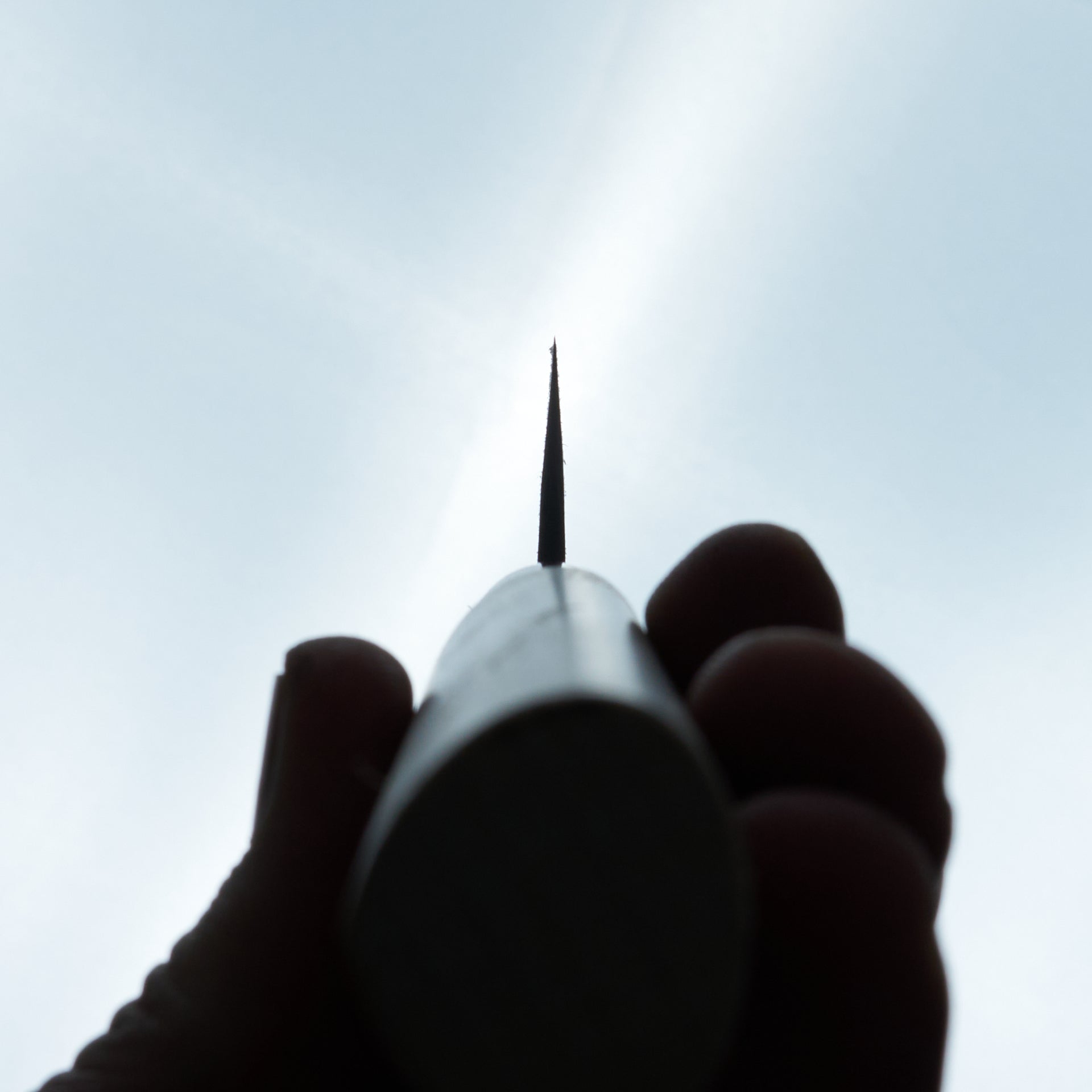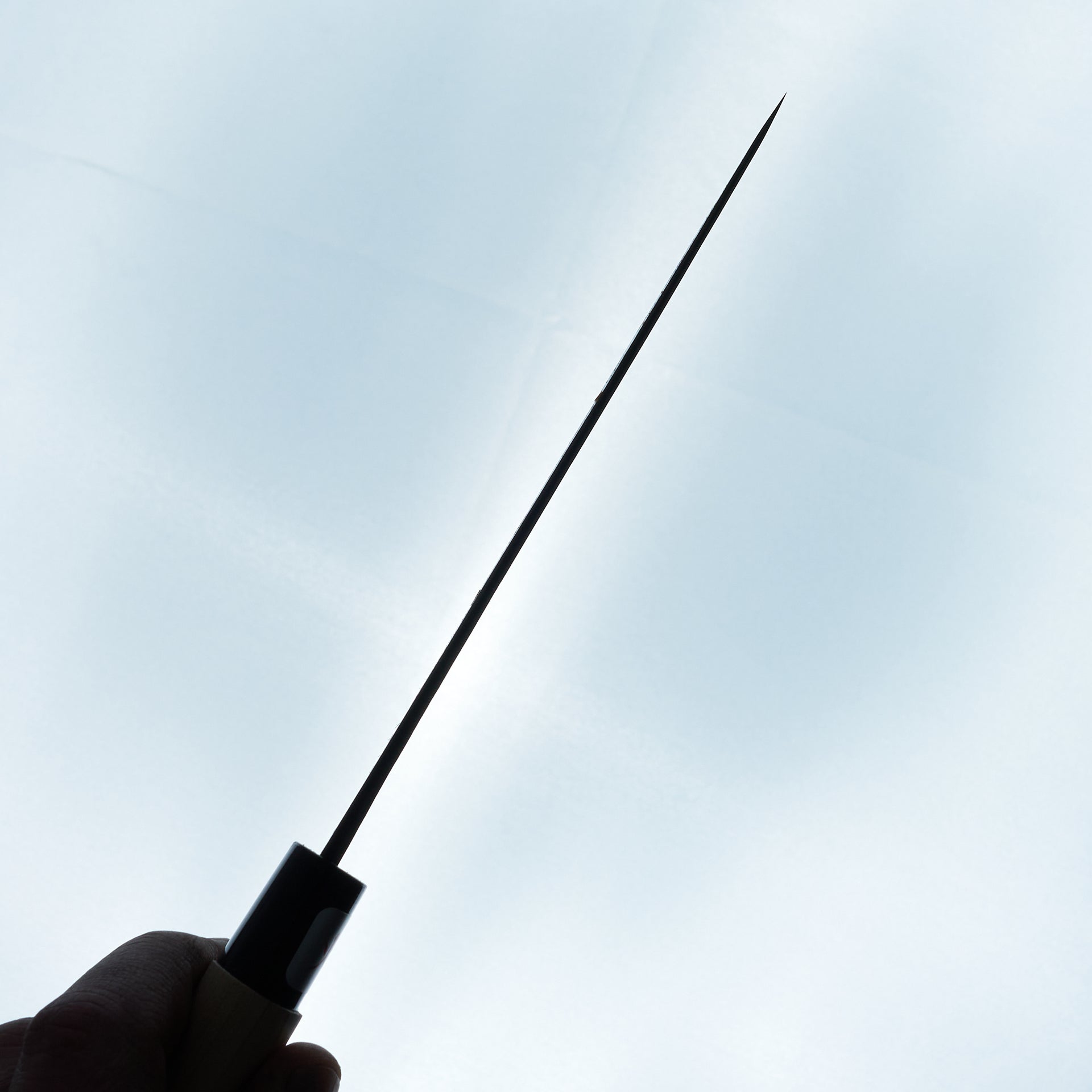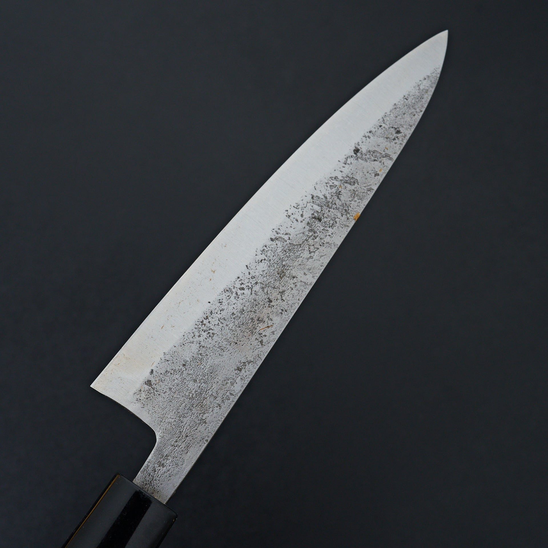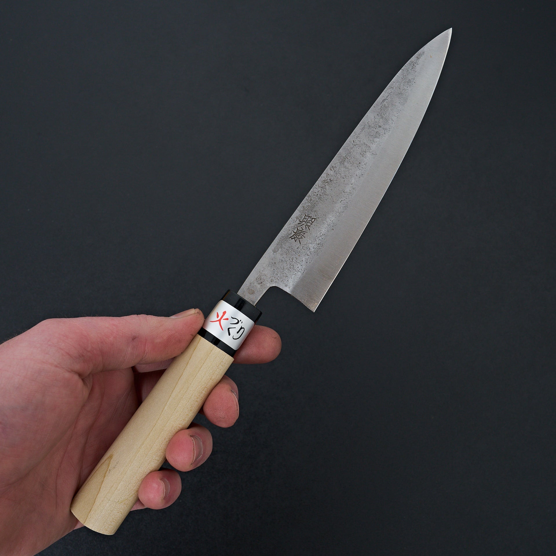 His Nashiji (skin of Asian pear) line is forged from white #1 steel, 64-65 HRC, and takes on a scary sharp edge! Cladded with stainless steel, fitted with a magnolia D handle and plastic ferrule.