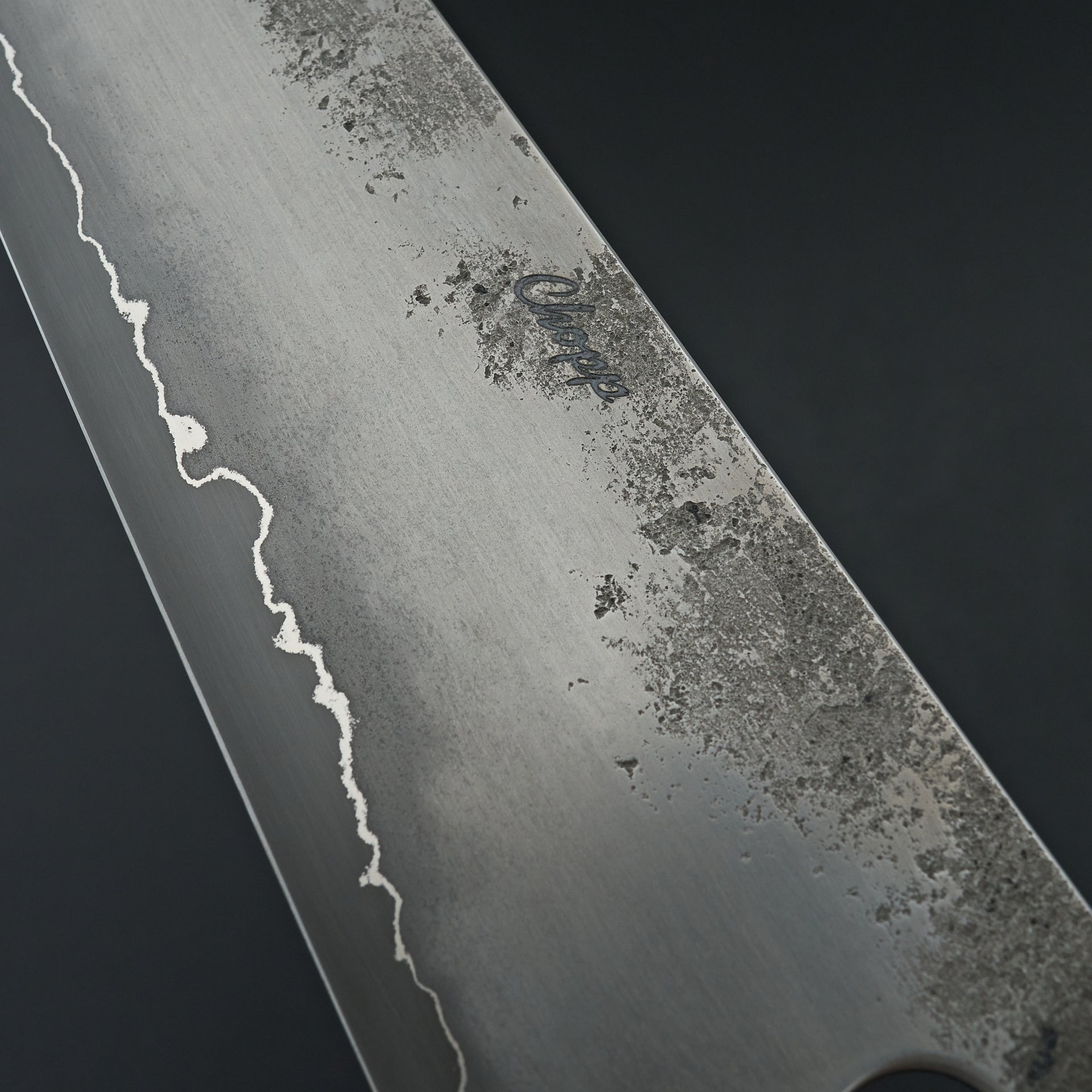 Handle Construction: Wa Handle, Hand sanded and etched finish, Steel was reclaimed from antique farming tool from a ranch in Oregon
