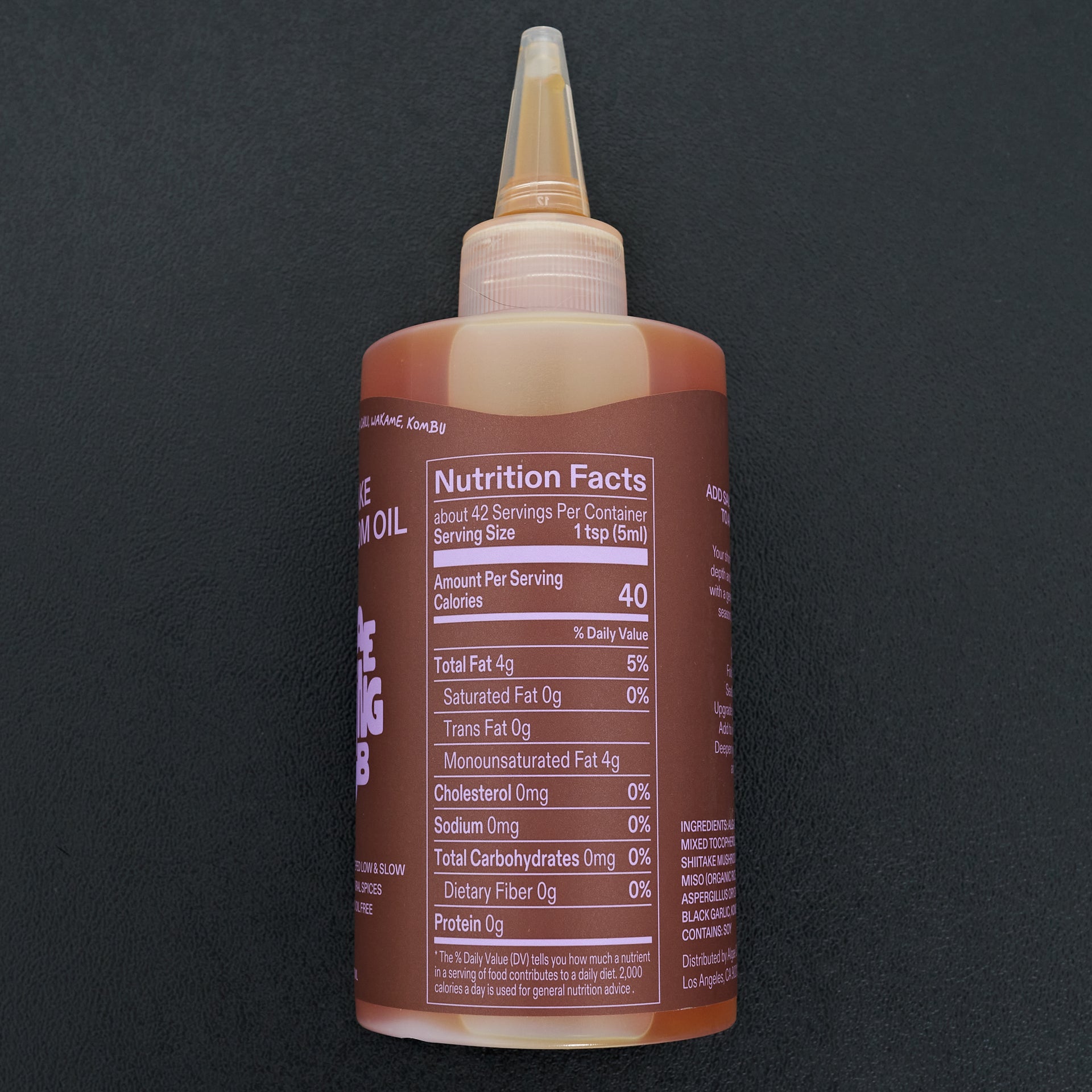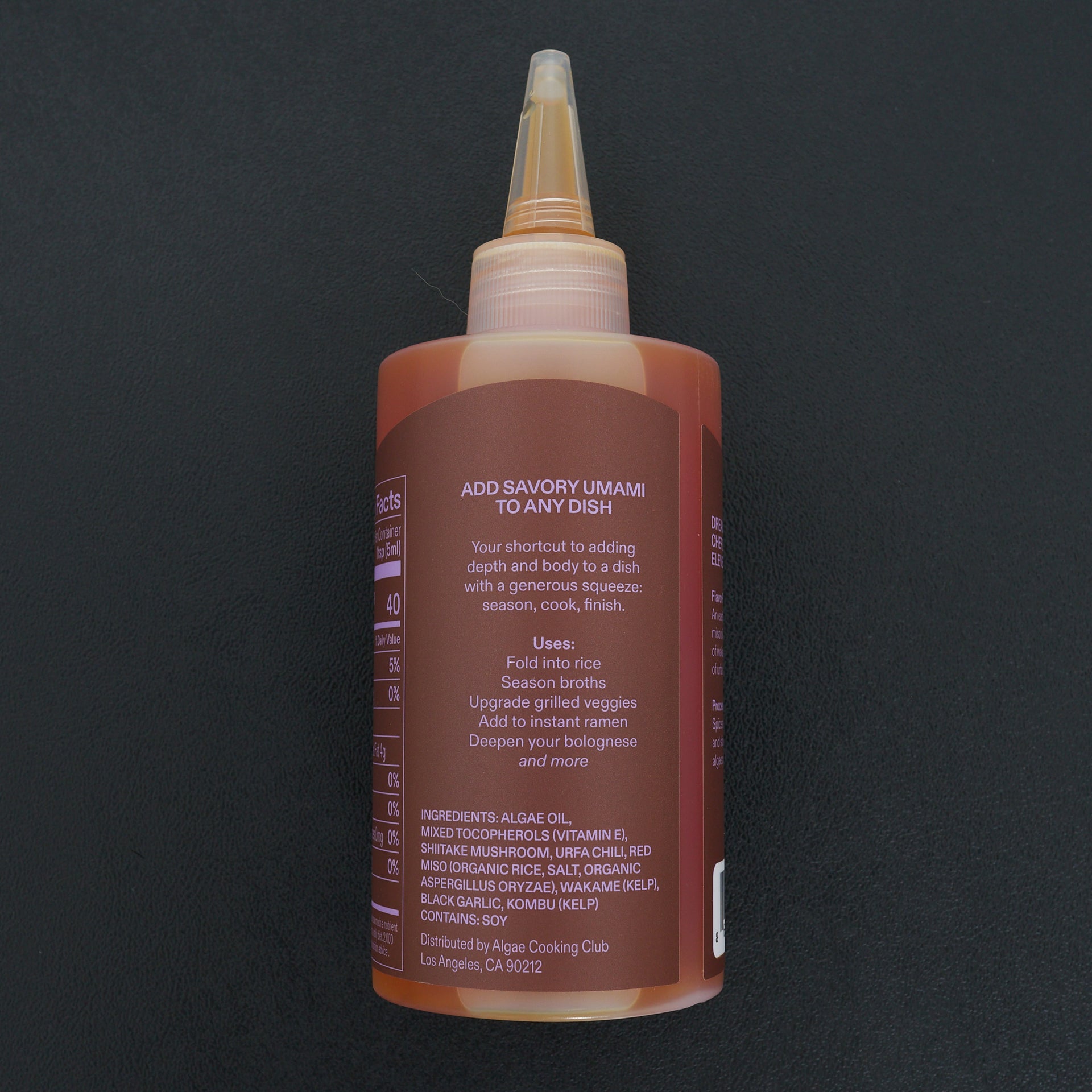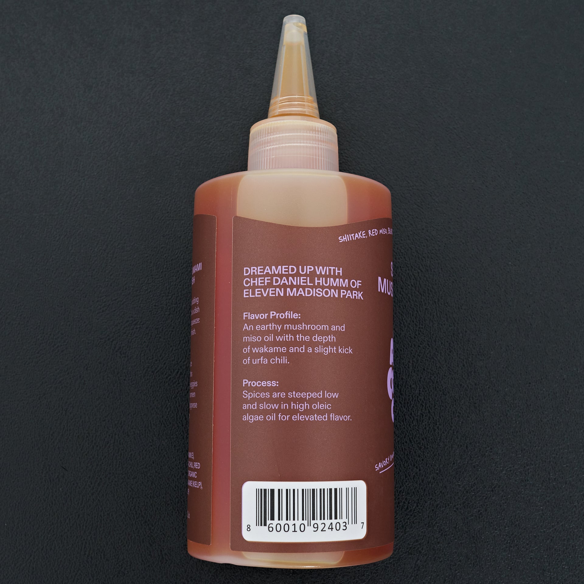 Ingredients: Culinary algae oil, Dried Shiitake, Red Miso, Black Garlic, Urfa Chili, Wakame, Shio Kombu
