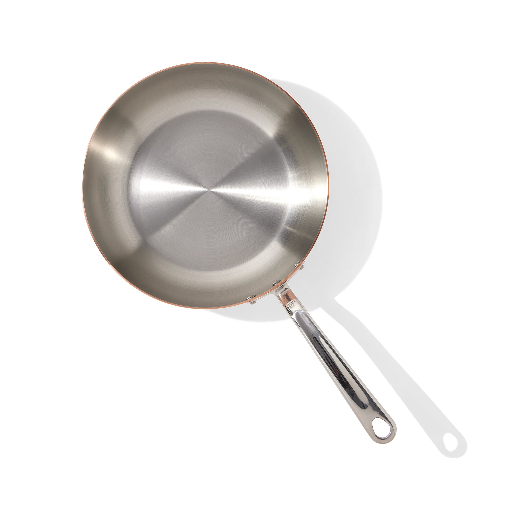 Ours is crafted in France and modernized with a Stainless Steel interior. Standard tin linings can’t tolerate high heat and require periodic retinning, but non-reactive Stainless Steel lasts indefinitely and can withstand temperatures twice as high. Thanks to this unique construction and the Frying Pan’s flared edge design, conductivity is at an all-time high—steam and moisture evaporate immediately, leading to perfectly even golden brown sears.