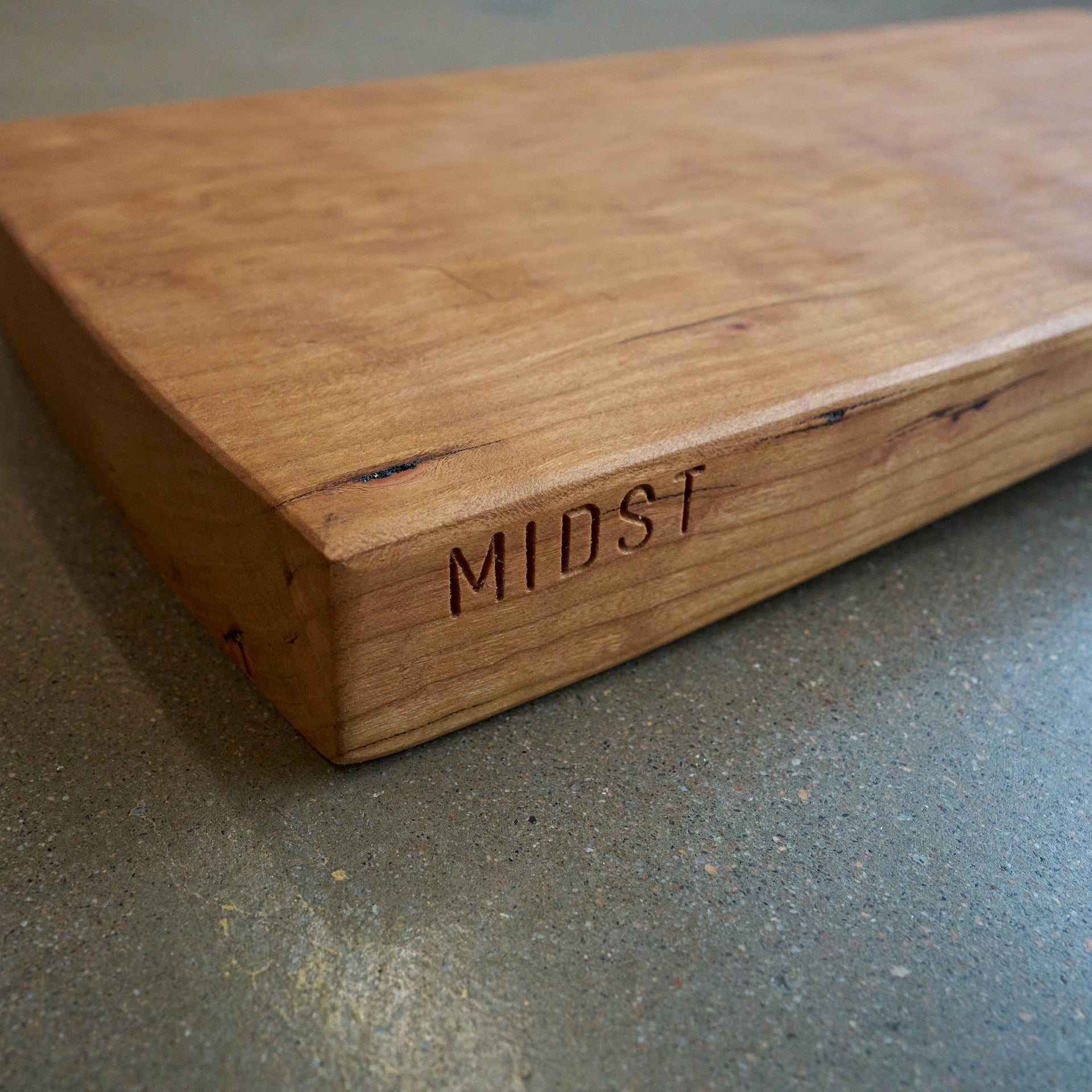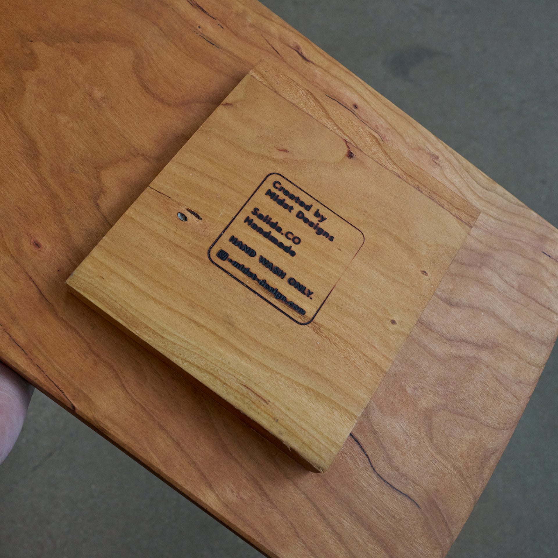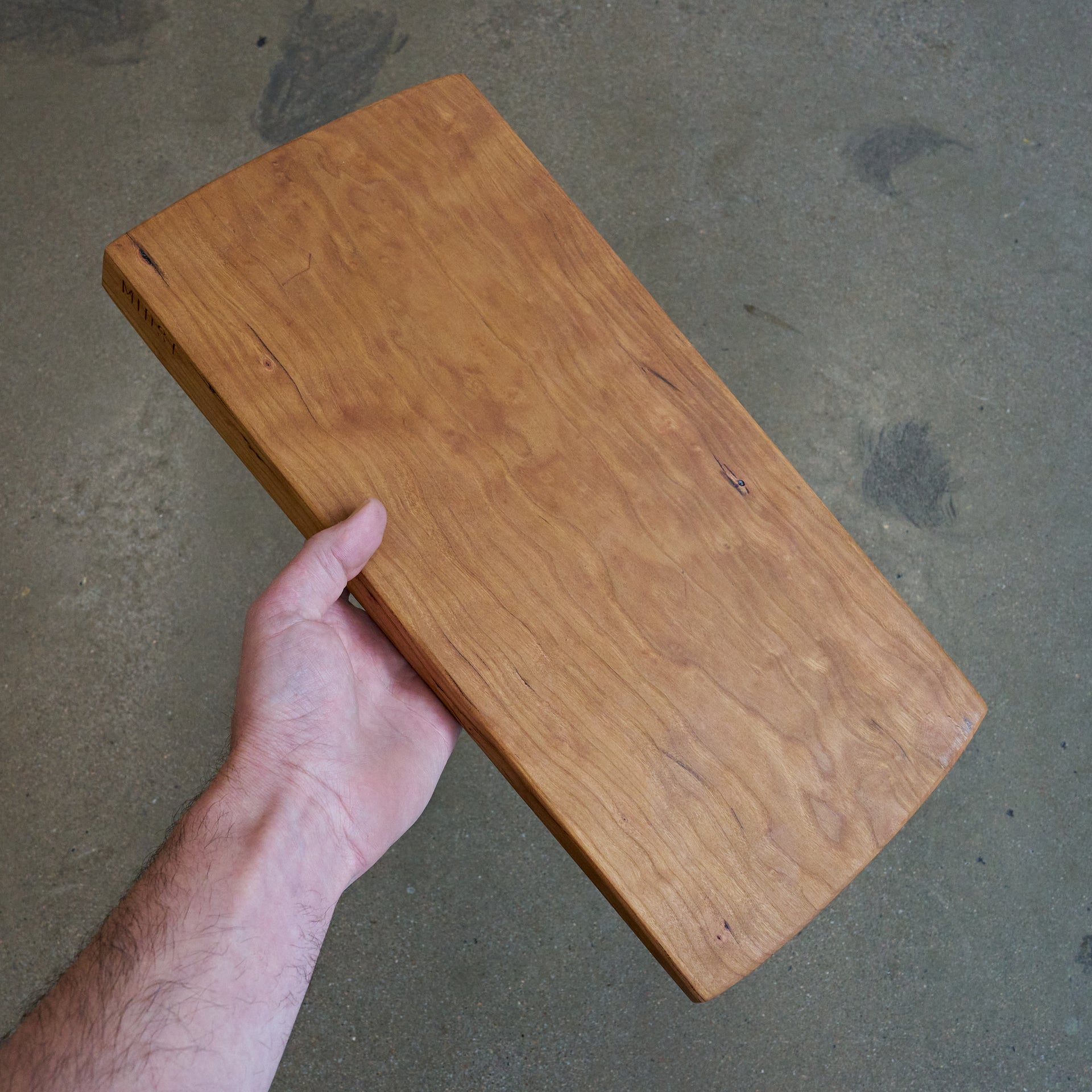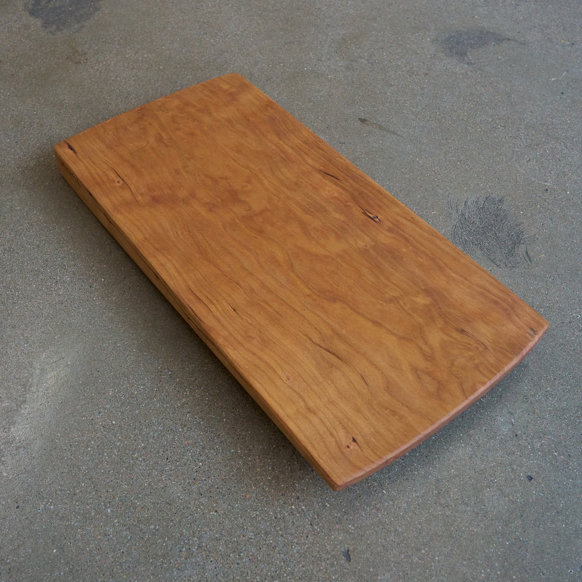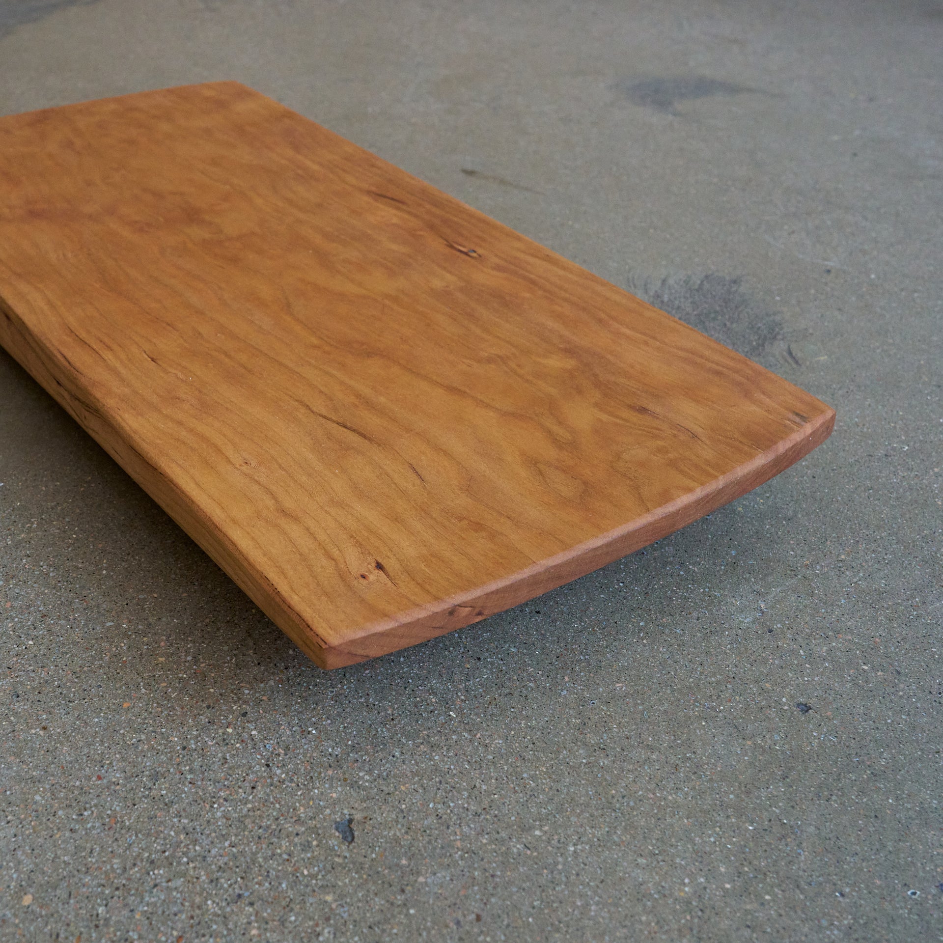 Expansive yet refined, the Snacker board (16" x 8" x1.25" is designed for larger gatherings, layered spreads, and shared abundance. Carved from cherry wood with a clean architectural lift, its raised base casts a nice shadow while offering effortless grip. The surface creates a generous stage for charcuterie, hors d'oeuvres, or anything meant to be beautifully arranged and easily reached. Ment for 4-6 people and perfect for a family of snackers. Please allow up to 10 days for you product to be crafted and delivered. All products packaged with recycled materials.