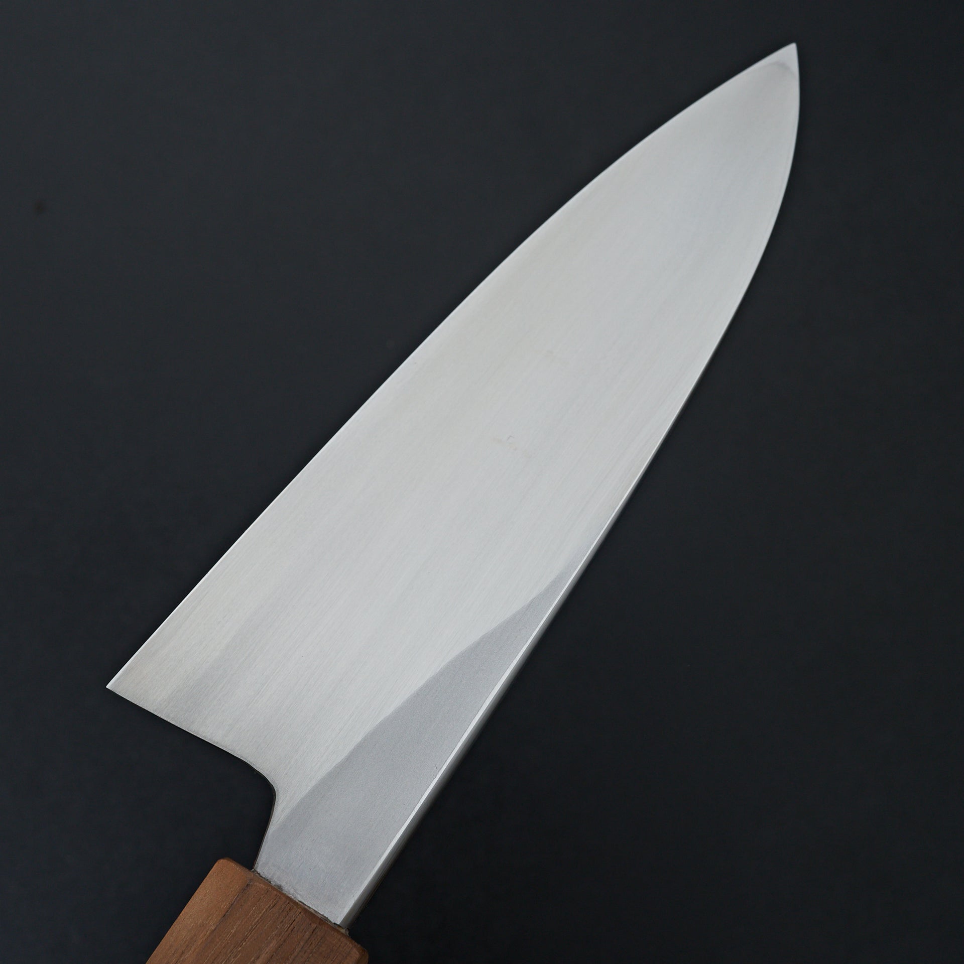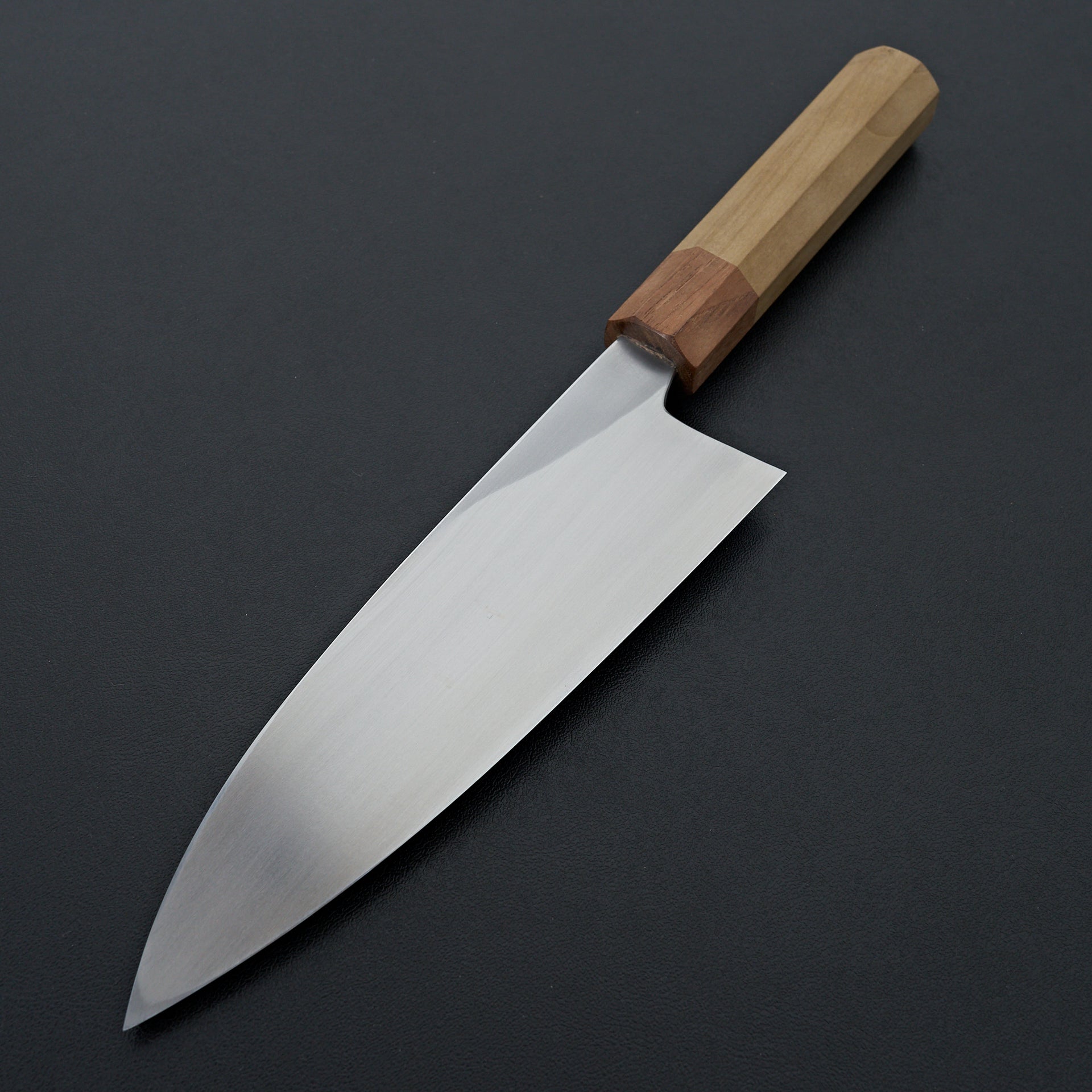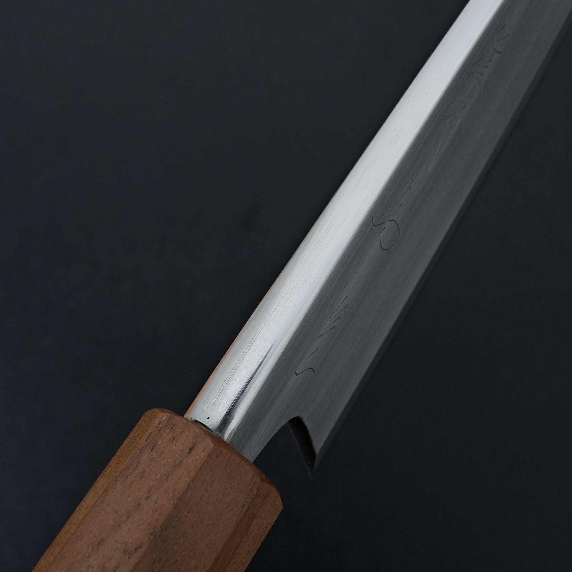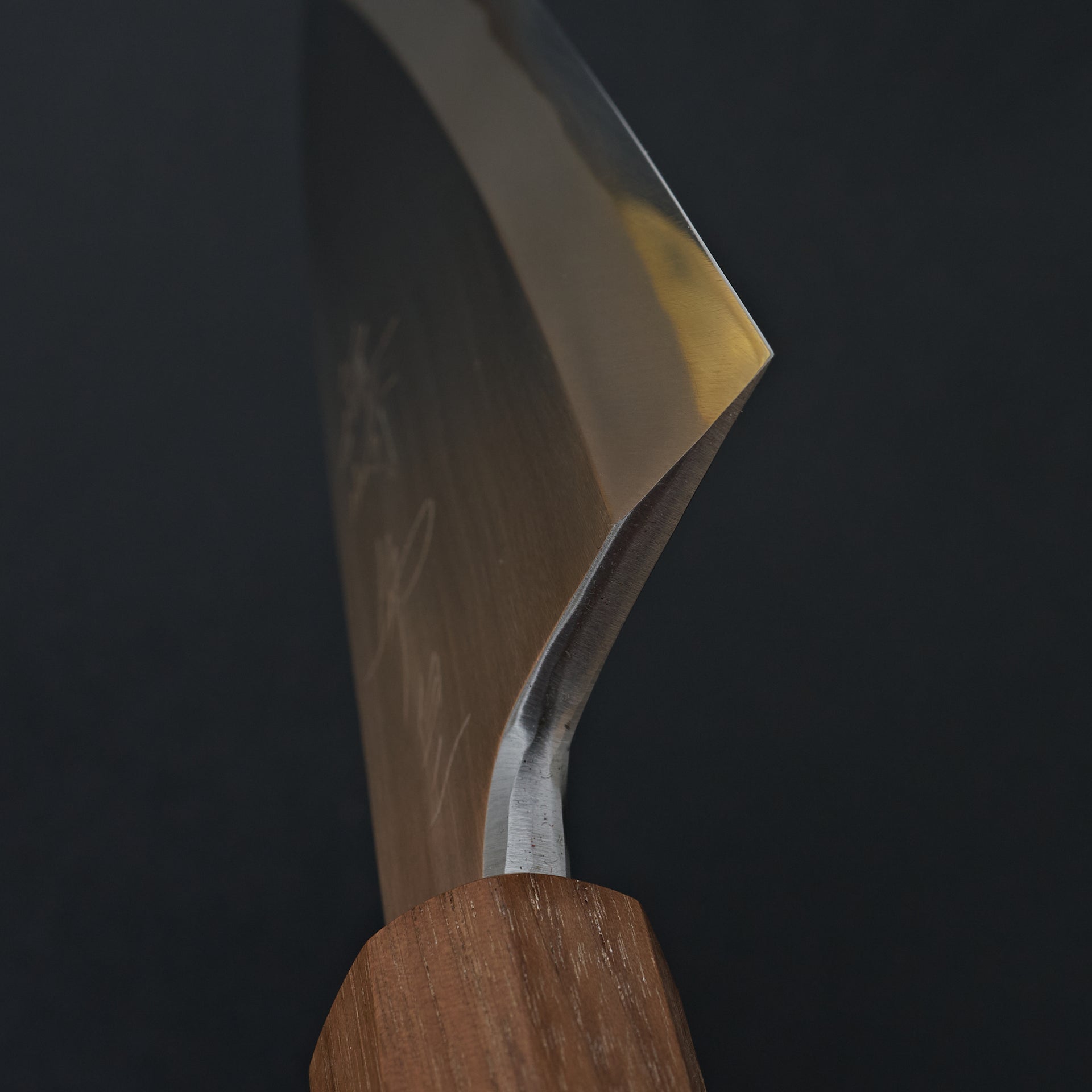 He focuses primarily on forging Shirogami (White) #2 carbon steel cladded in iron. The blade is migaki finished. The bevels are finished by hand on Japanese whetstones to ensure an even grind and geometry. The forged distal taper is quite impressive and has a nice progressive thinness towards the tip. Lightly convexed bevels and very thin behind the cutting edge. The octagonal handle is made from magnolia and walnut ferrule.