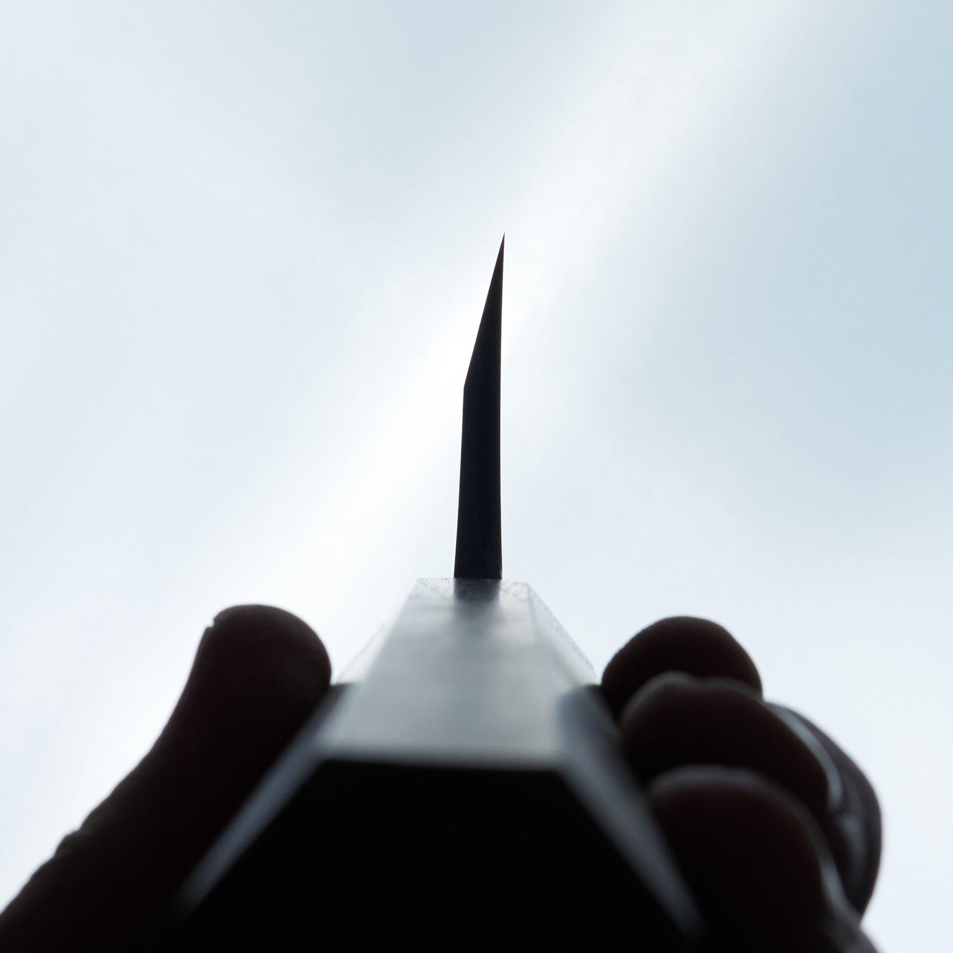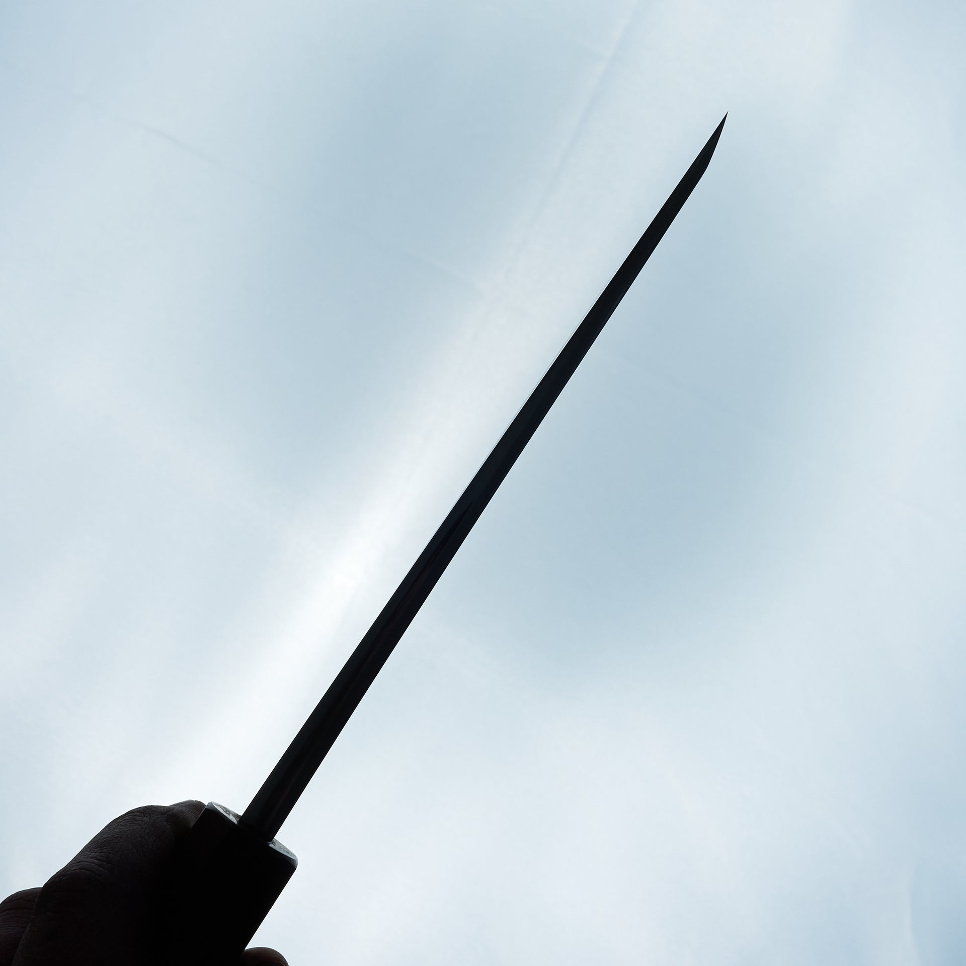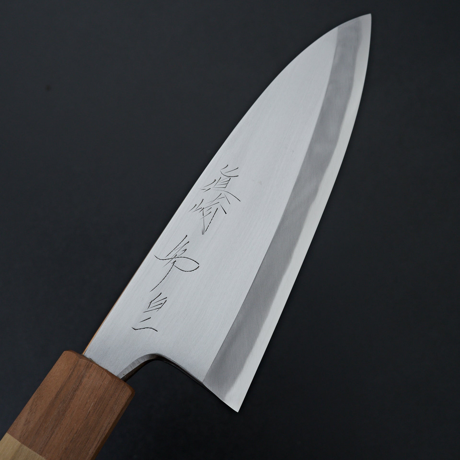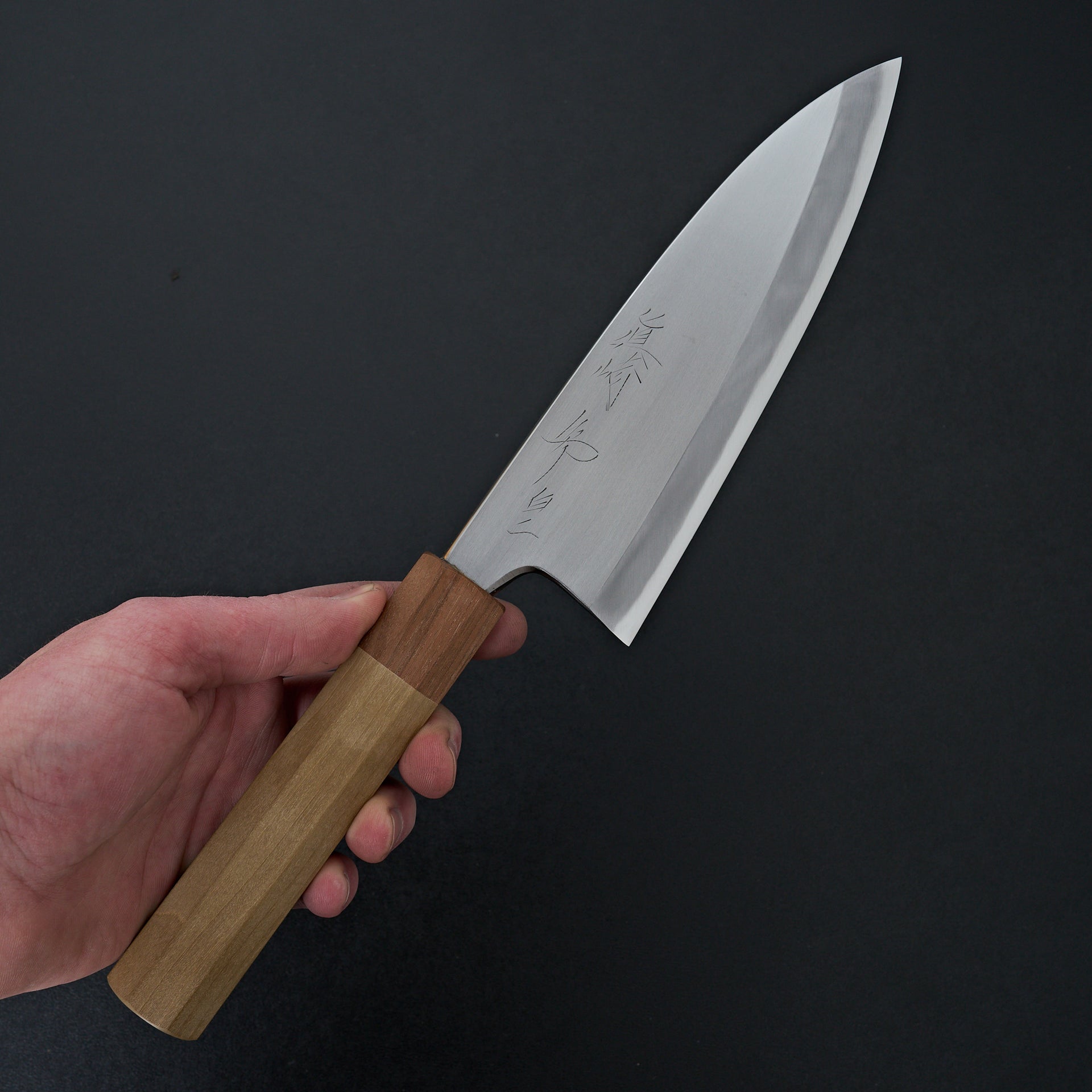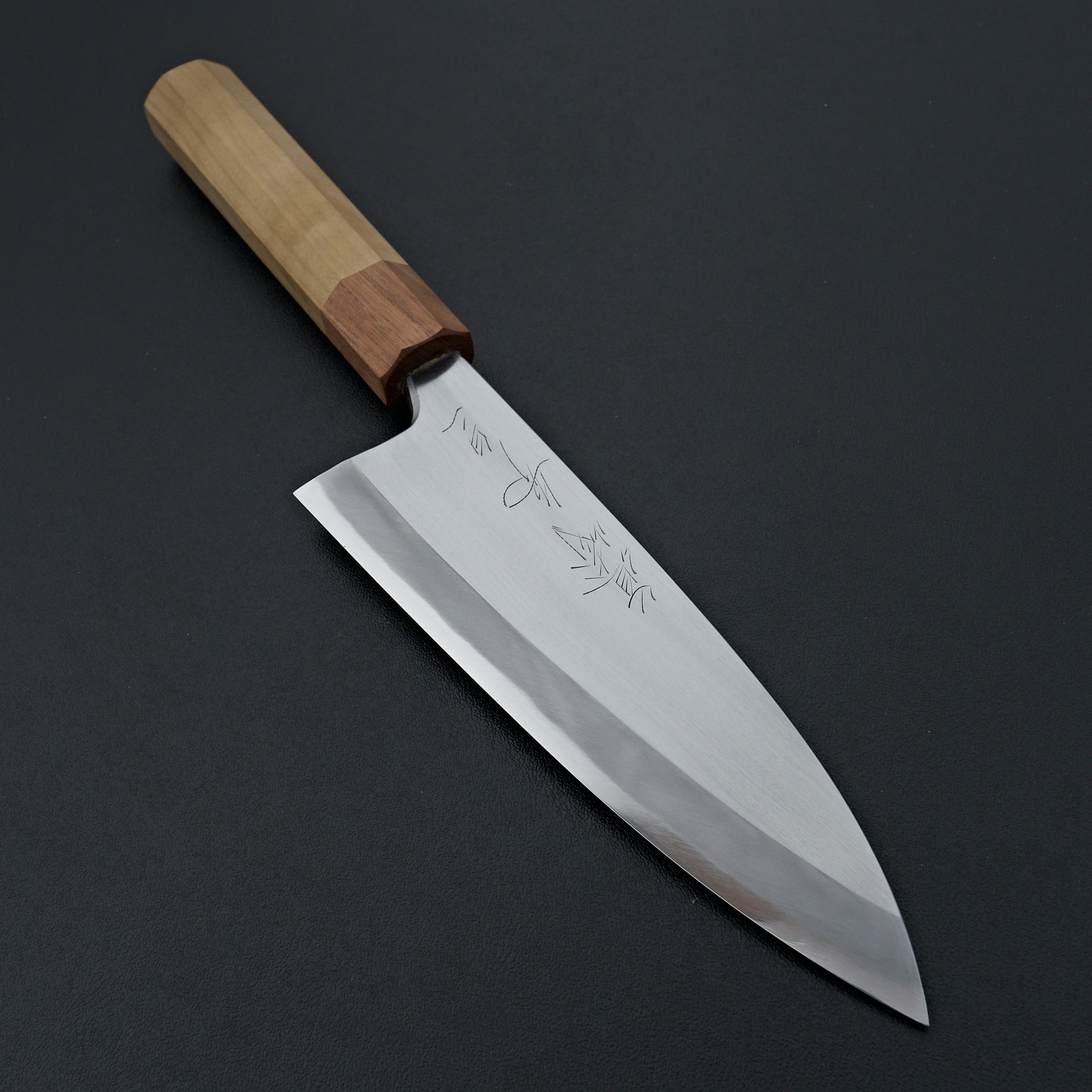 He focuses primarily on forging Shirogami (White) #2 carbon steel cladded in iron. The blade is migaki finished. The bevels are finished by hand on Japanese whetstones to ensure an even grind and geometry. The forged distal taper is quite impressive and has a nice progressive thinness towards the tip. Lightly convexed bevels and very thin behind the cutting edge. The octagonal handle is made from magnolia and walnut ferrule.