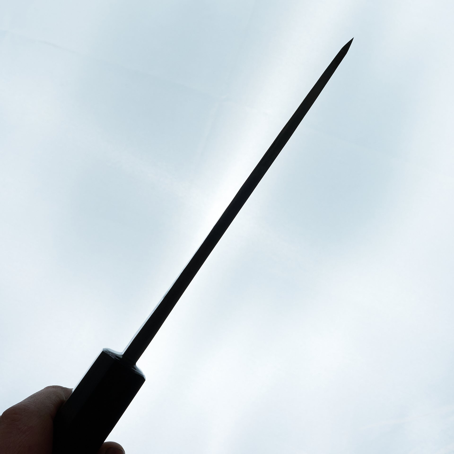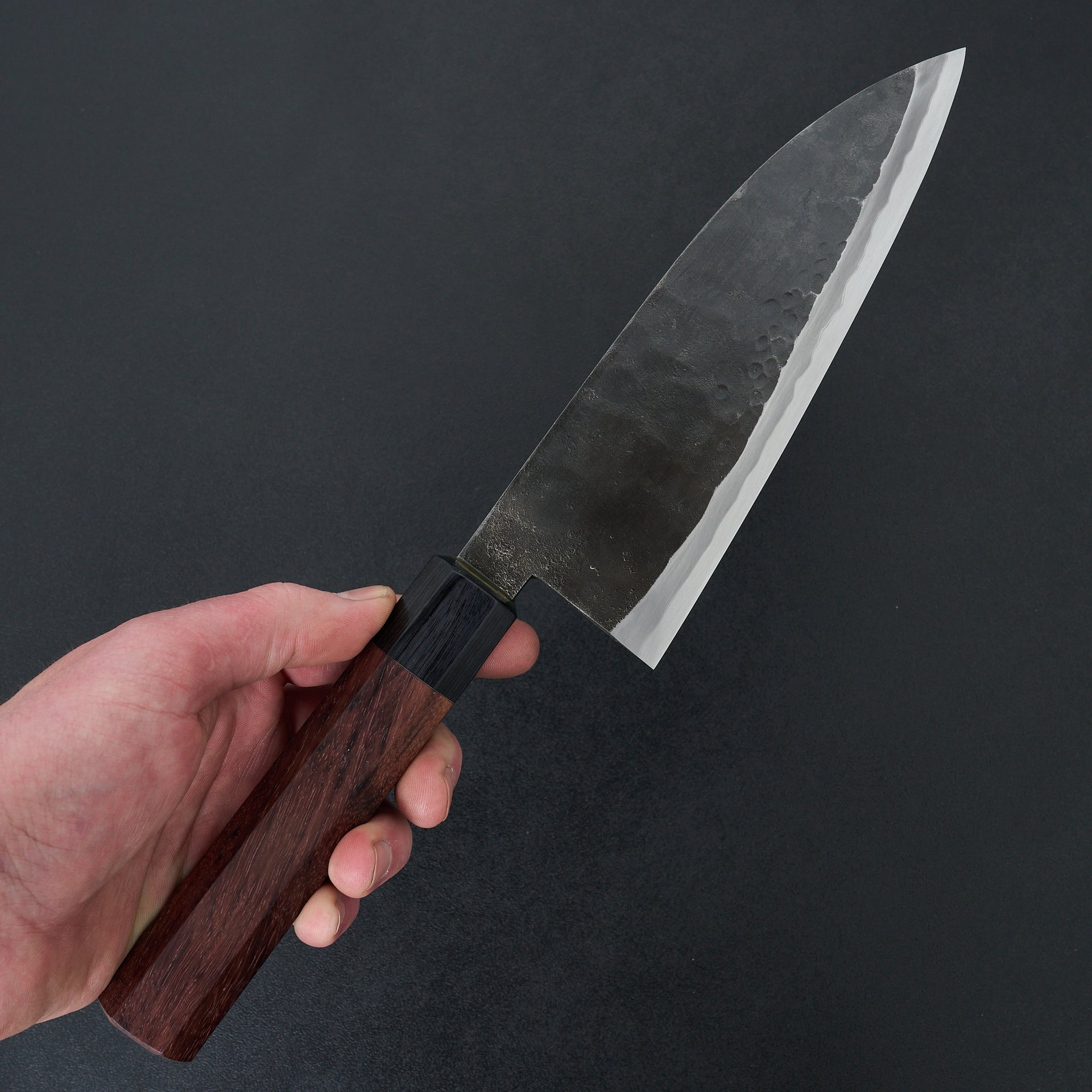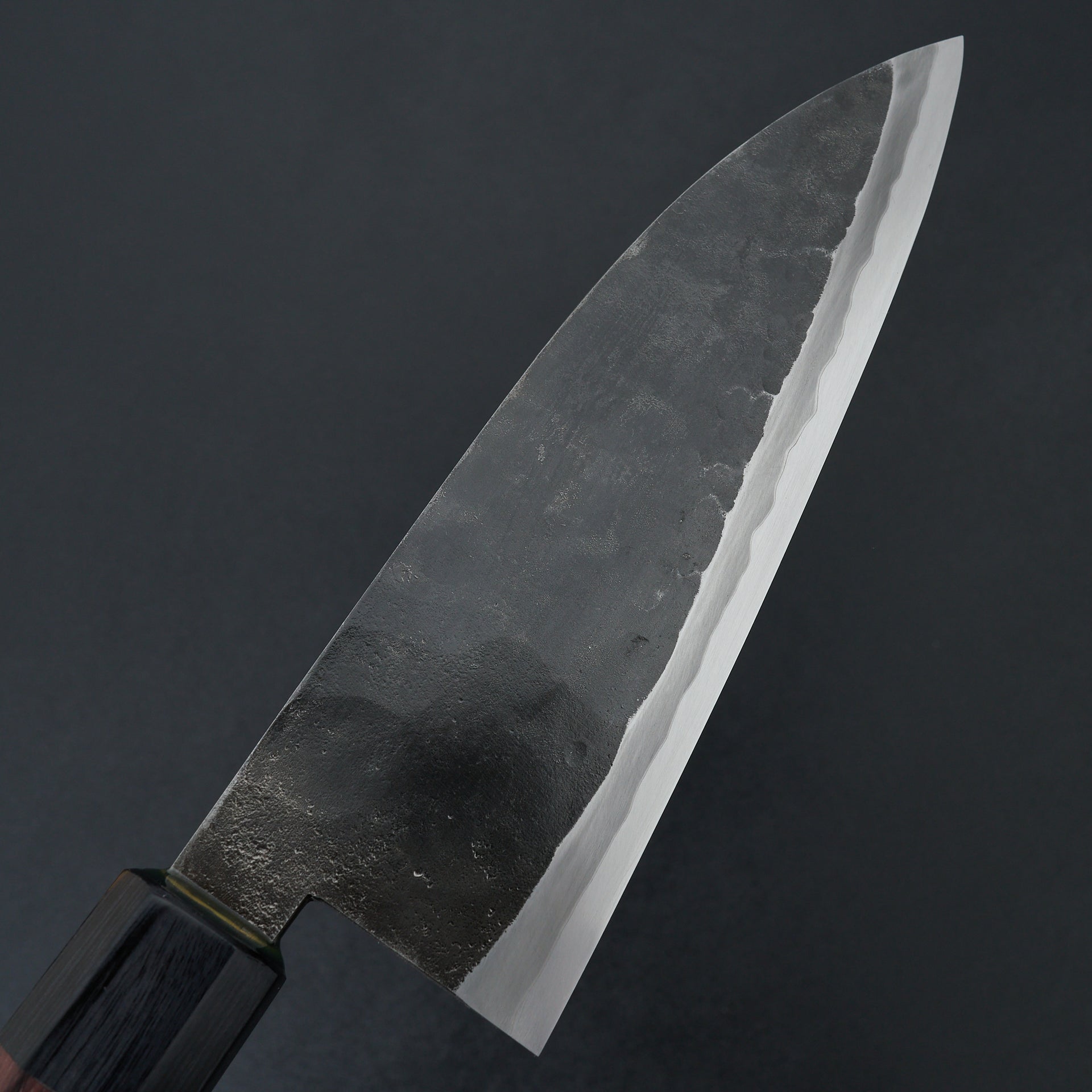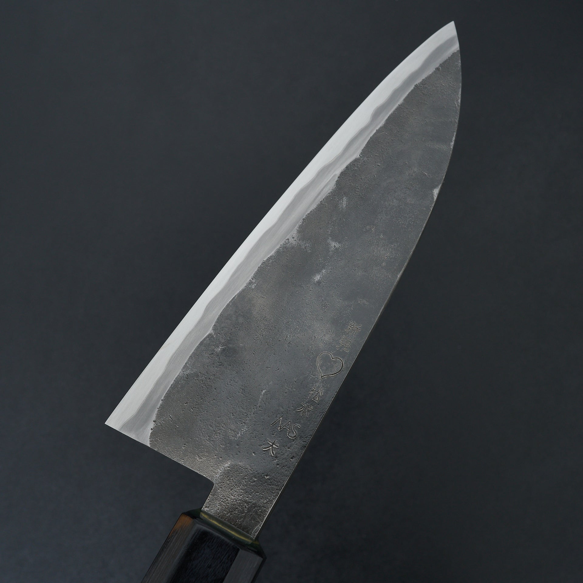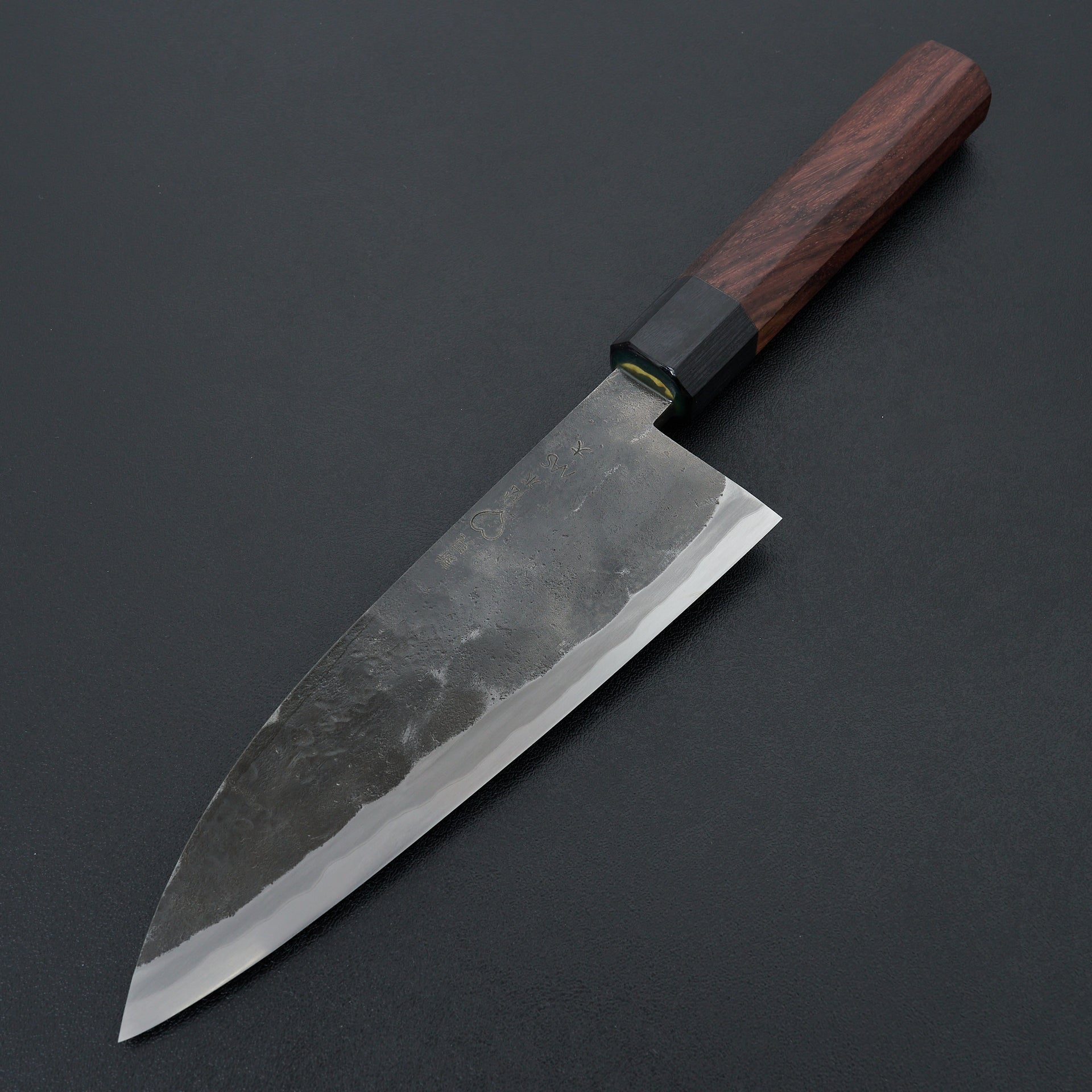 All of his blades are hand forged from Aogami Super Steel and are cladded in stainless (NAS) making these knives very low maintenance. Meticulous heat treatment of the blades helps create amazing edge retention, performance and strength. These knives are thin and lightweight but very balanced, making all of your tasks in the kitchen a complete breeze. All of Takeda's knives are double bevel with a 50/50 grind, making them user friendly to both right or left handed users. The handle is made of maple and fitted with a black pakka wood collar.