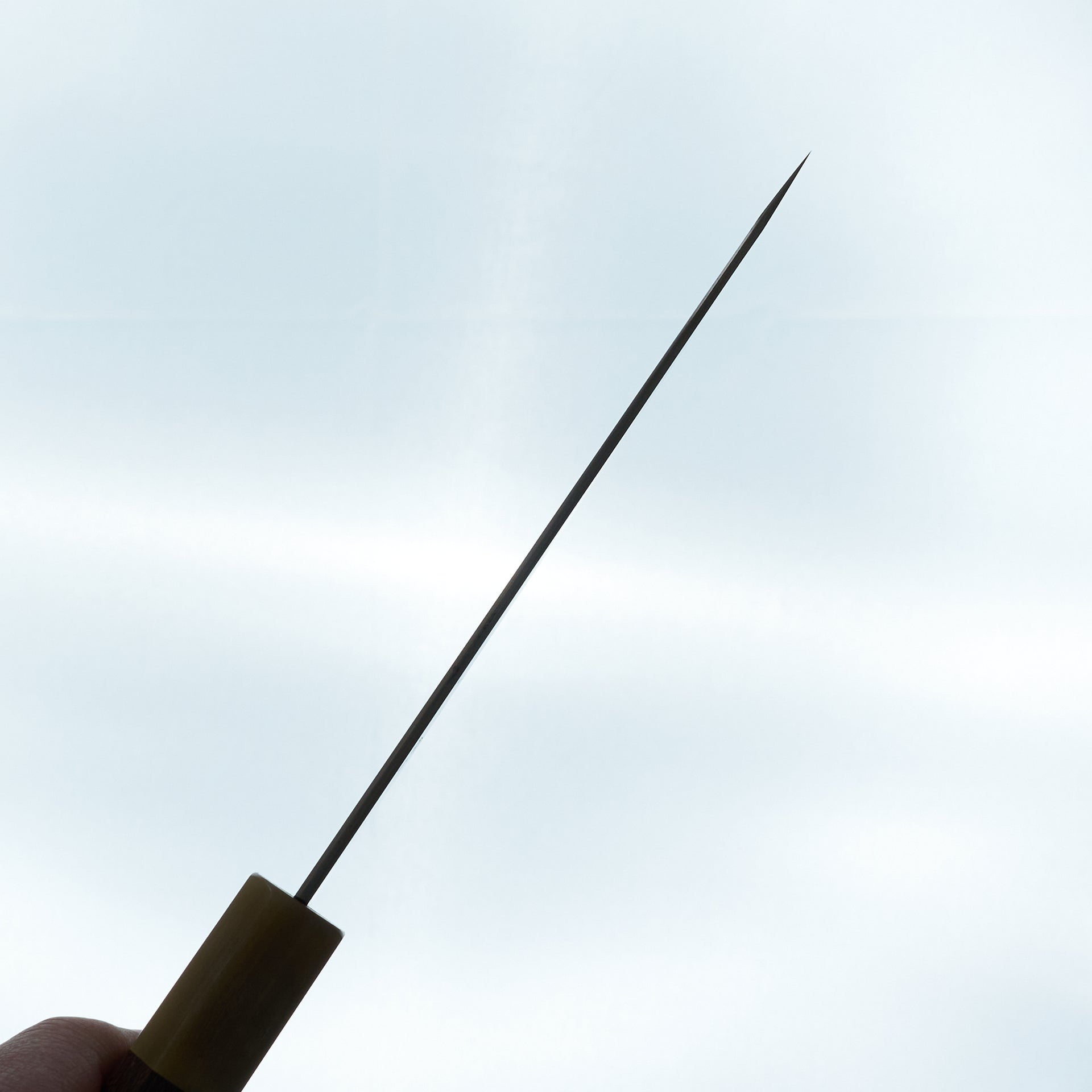 This way of finishing creates the dark and beautiful Kurouchi finish found on this special line. While both types of Kurouchi finishes can fade over time, the etching technique used by sharpener may fade faster.