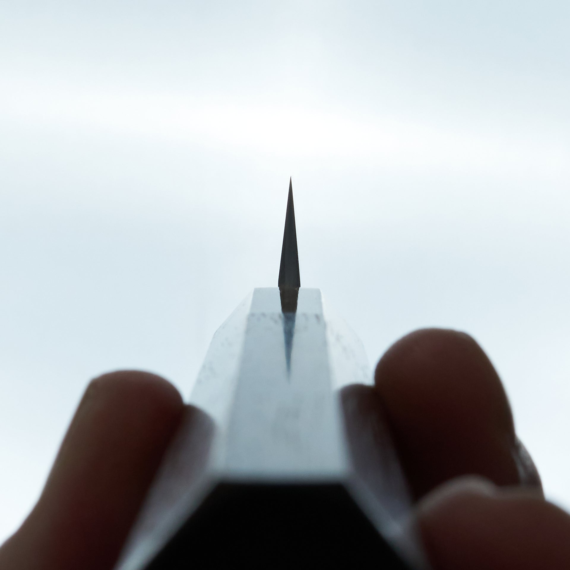Kyuzo’s father Heihachi is one of the busiest sharpeners in Sakai. Heihachi’s workshop room and corridor were always filled with knives waiting to be sharpened. Although Kyuzo initially worked under his father to learn the foundation of rough sharpening, eventually he became a student of Kambei, known as one of the best sharpeners in Sakai because he knew best how to sharpen wide double bevel knives. After a few years of training, he built his style based on both his father and Kambei’s respective styles. Today, Kyuzo is one of only a few people who can sharpen wide double bevels with a really good Shinogi-line in Sakai, one of the most challenging techniques in sharpening.