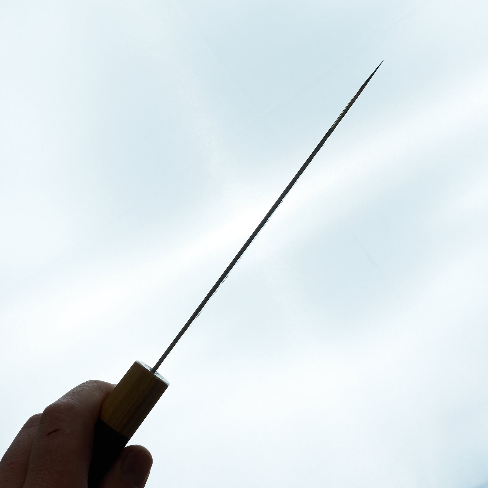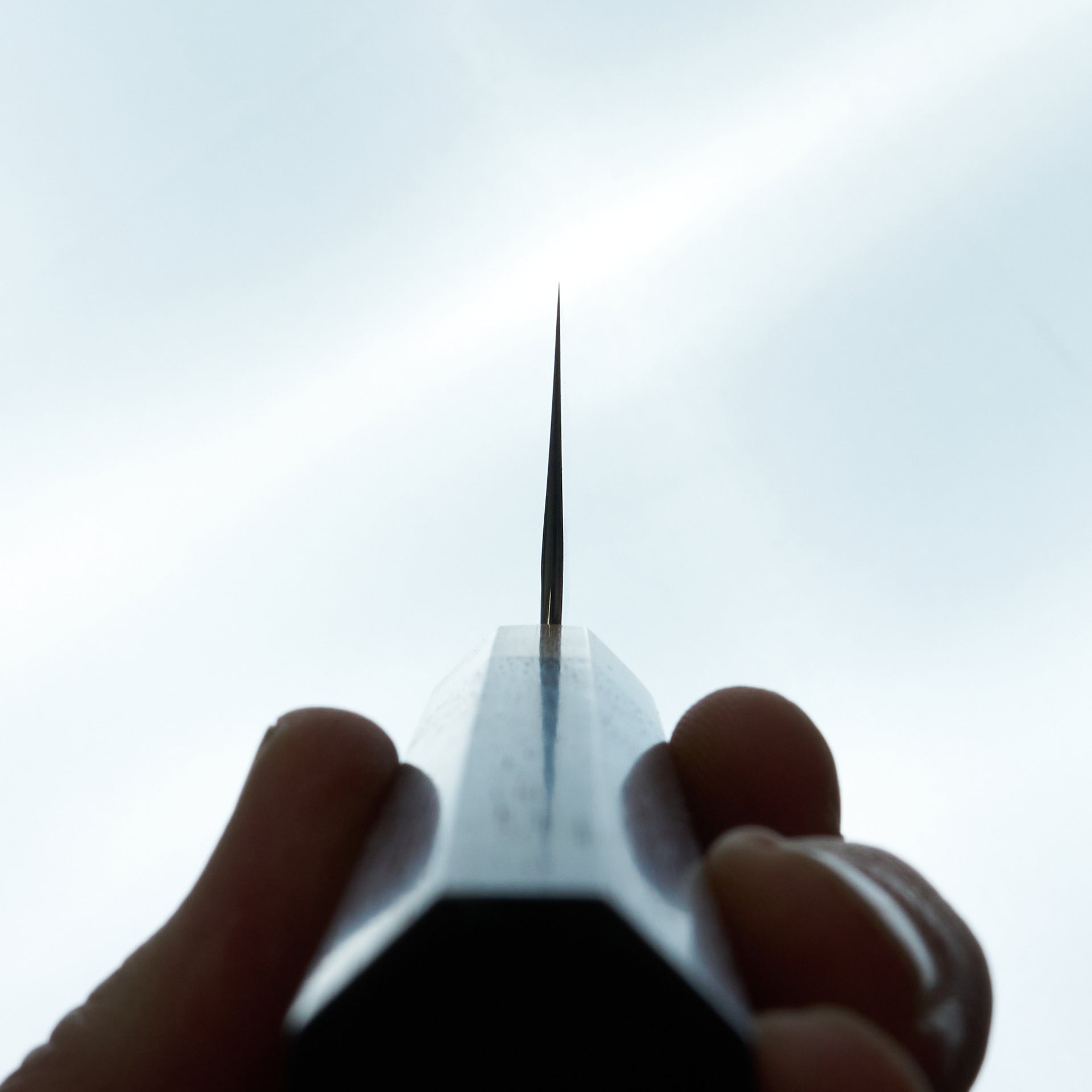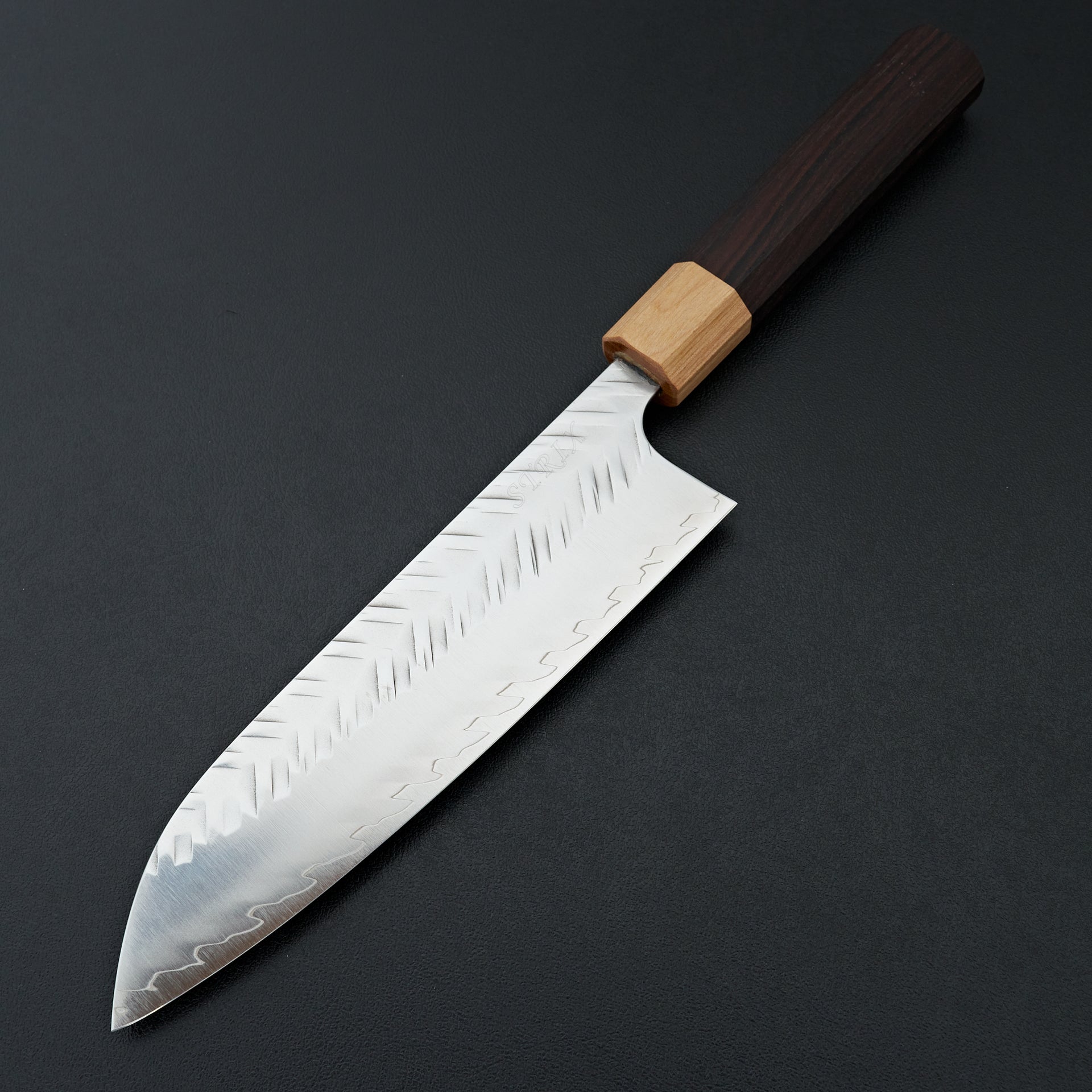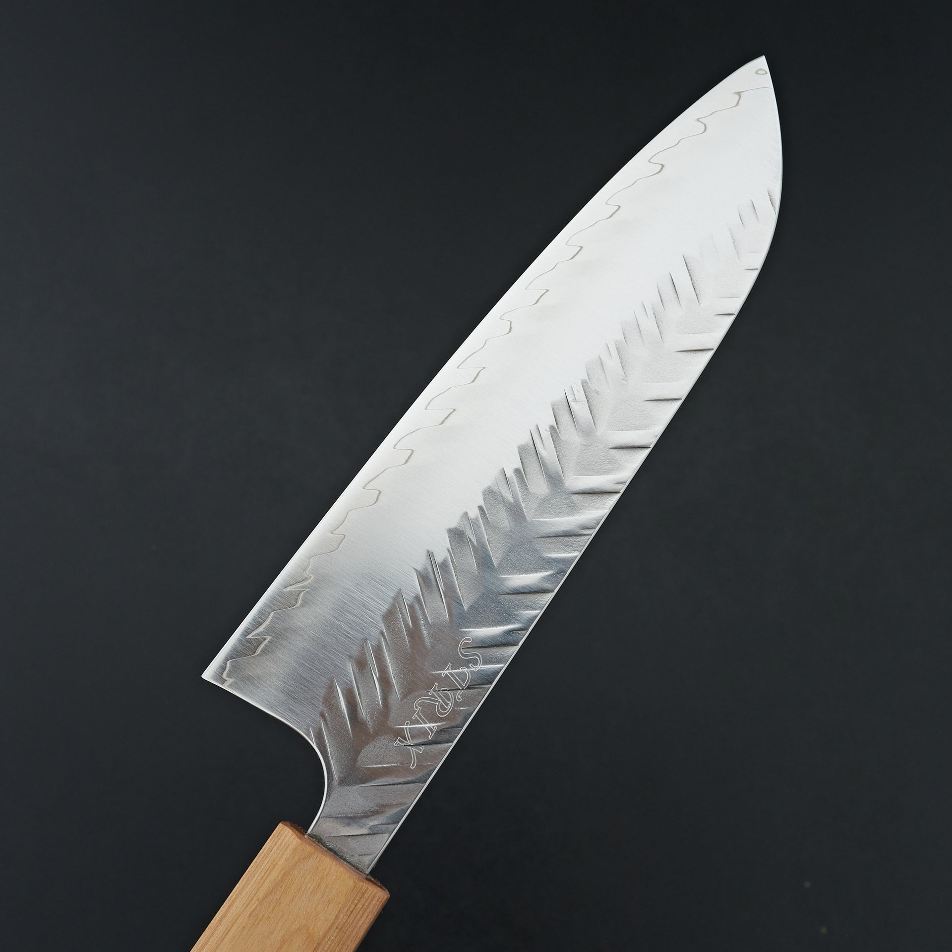 This series is made from SPG Strix laminated in soft stainless rated at 63 HRC. SPG Strix is a newer steel from Takefu steel that was made to be similar to SG2 but increased sharpenability and wear resistance. The blade face has a V shaped tsuchime pattern to relieve surface tension and increase food release. These blades are lightweight and very performance focused. The blade is fit with an octagonal rosewood and maple ferrule.
