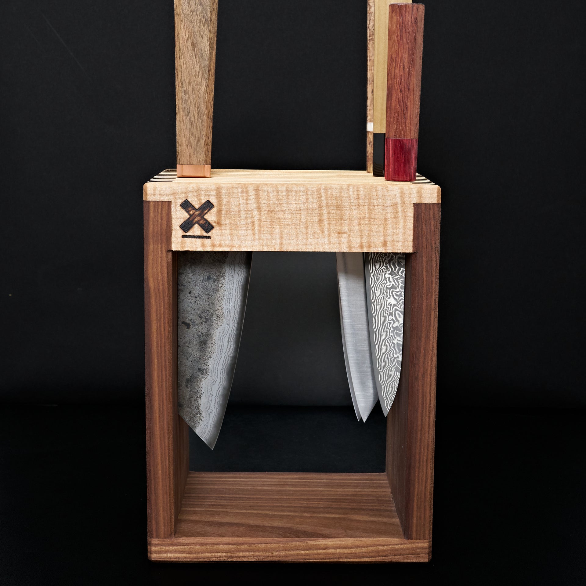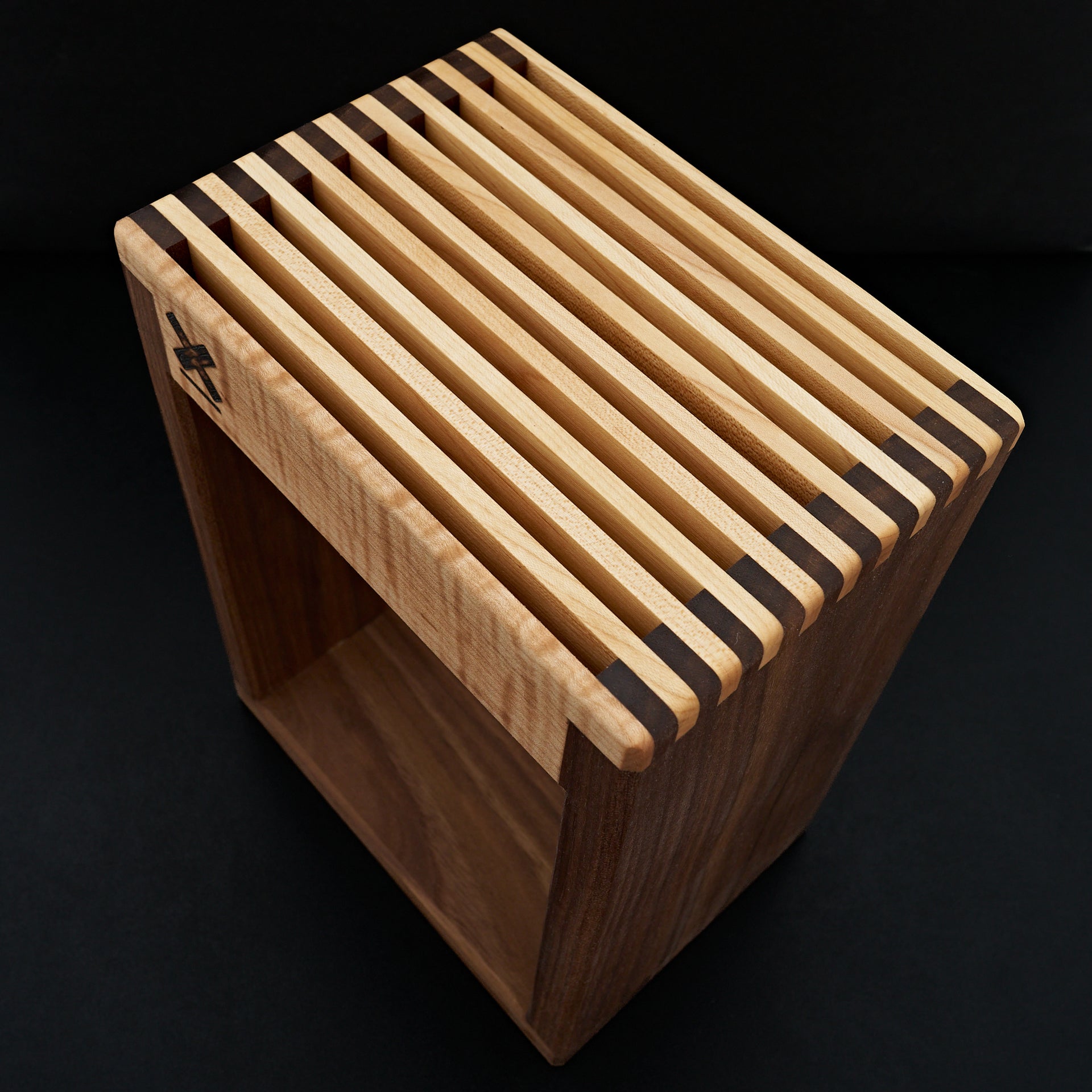 Jerome Fleischman is a Lyons, Colorado based woodworker and furniture maker. His signature knife rack is made from reclaimed walnut and maple. The walnut sides have magnets inlayed to help keep your knives in place, while the open design helps keep things clean unlike traditional wooden knife blocks. Can hold 10 (probably a lot more) knives comfortably. Sleek and beautiful piece to display all your knives safely.