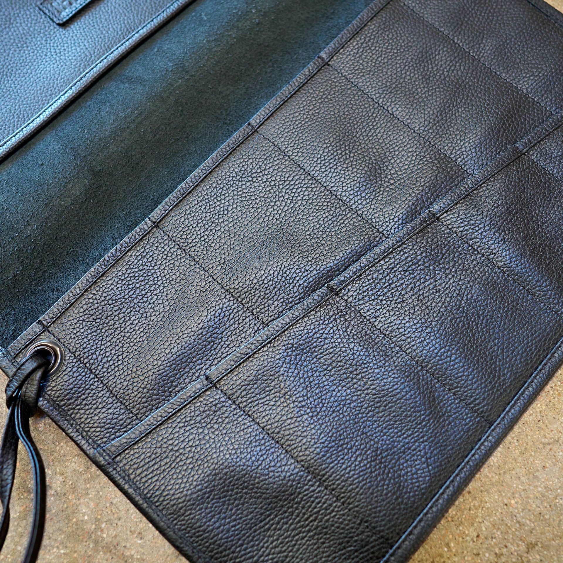 Large bottom row, asymmetric pockets measure 6.25" H - 3.25" H ranging in width to accommodate smaller knives and tools.
