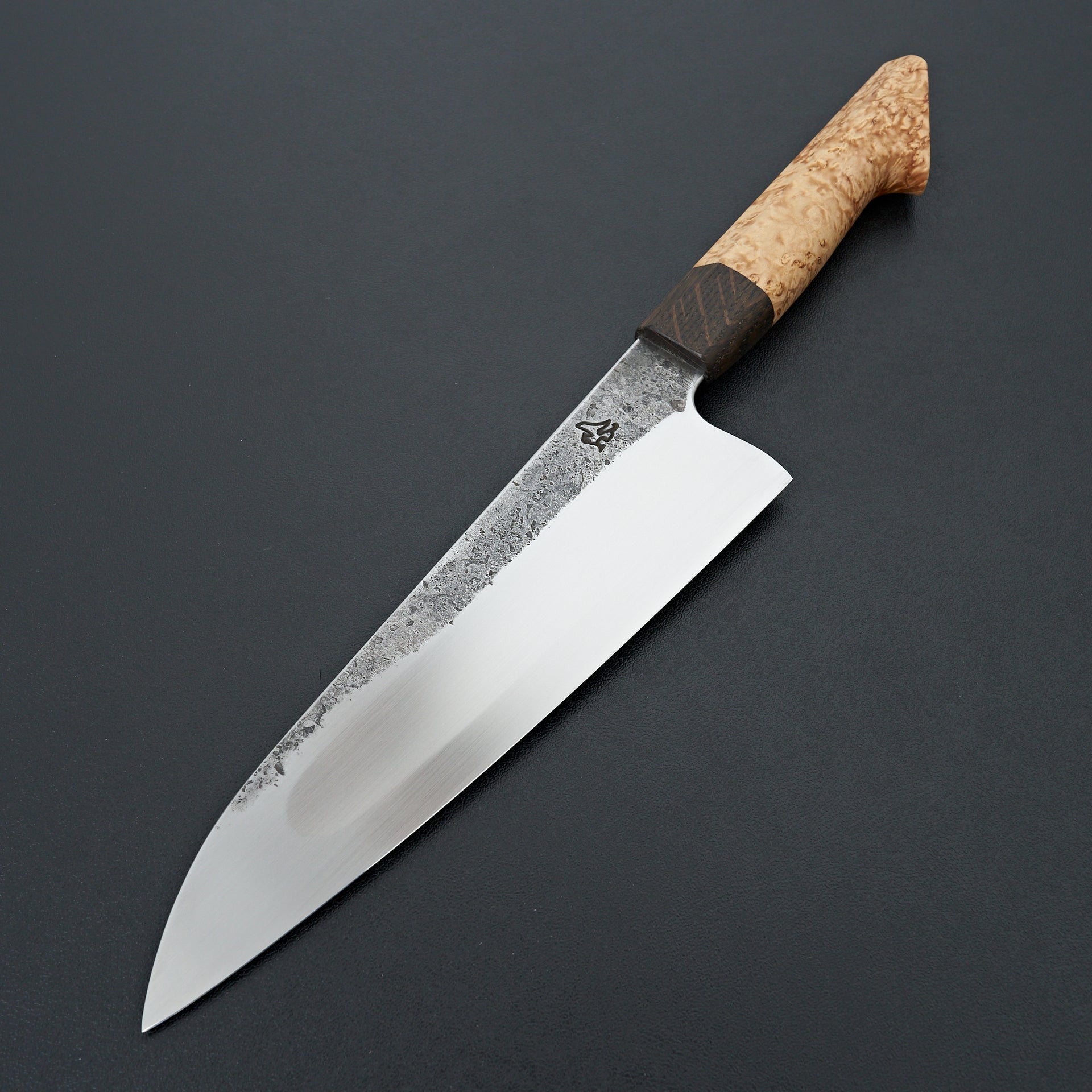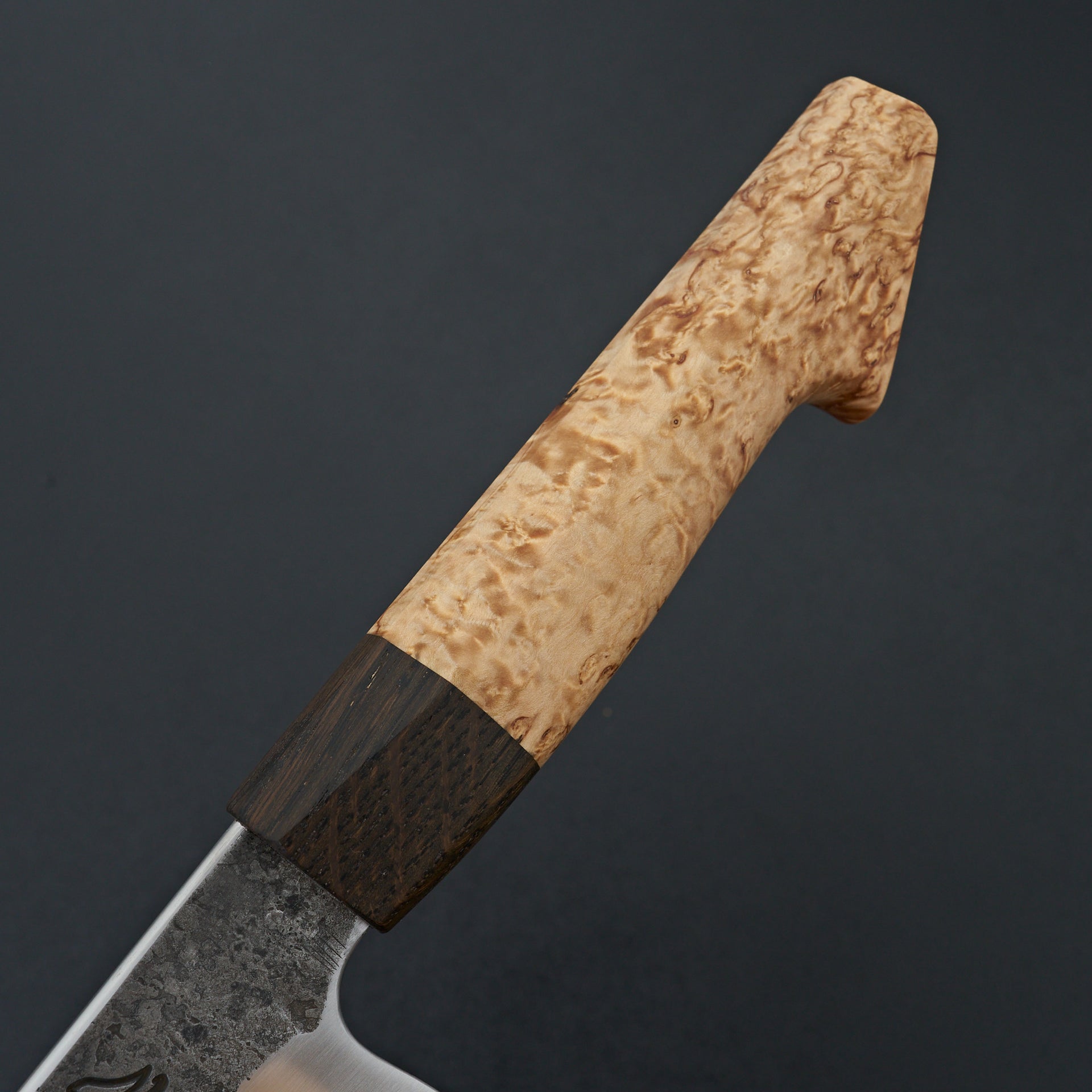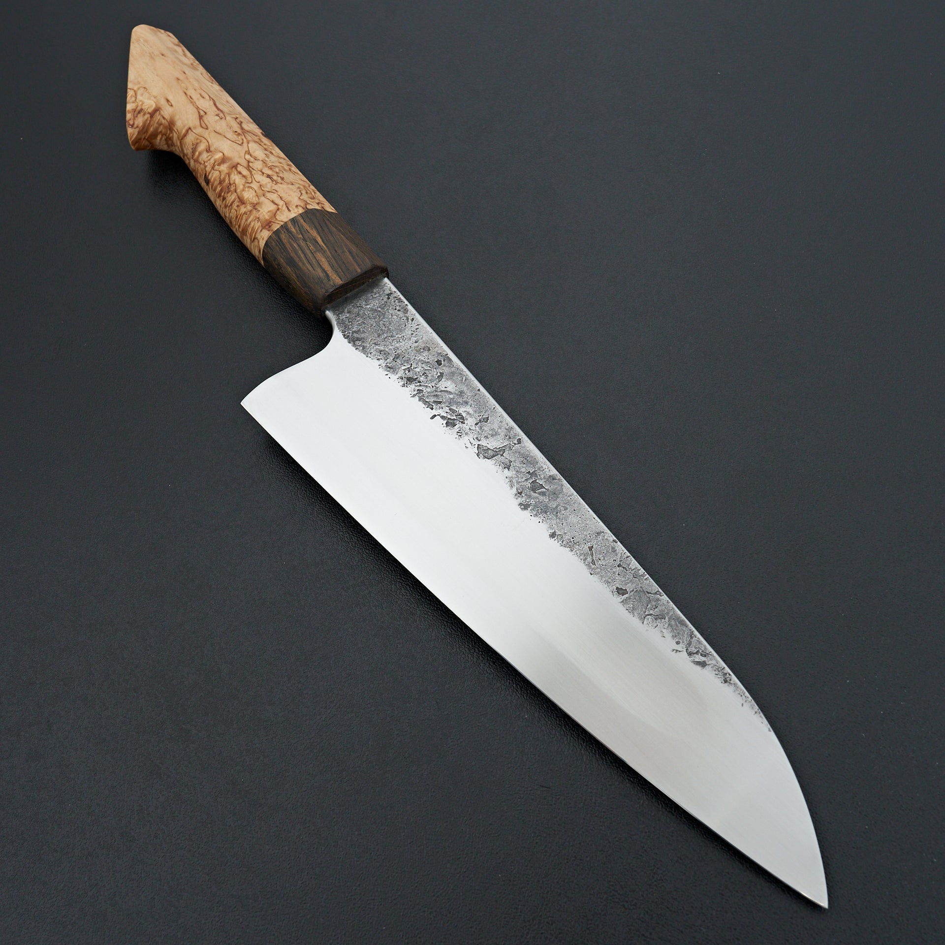 Lew Griffin is located in western Ireland and focuses on producing high quality kitchen cutlery with functional designs and geometry. This gyuto was hand forged from 52100 high carbon mono steel finished with kurouchi and natural texture from forging. Lew is an S-grind specialist, creating a perfect hollow area above the cutting edge to maximize food release and minimize drag during your cuts. The blade feels absolutely incredible in hand thanks to the hybrid Japanese style handle handle. This handle was crafted from Curly Birch with a black oak ferrule.