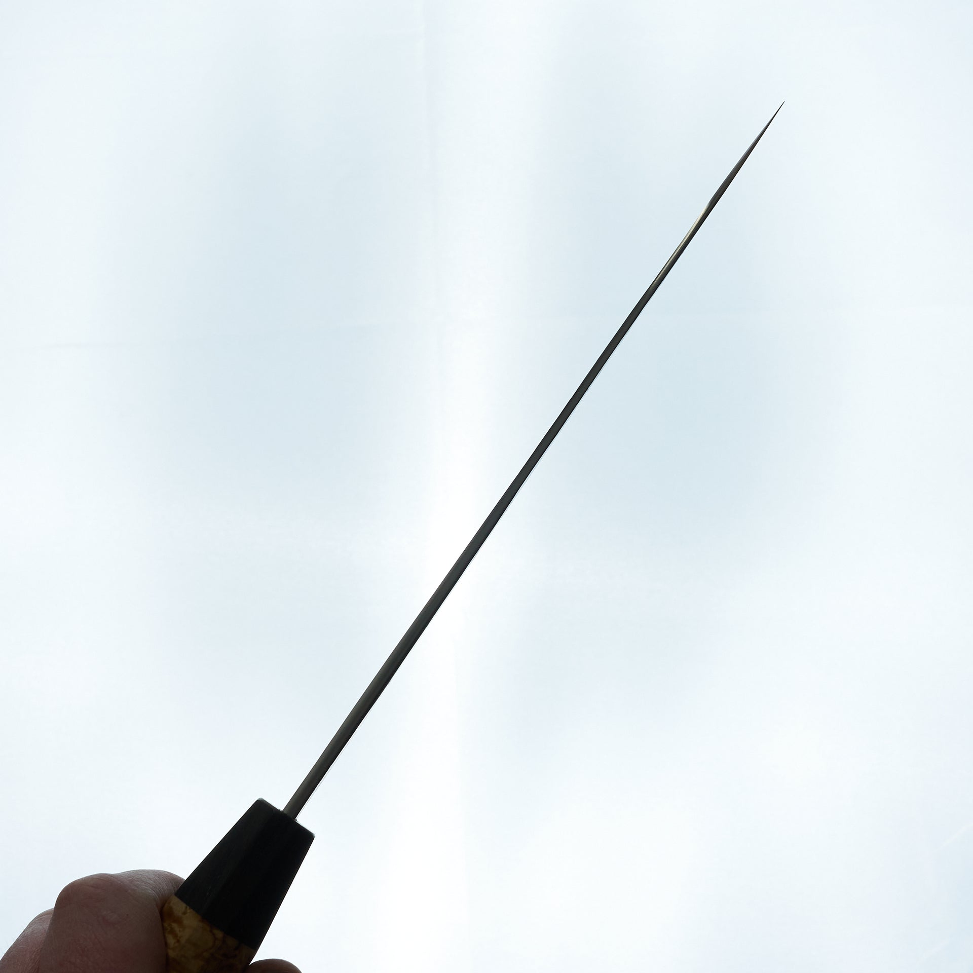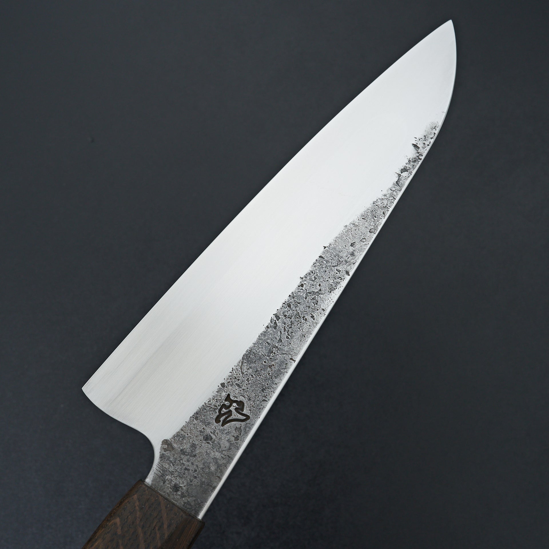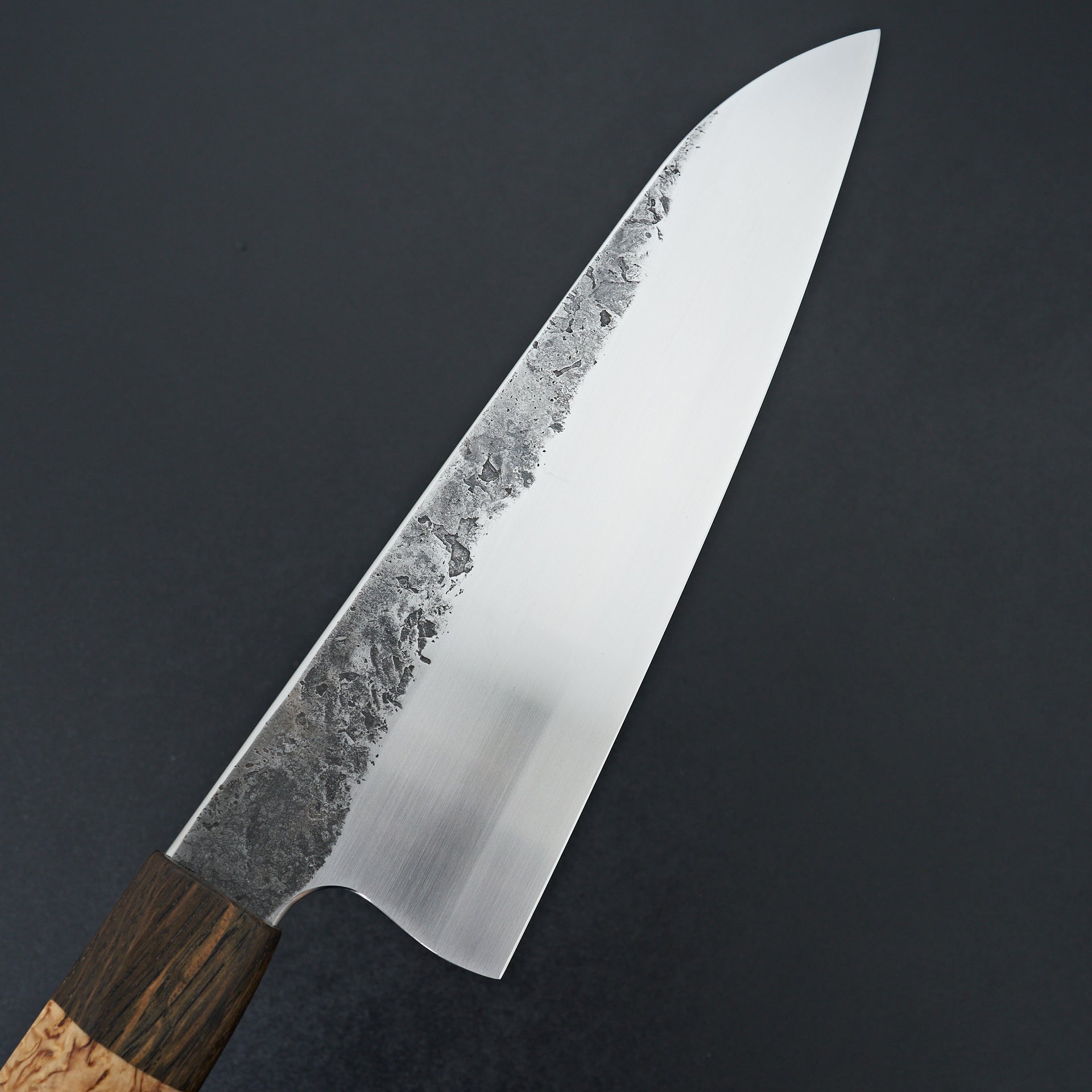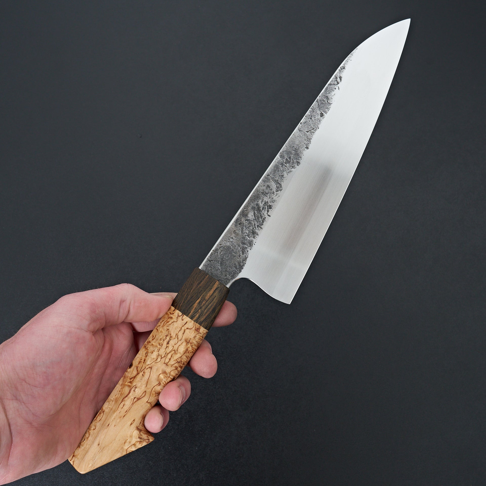 Lew Griffin is located in western Ireland and focuses on producing high quality kitchen cutlery with functional designs and geometry. This gyuto was hand forged from 52100 high carbon mono steel finished with kurouchi and natural texture from forging. Lew is an S-grind specialist, creating a perfect hollow area above the cutting edge to maximize food release and minimize drag during your cuts. The blade feels absolutely incredible in hand thanks to the hybrid Japanese style handle handle. This handle was crafted from Curly Birch with a black oak ferrule.
