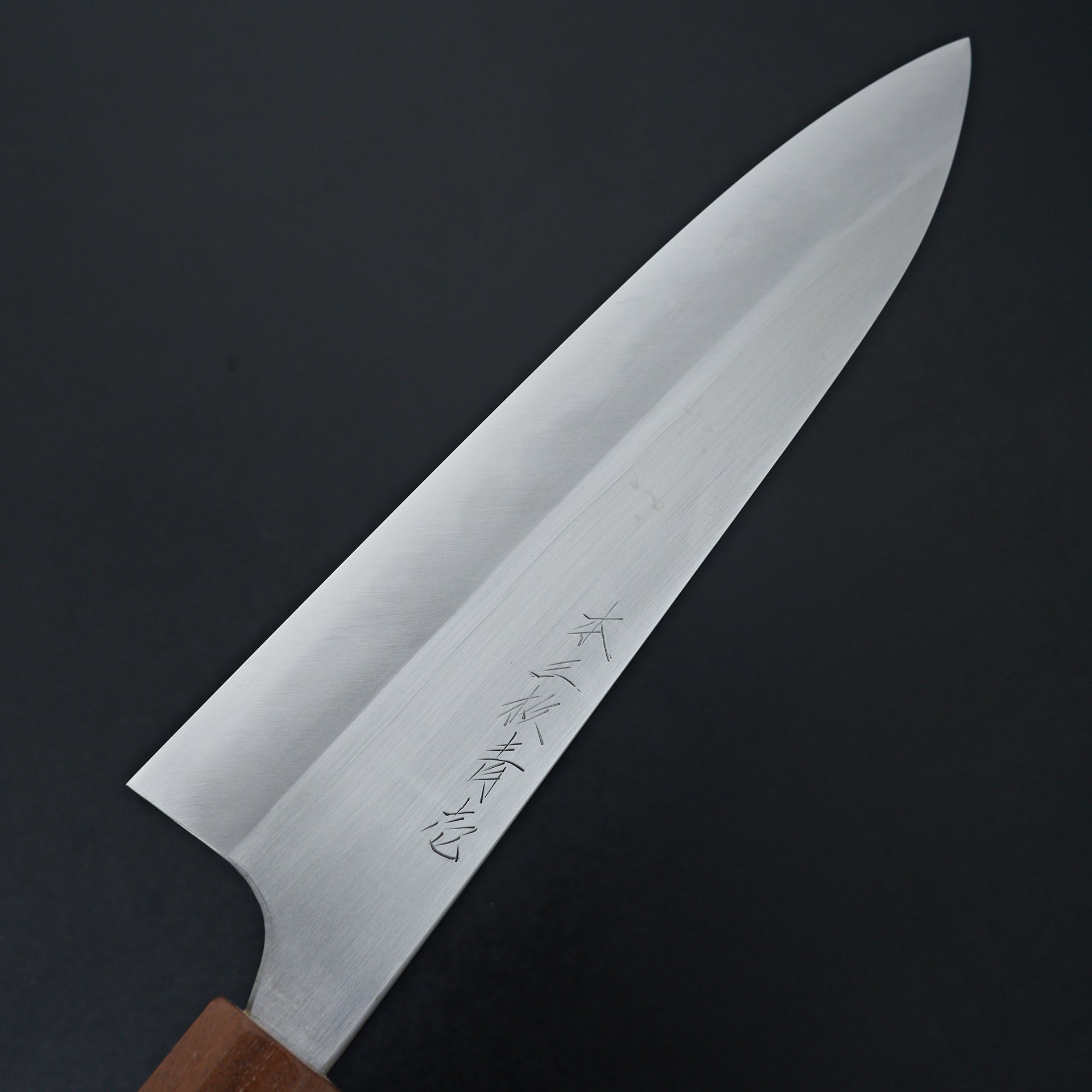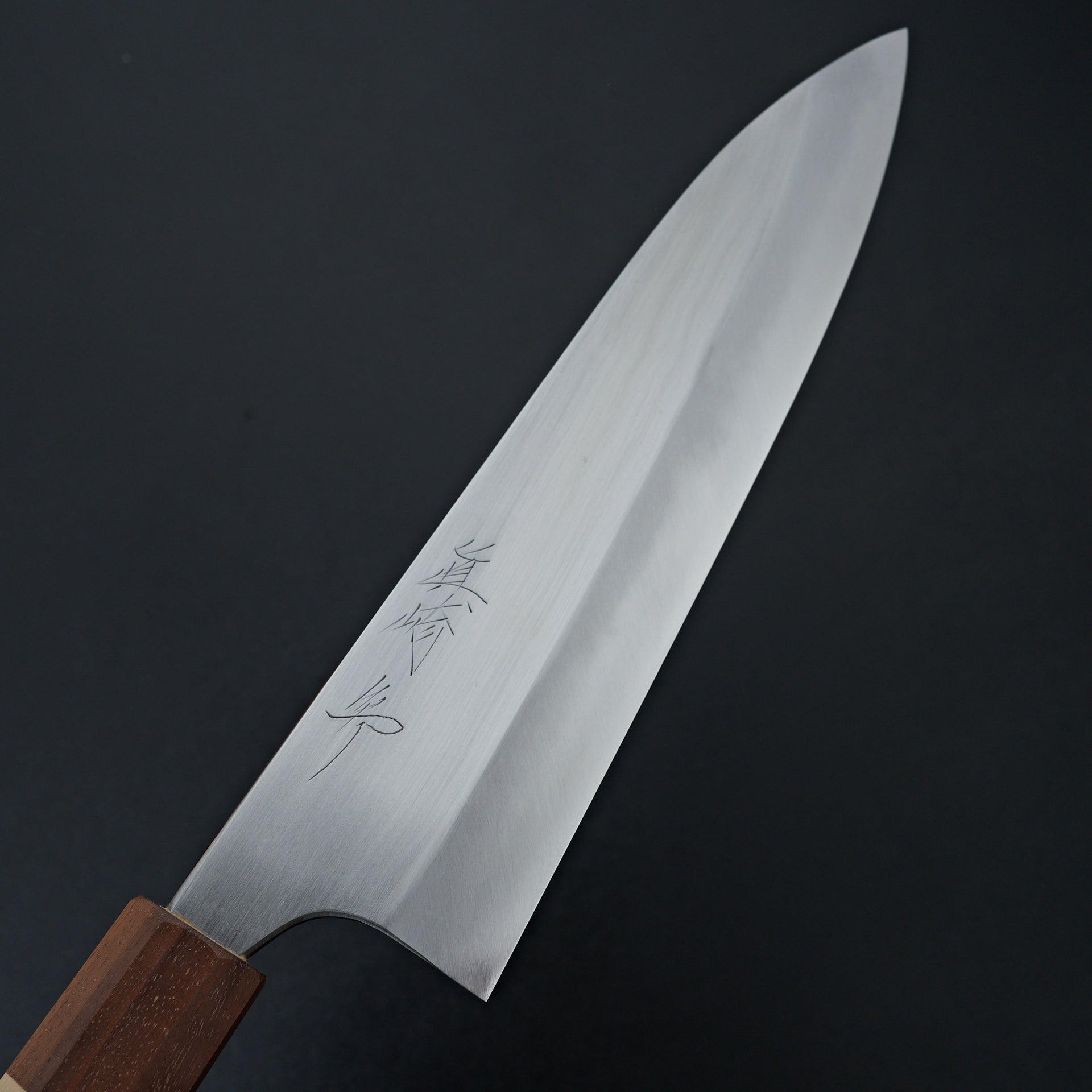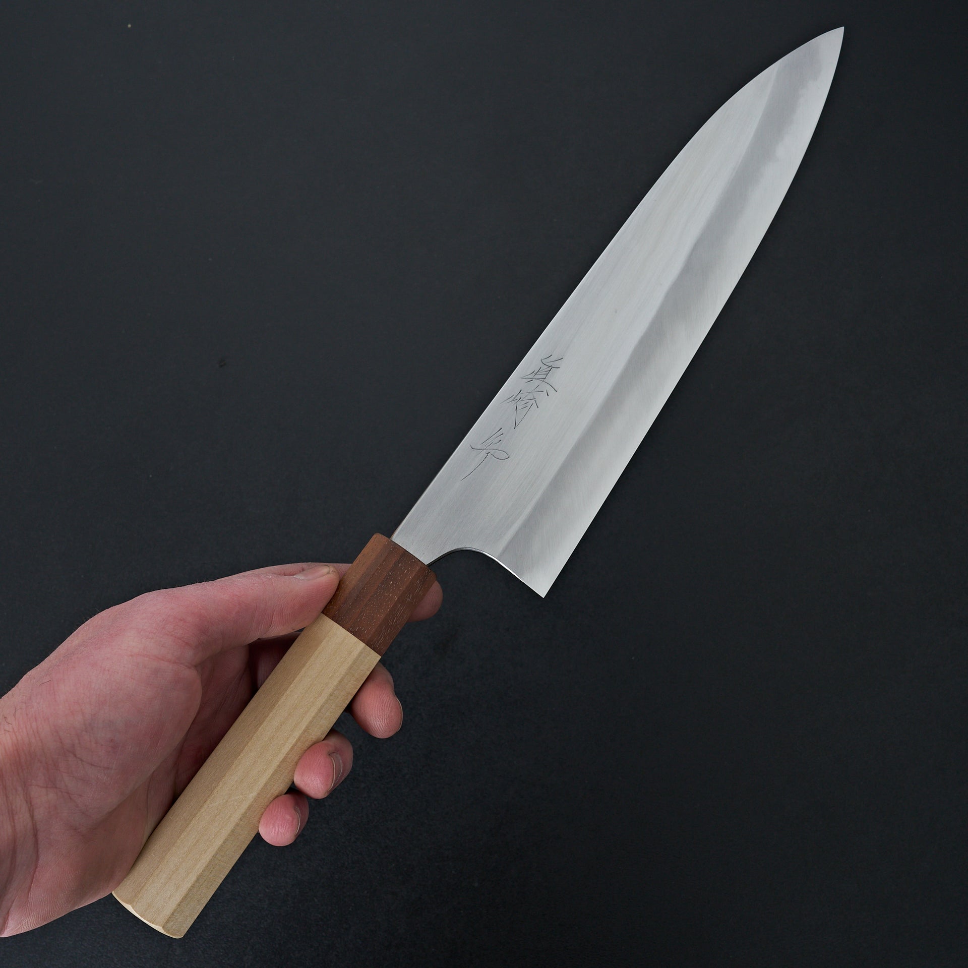 This series is made from Aogami #1 steel hand laminated in soft iron and water quenched to 64-65 HRC. This blade is migaki finished with kasumi on the bevels to show contrast between the steels. The bevels are finished by hand on Japanese whetstones to ensure an even grind and geometry. The forged distal taper is quite impressive and has a nice progressive thinness towards the tip. Lightly convexed bevels and very thin behind the cutting edge. The octagonal handle is made from magnolia and walnut ferrule.