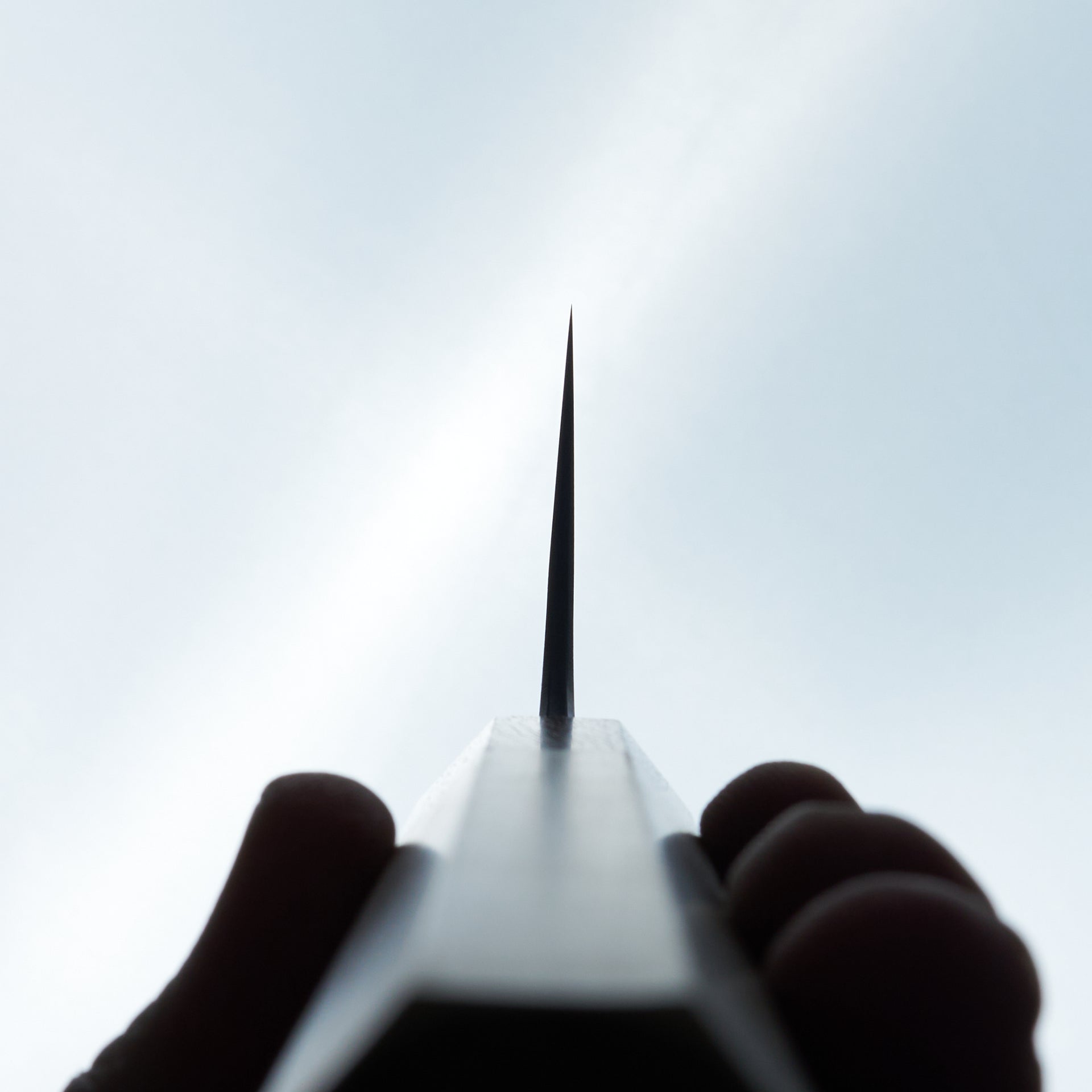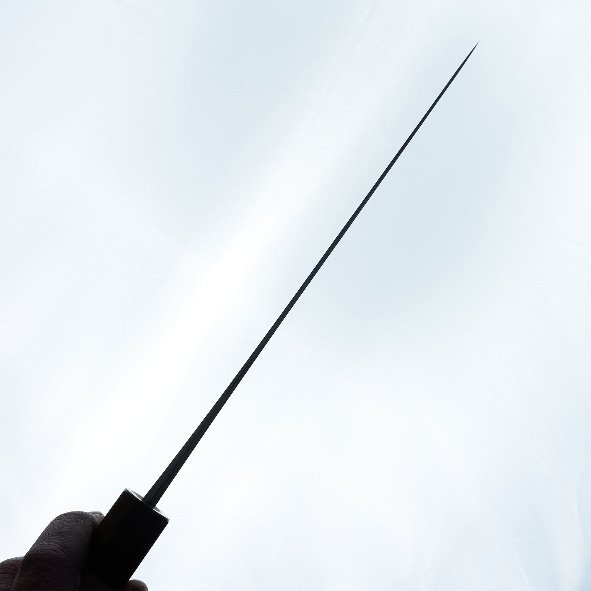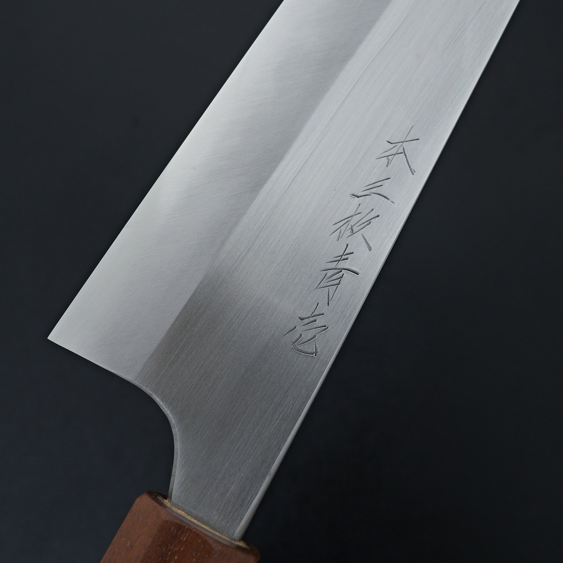 This series is made from Aogami #1 steel hand laminated in soft iron and water quenched to 64-65 HRC. This blade is migaki finished with kasumi on the bevels to show contrast between the steels. The bevels are finished by hand on Japanese whetstones to ensure an even grind and geometry. The forged distal taper is quite impressive and has a nice progressive thinness towards the tip. Lightly convexed bevels and very thin behind the cutting edge. The octagonal handle is made from magnolia and walnut ferrule.