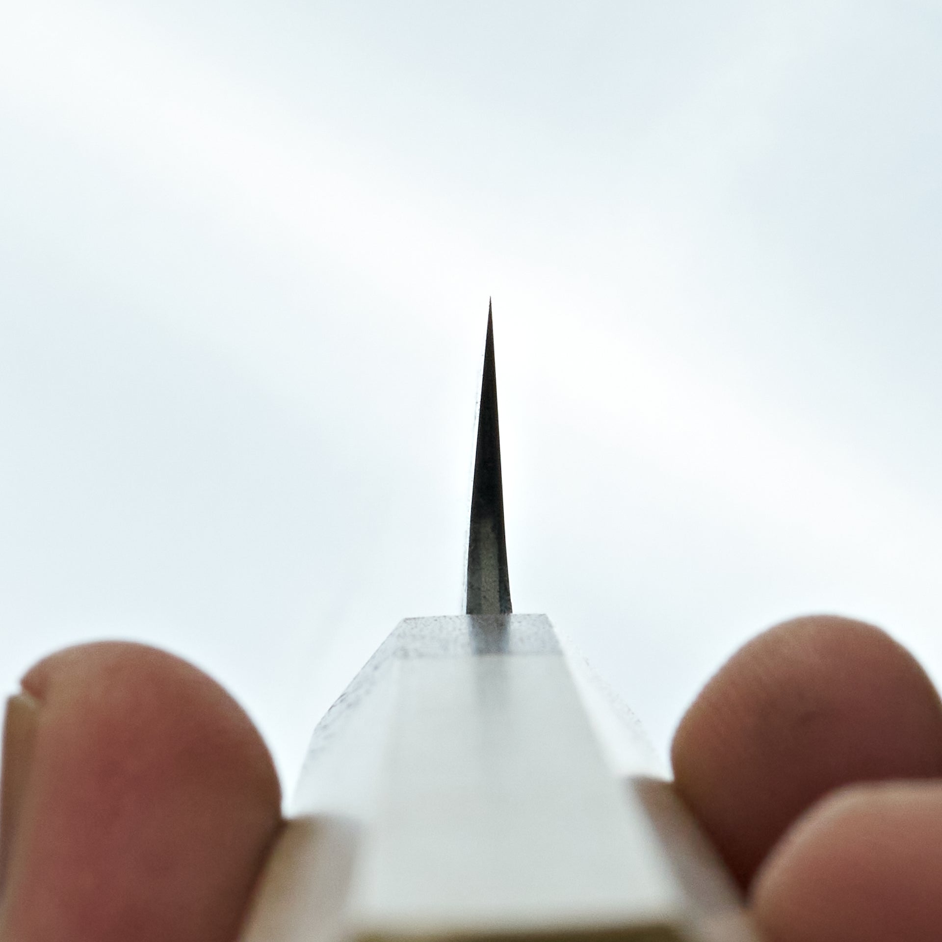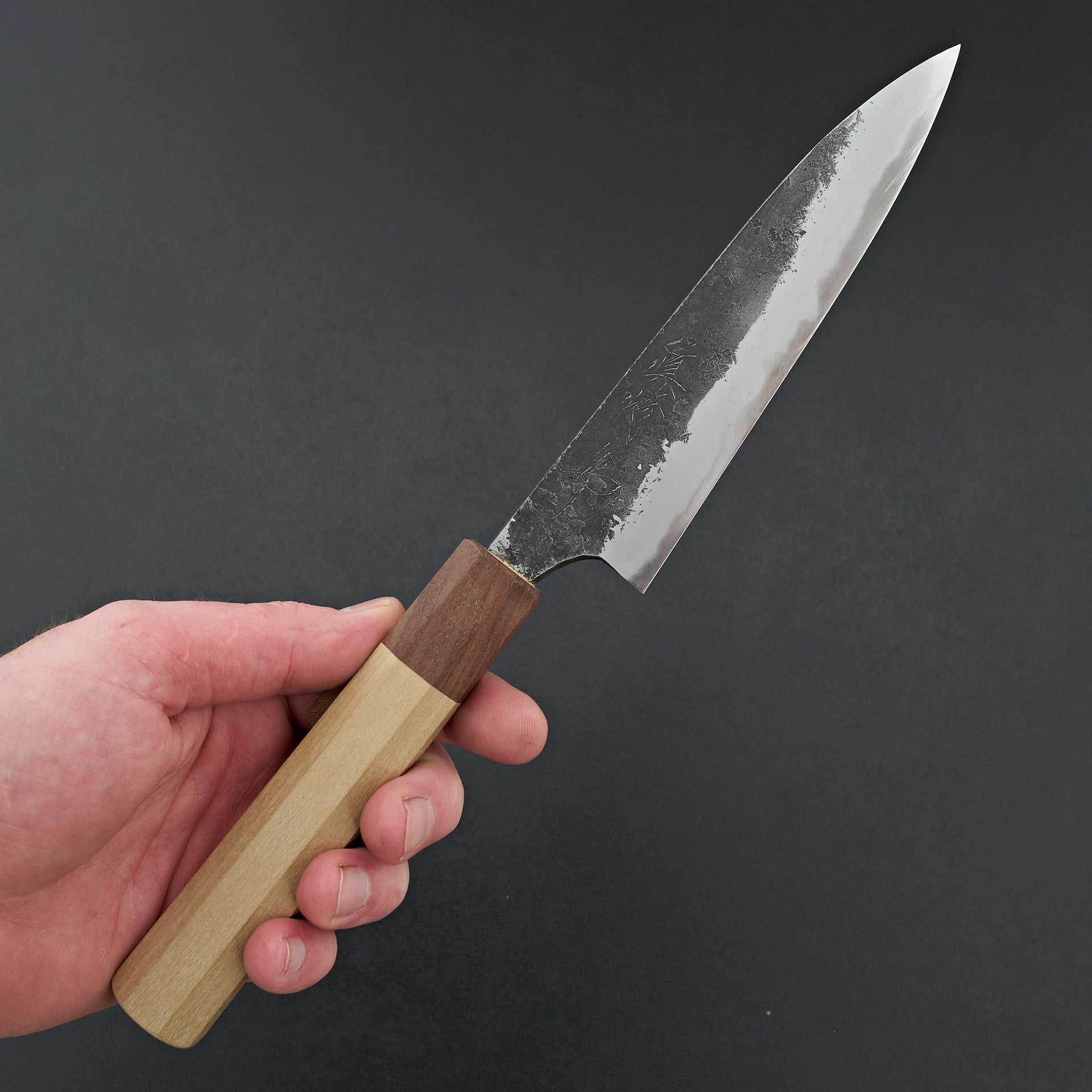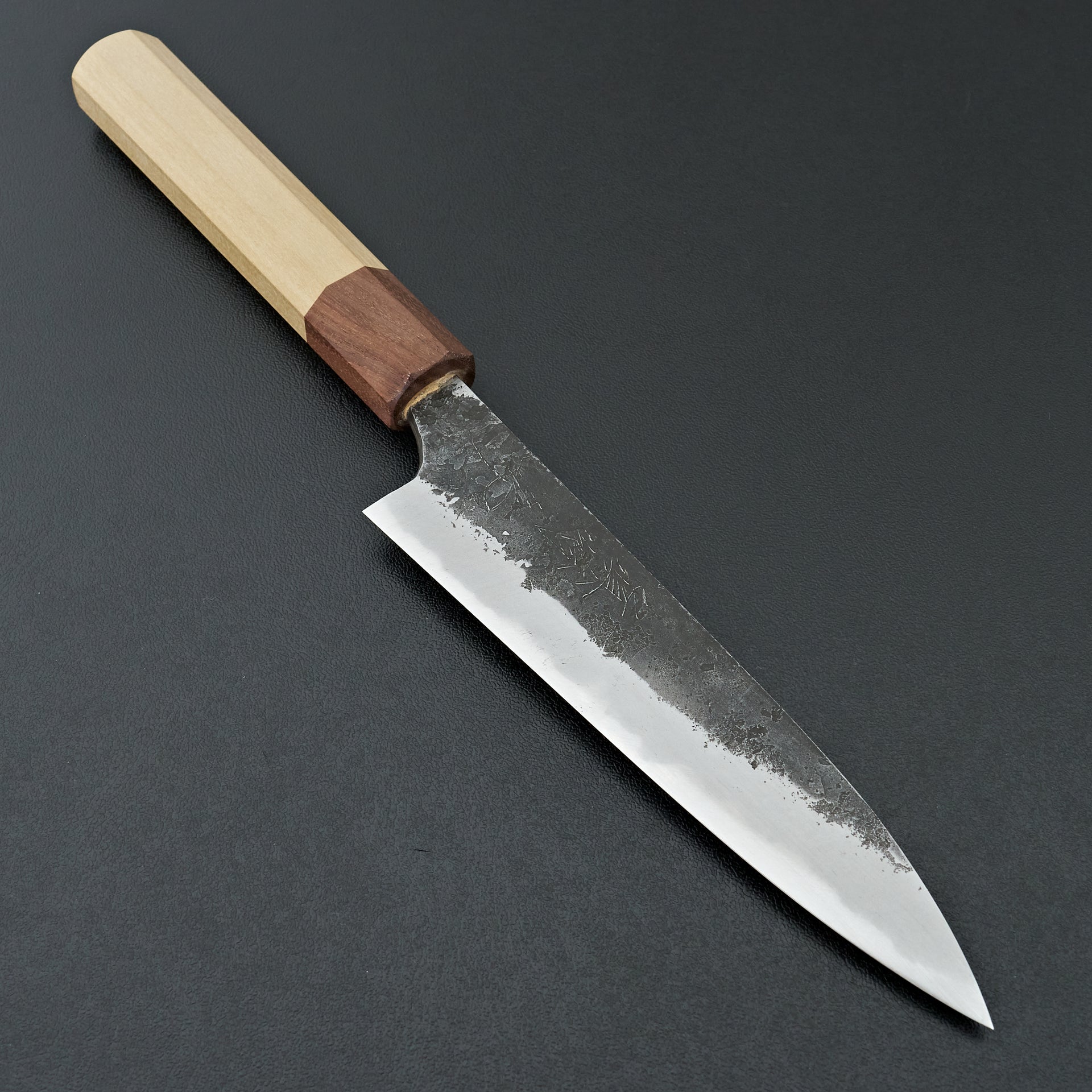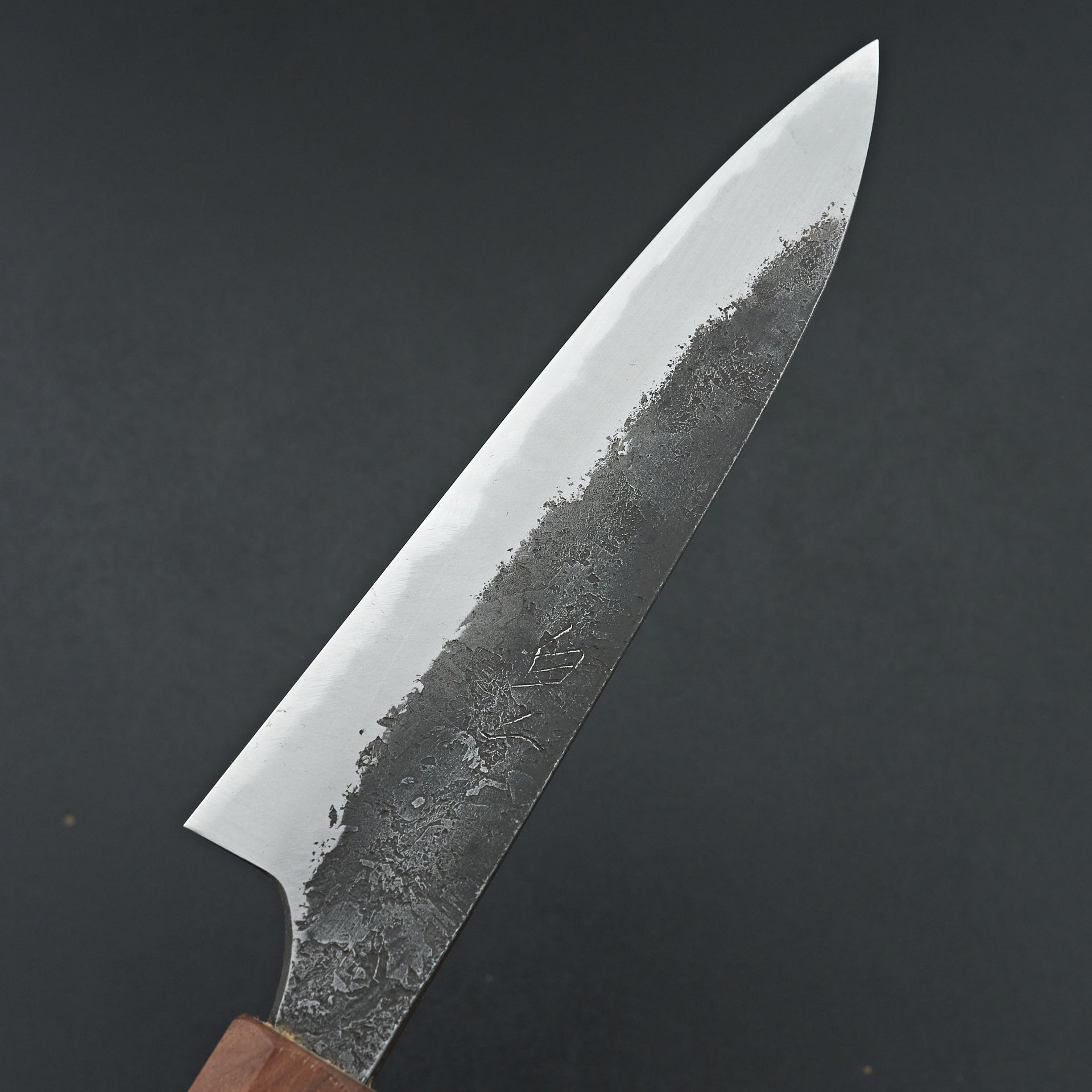 He focuses primarily on forging Shirogami (White) #2 carbon steel cladded in iron. The nashiji kurouchi displays all of the character and detail that happens during the forging process. The bevels are finished by hand on Japanese whetstones to ensure an even grind and geometry. The forged distal taper is quite impressive and has a nice progressive thinness towards the tip. Lightly convexed bevels and very thin behind the cutting edge. The octagonal handle is made from magnolia and walnut ferrule.