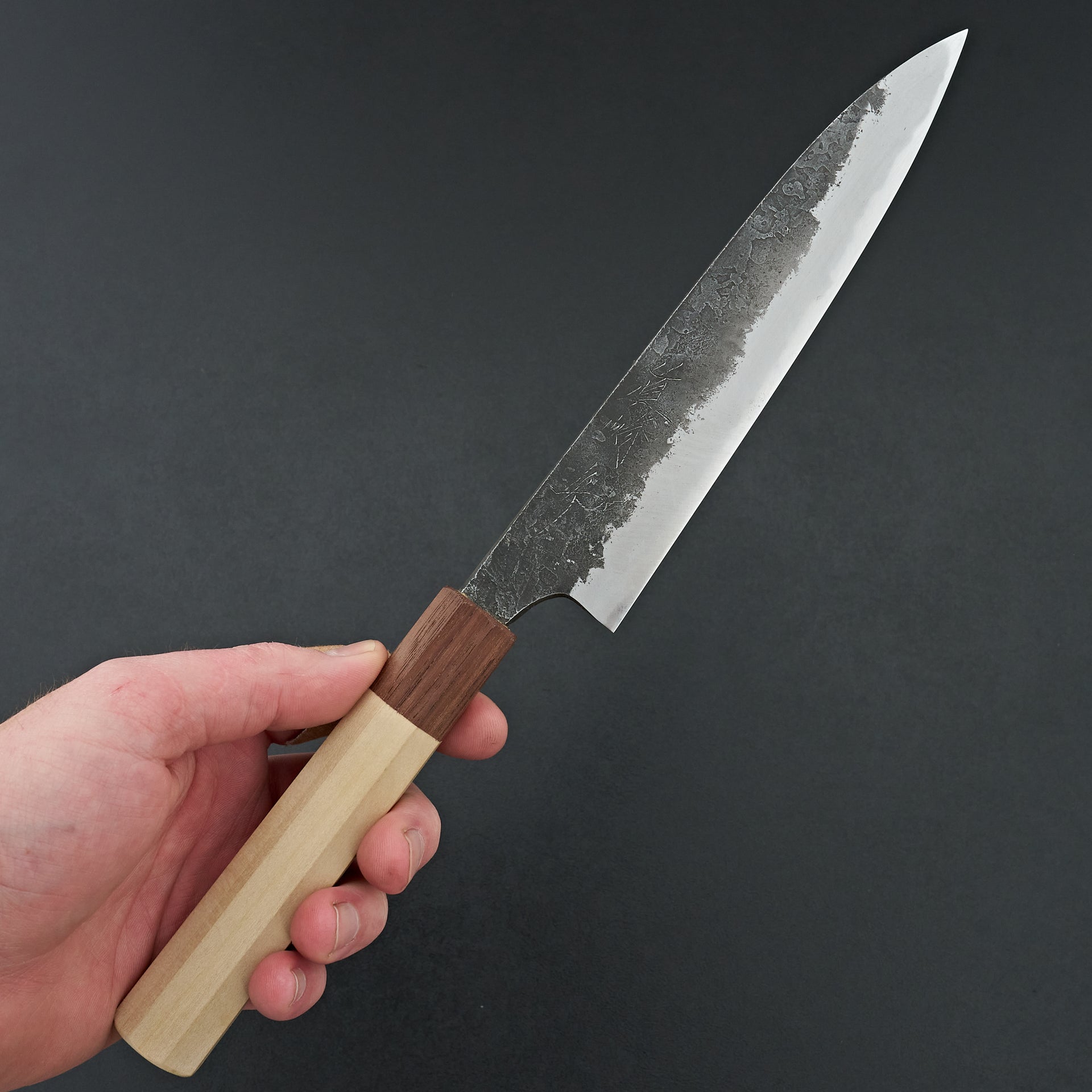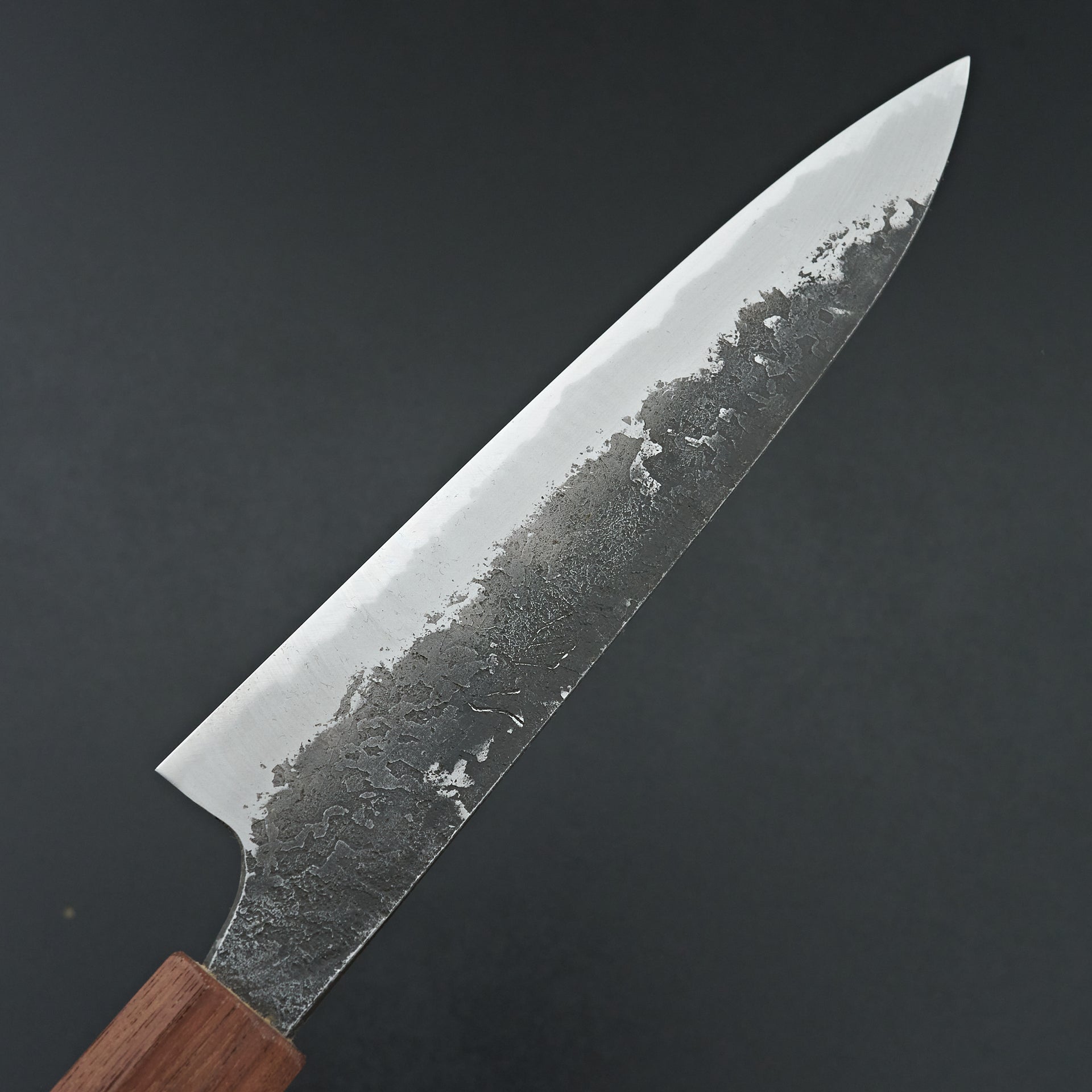 He focuses primarily on forging Shirogami (White) #2 carbon steel cladded in iron. The nashiji kurouchi displays all of the character and detail that happens during the forging process. The bevels are finished by hand on Japanese whetstones to ensure an even grind and geometry. The forged distal taper is quite impressive and has a nice progressive thinness towards the tip. Lightly convexed bevels and very thin behind the cutting edge. The octagonal handle is made from magnolia and walnut ferrule.