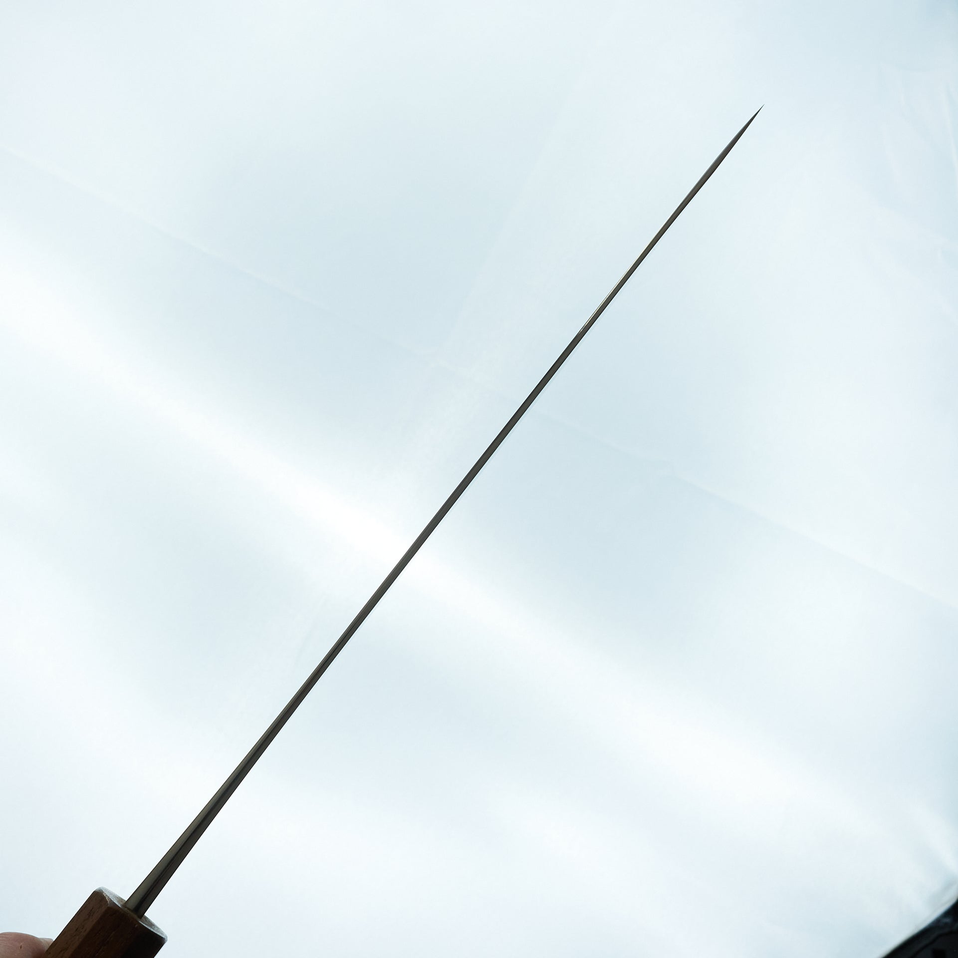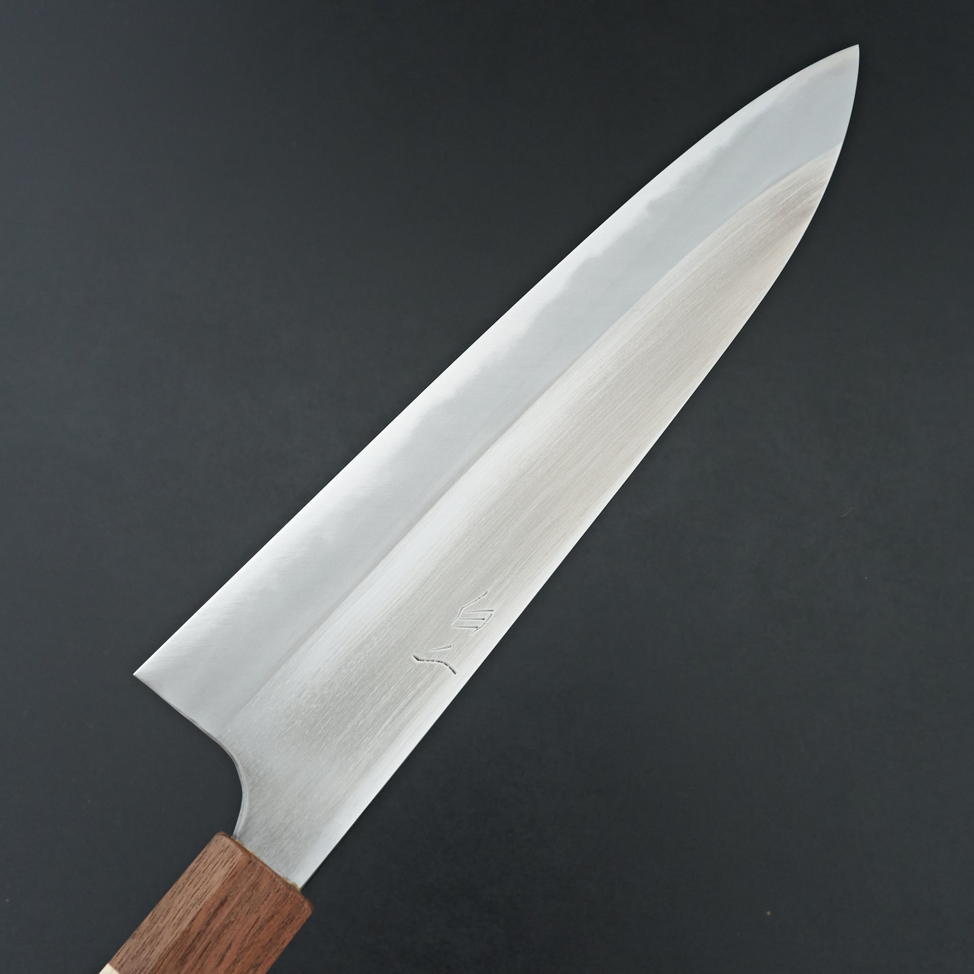 He focuses primarily on forging Shirogami (White) #2 carbon steel cladded in iron. The blade is migaki polished for ease of maintenance and cleaning in future. The bevels are finished by hand on Japanese whetstones to ensure an even grind and geometry. The forged distal taper is quite impressive and has a nice progressive thinness towards the tip. Lightly convexed bevels and very thin behind the cutting edge. The octagonal handle is made from keyaki and horn ferrule.