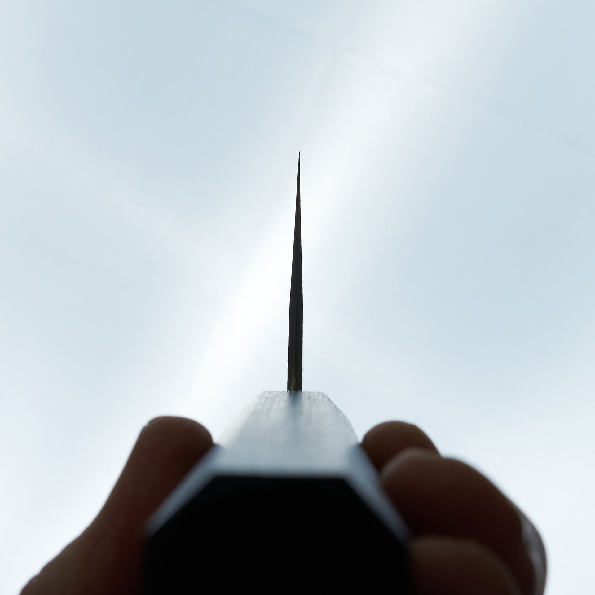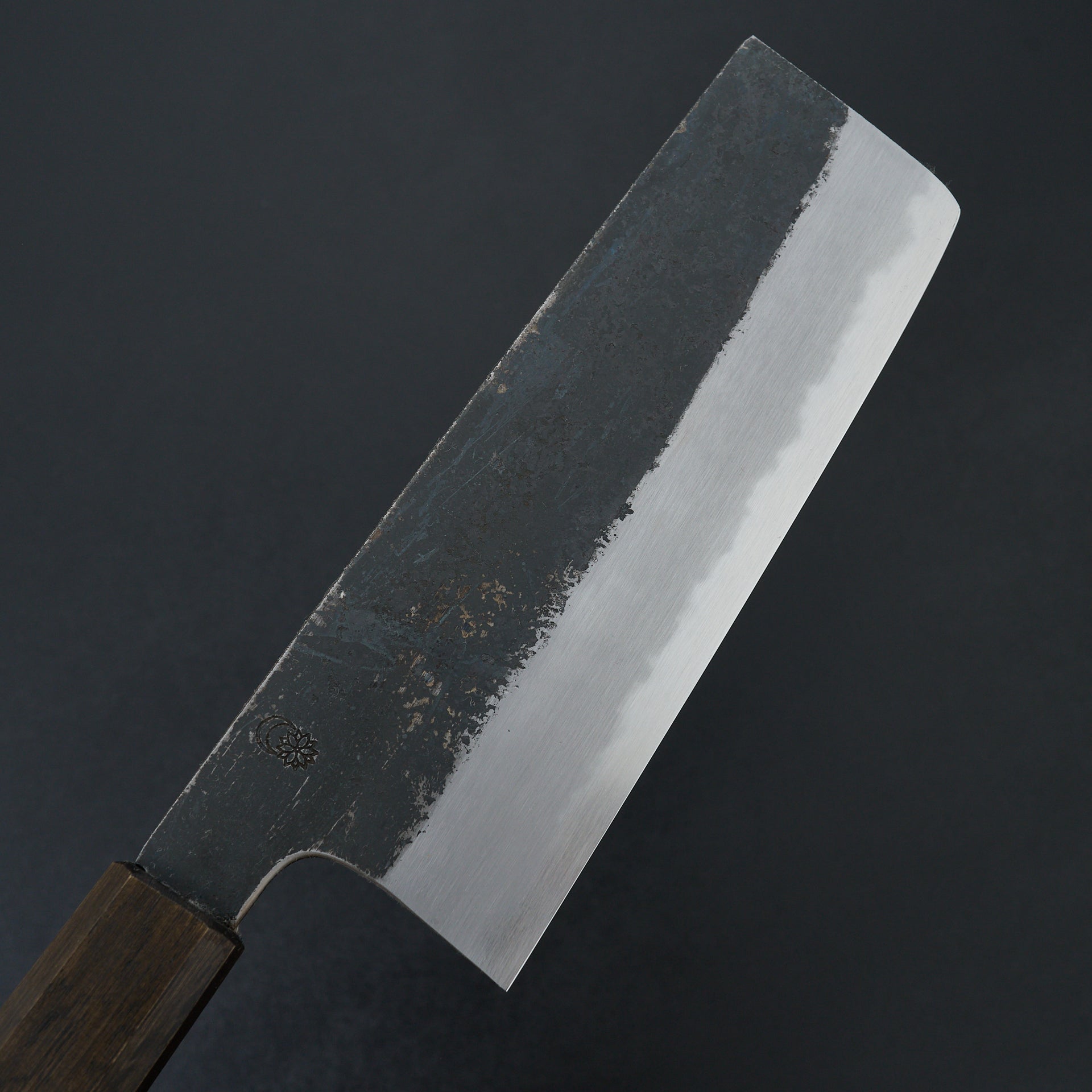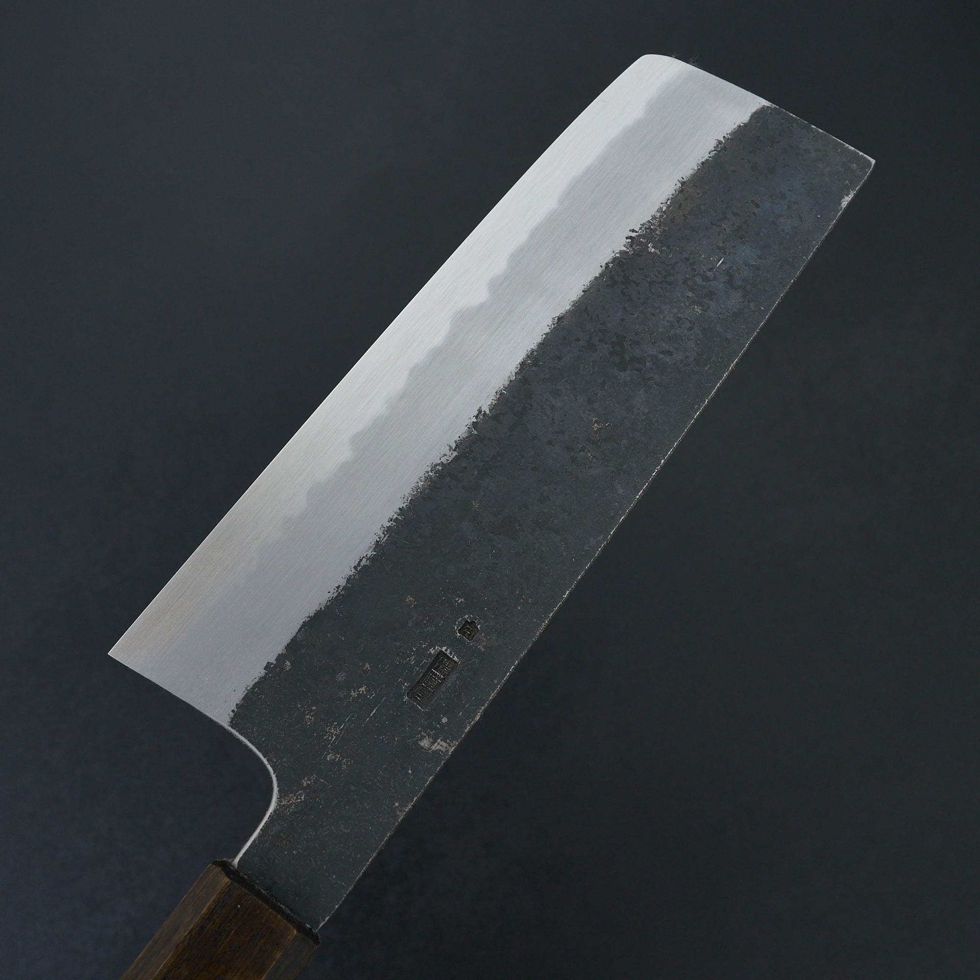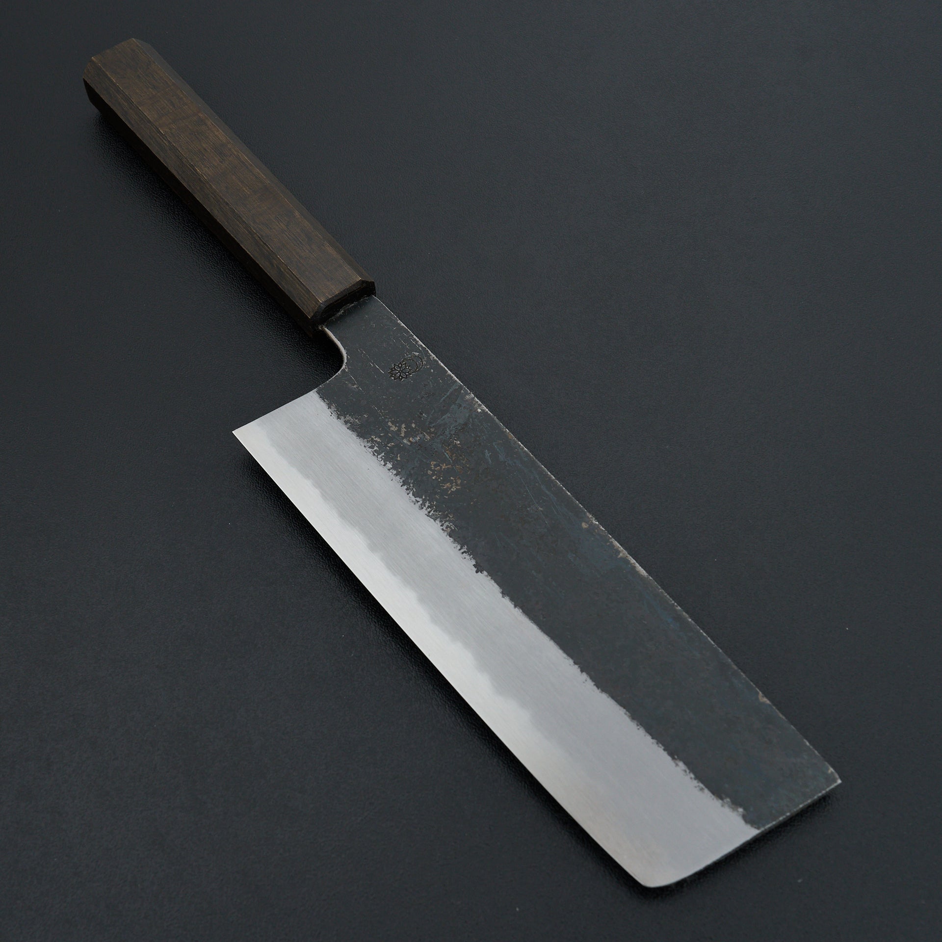 Kawamura Hamono was founded in 1926 in Sakai. Kikumori is praised for their beautiful craftsmanship utilizing traditional techniques specific to their region. Sakai Kikumori Kikuzuki is made from Shirogami #2 steel core and cladded in iron forged by master Yoshikazu Tanaka. The top of the blade is left with a natural Kurouchi finish from the blacksmith. The mono octagonal handle is Japanese lacquered Oak wood.