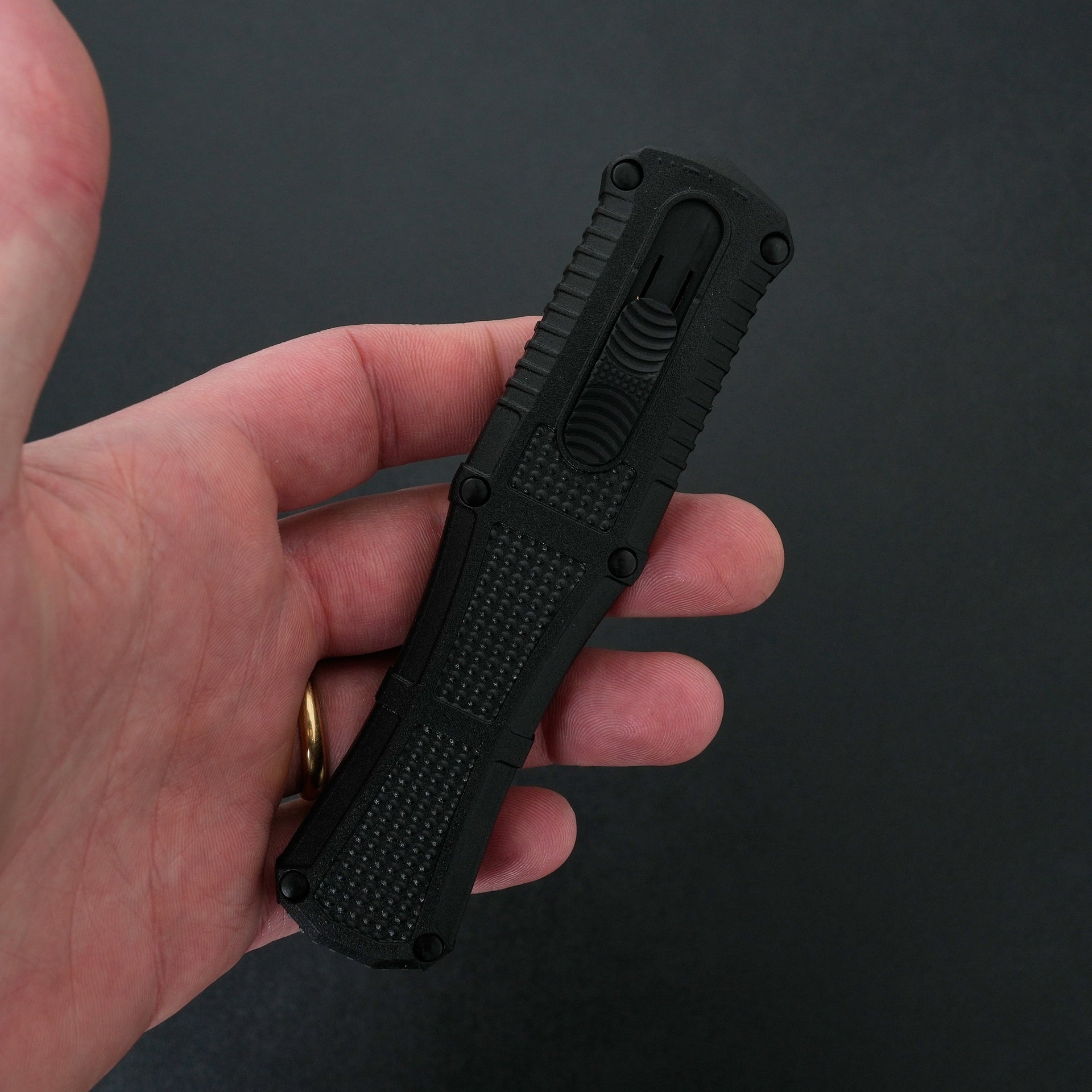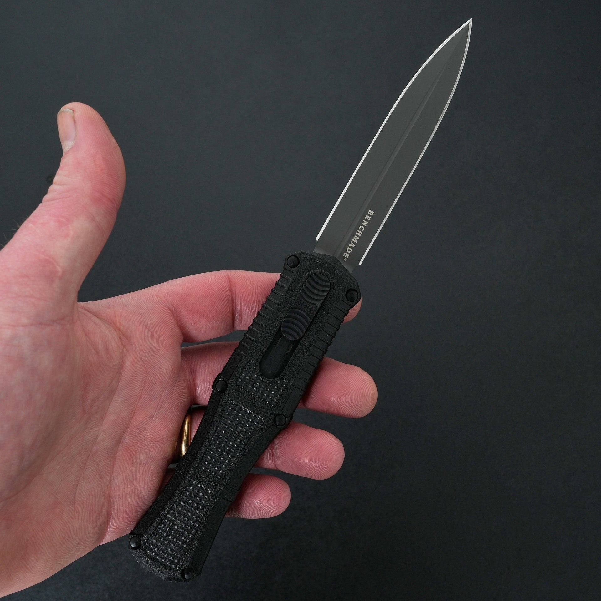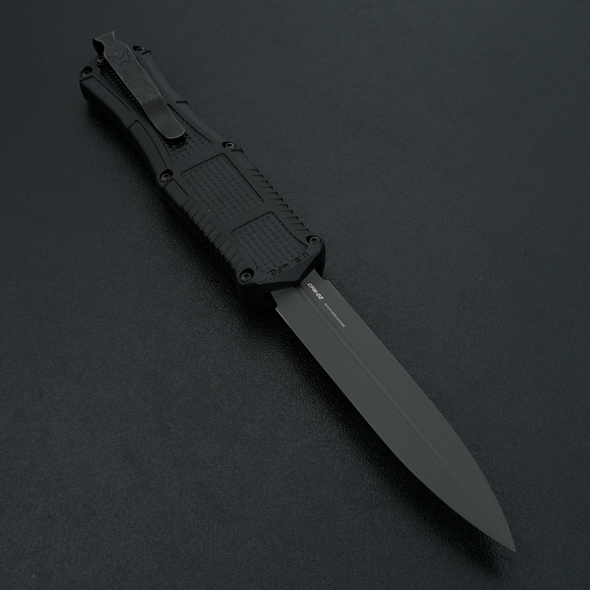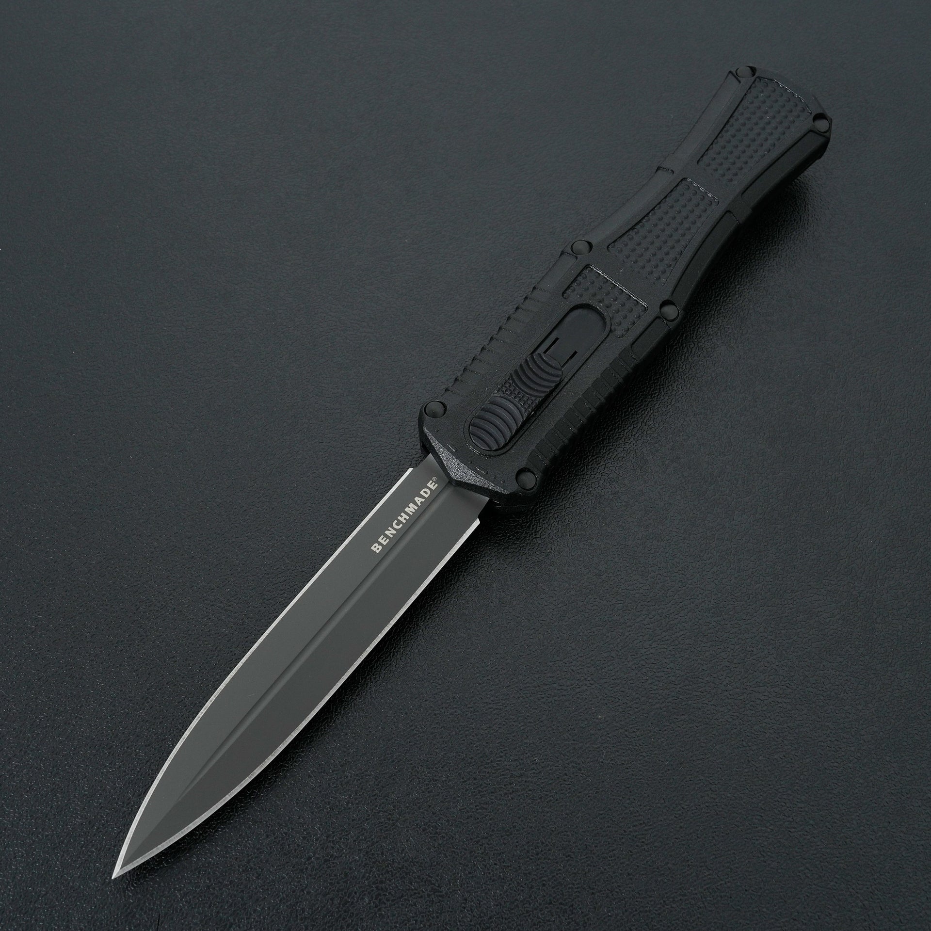 "Known for its iconic ball-bearing matrix texturing, lighting-fast automatic actuation and strength and durability through hard-use tasks, the new 3370GY Claymore OTF expands your options for powerful tactiful self-defense and performance. The new out-the-front configuration features a slider release button and double-edge CPM-D2 dagger housed in a lightweight Grivory handle for ambidextrous confidence and hardcore utility in stressful situations."