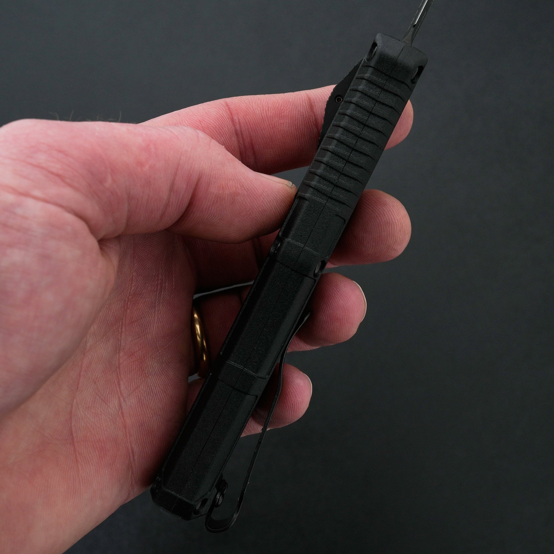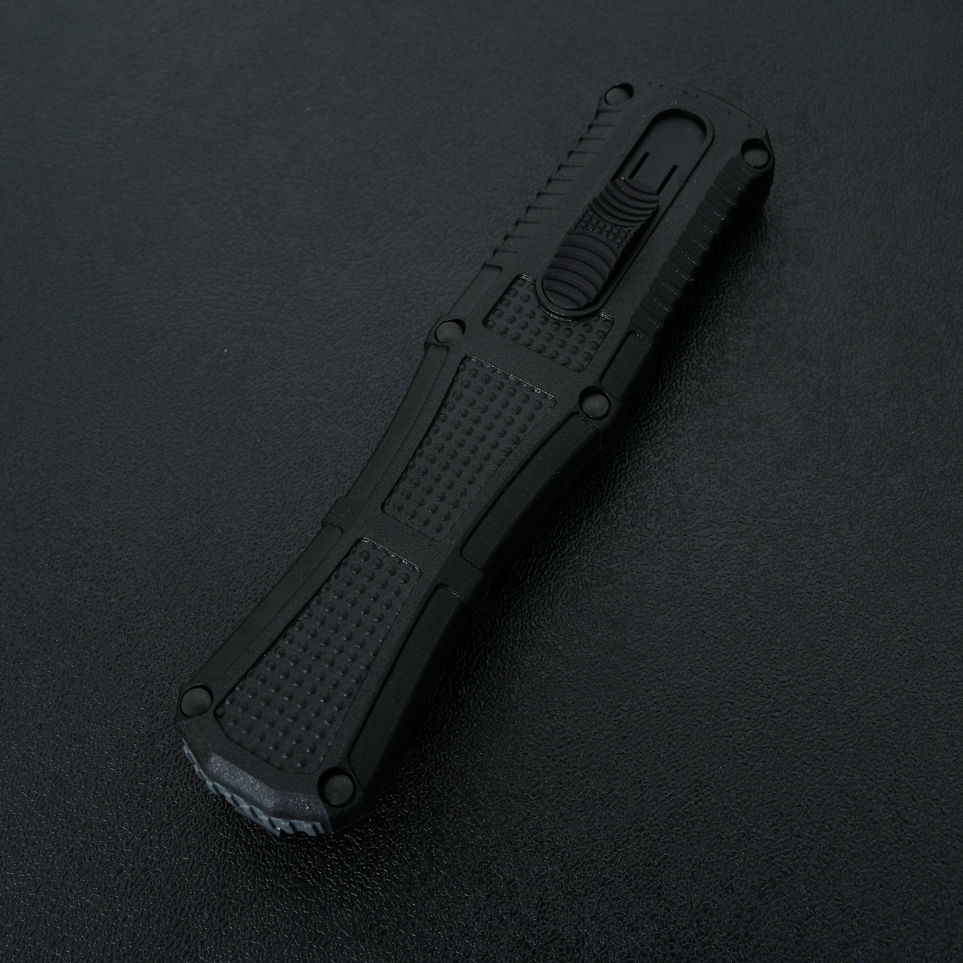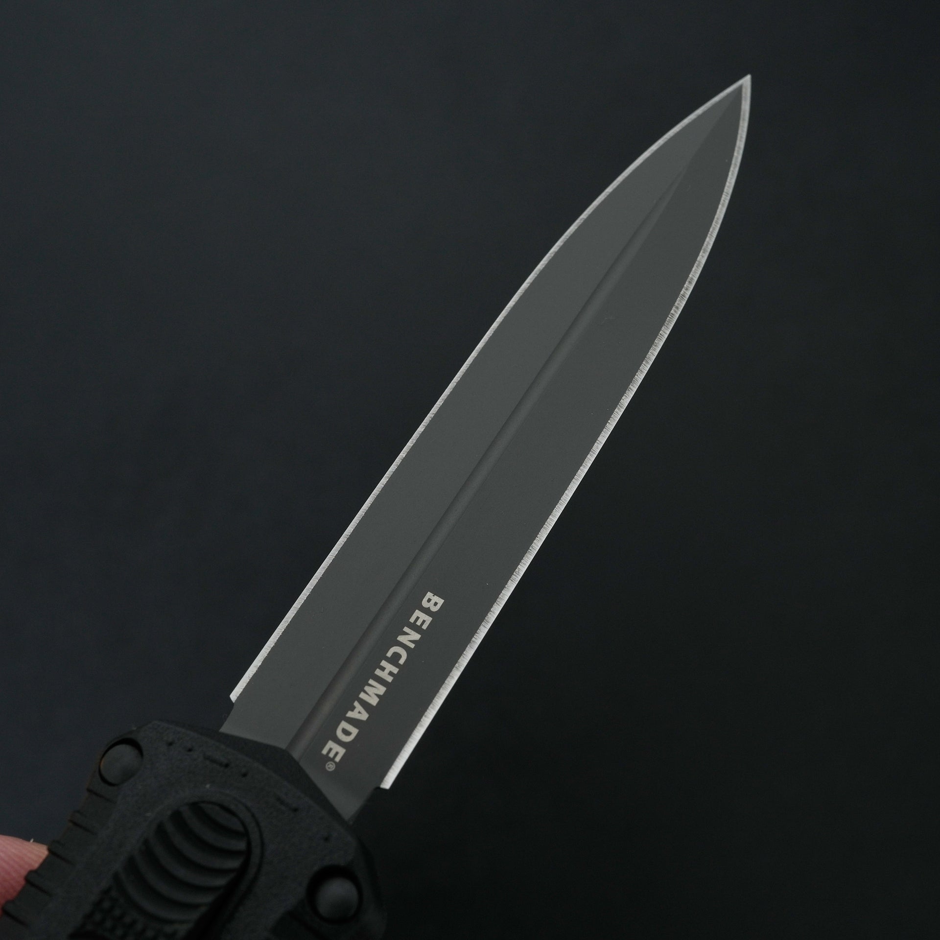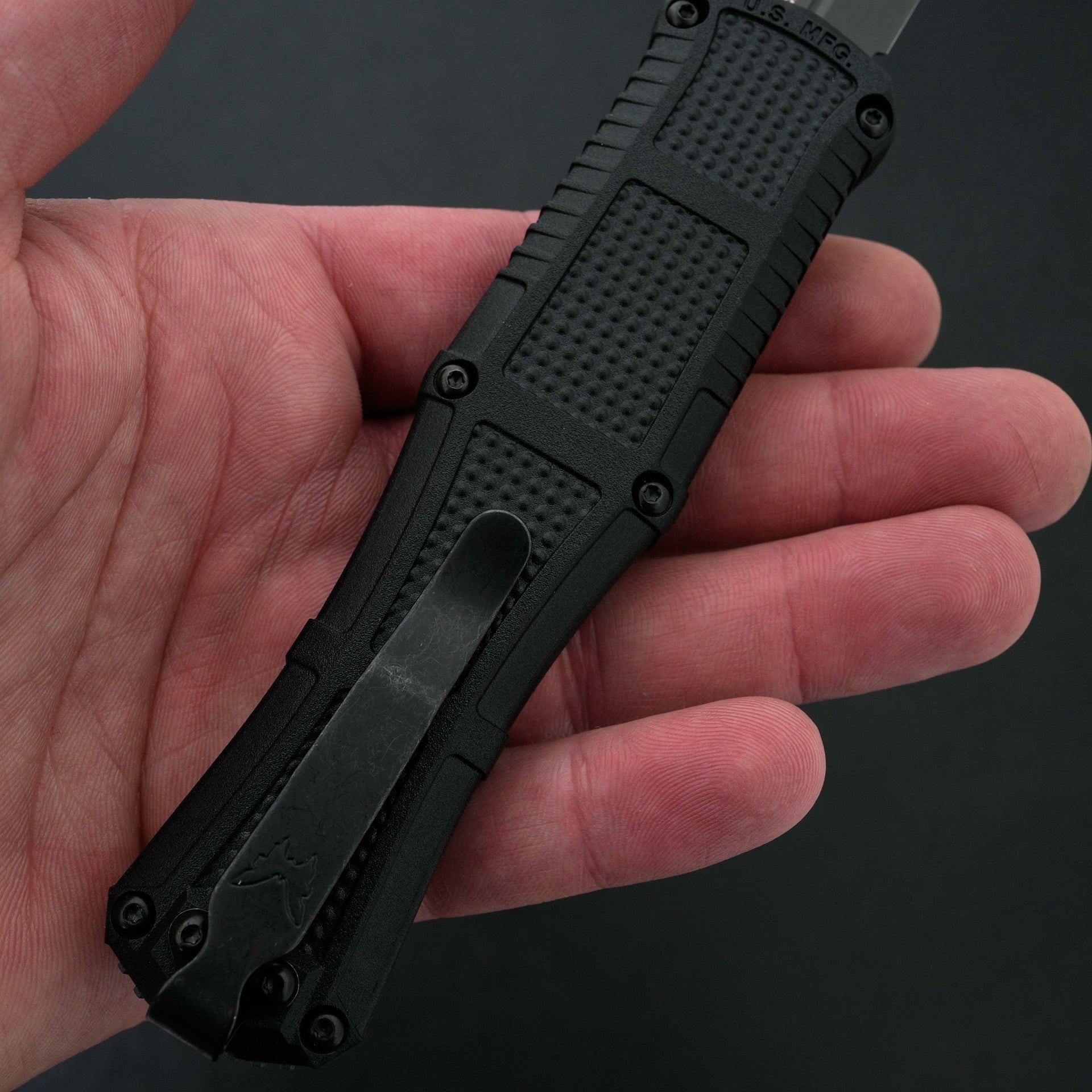 "Known for its iconic ball-bearing matrix texturing, lighting-fast automatic actuation and strength and durability through hard-use tasks, the new 3370GY Claymore OTF expands your options for powerful tactiful self-defense and performance. The new out-the-front configuration features a slider release button and double-edge CPM-D2 dagger housed in a lightweight Grivory handle for ambidextrous confidence and hardcore utility in stressful situations."