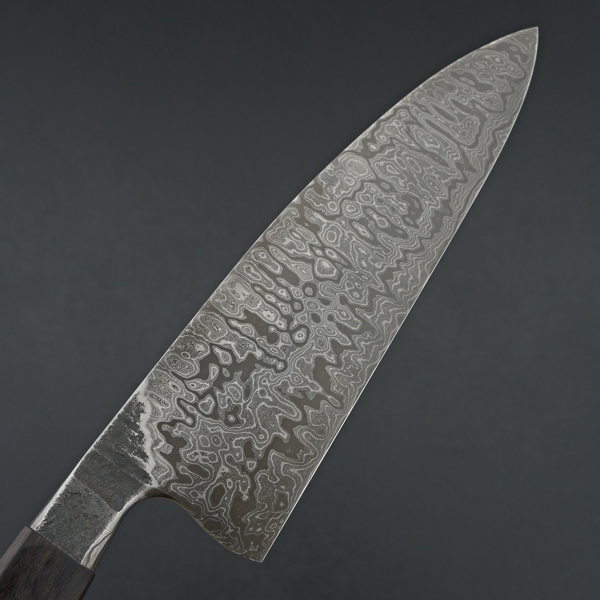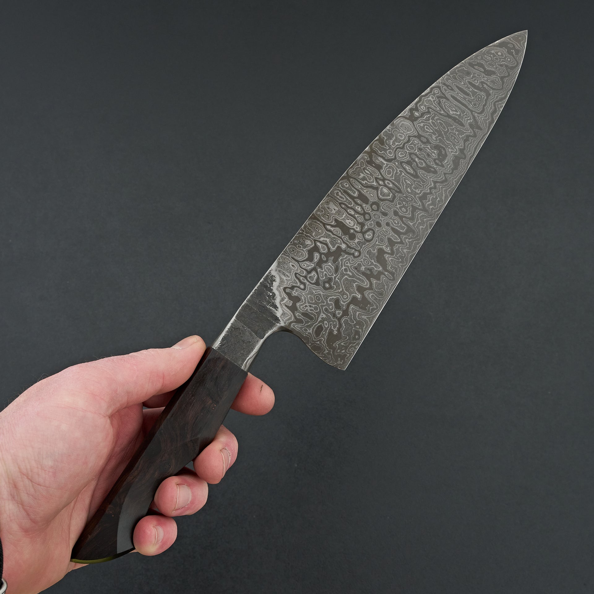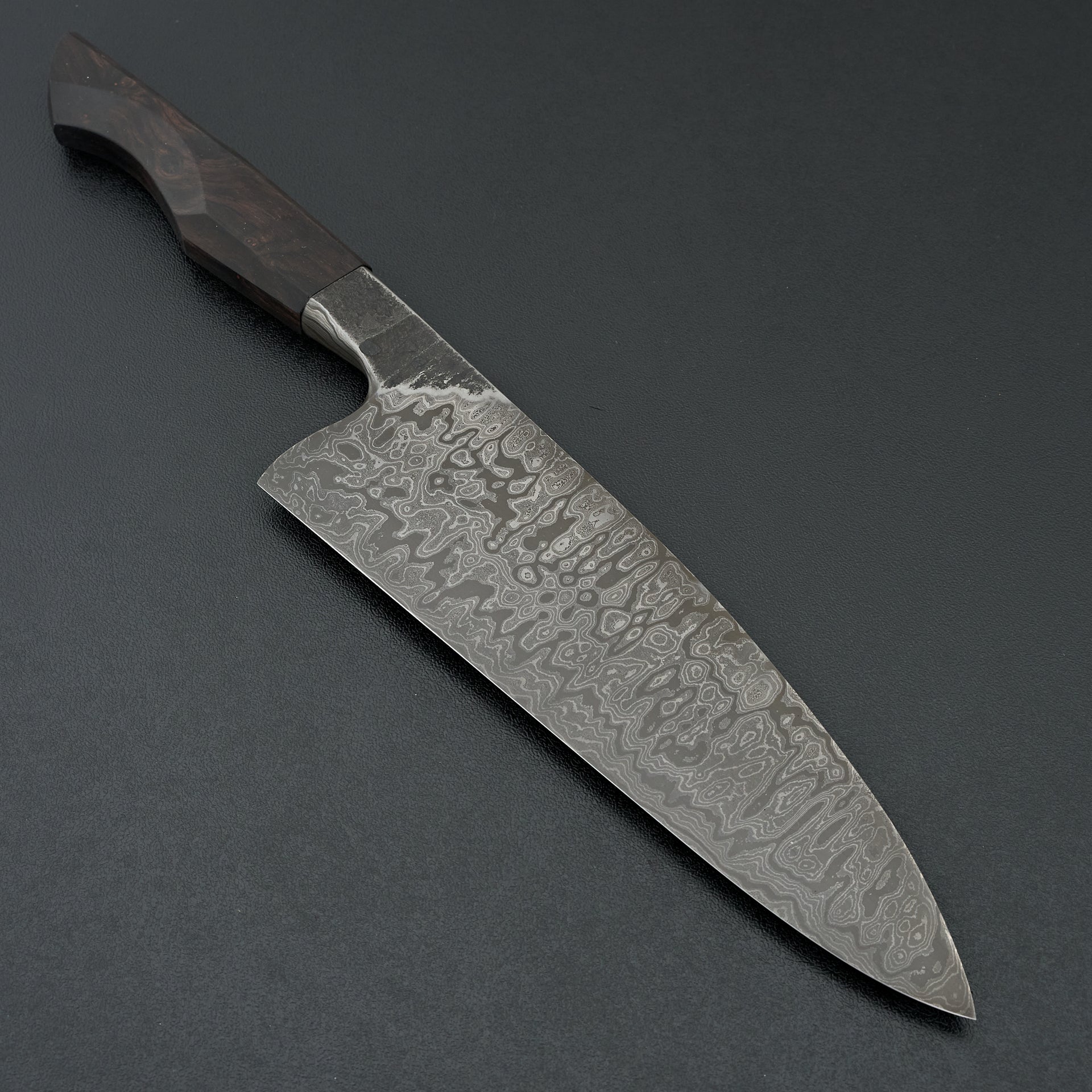 This blade is a hand forged damascus made from high carbon Pro-cut and 52100 steels in a very deep layer pattern. The blade has a deep etch to display the layers in the steel. Medium bodied with very thin cutting edge gives a nice balance of feel and performance. The core steel is hardened to ~65hrc. The handle is hand sculpted from African Blackwood.