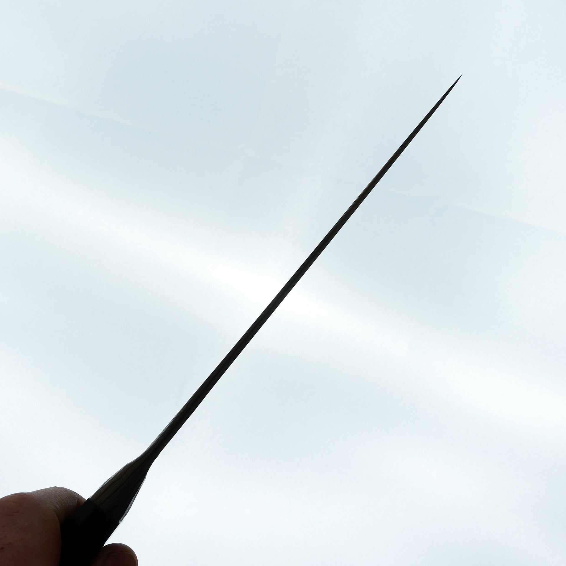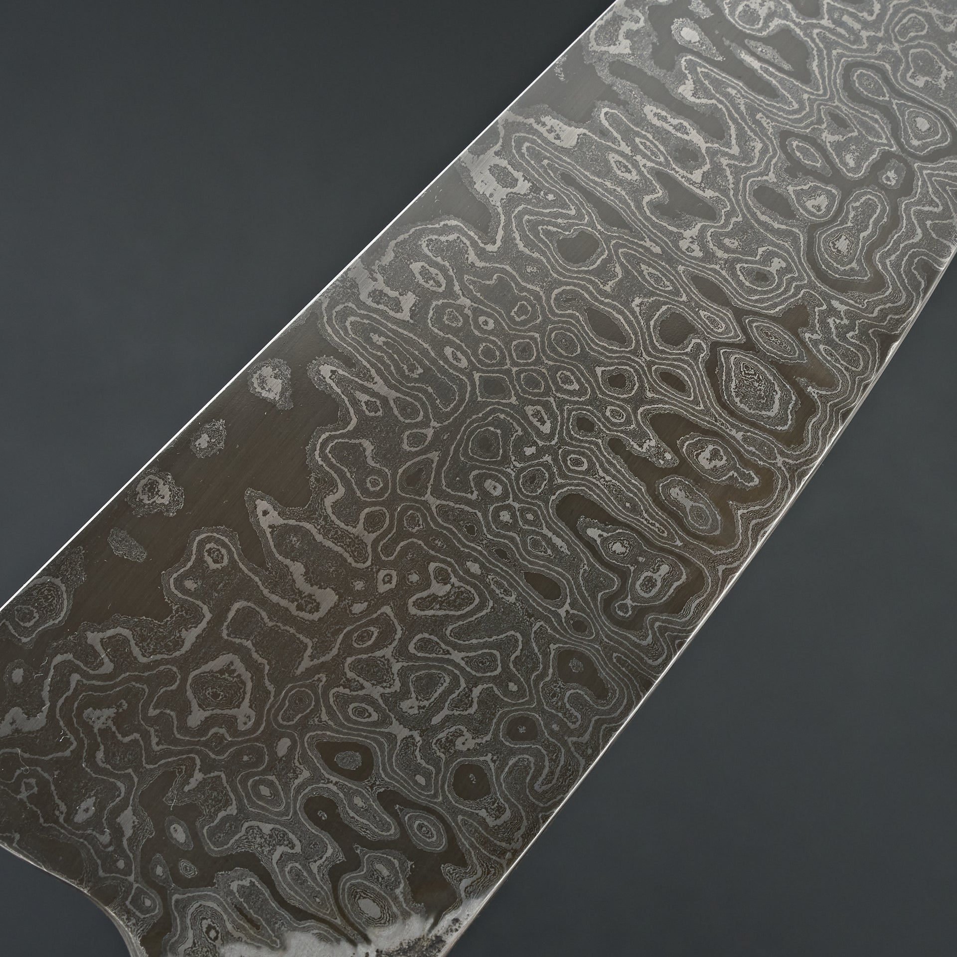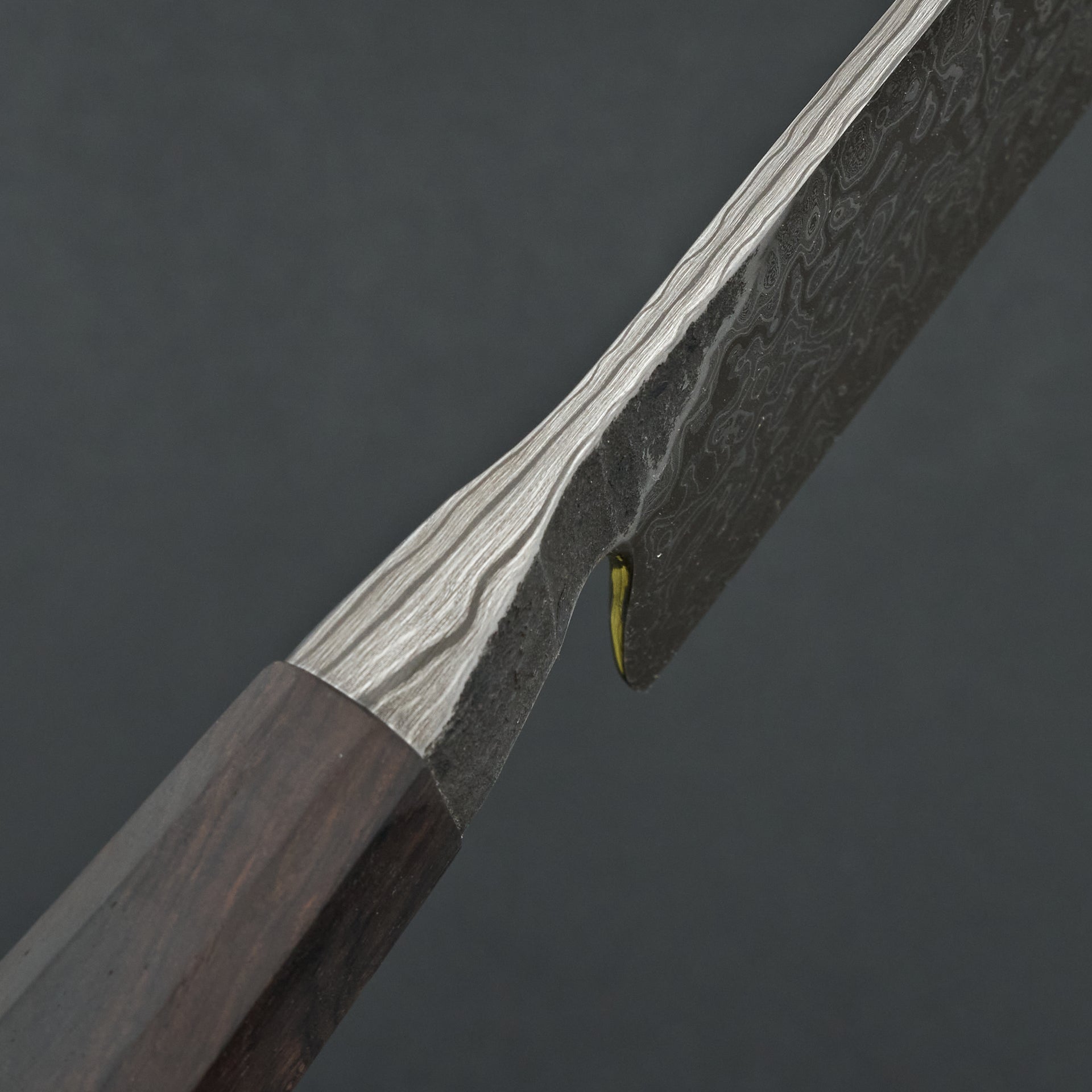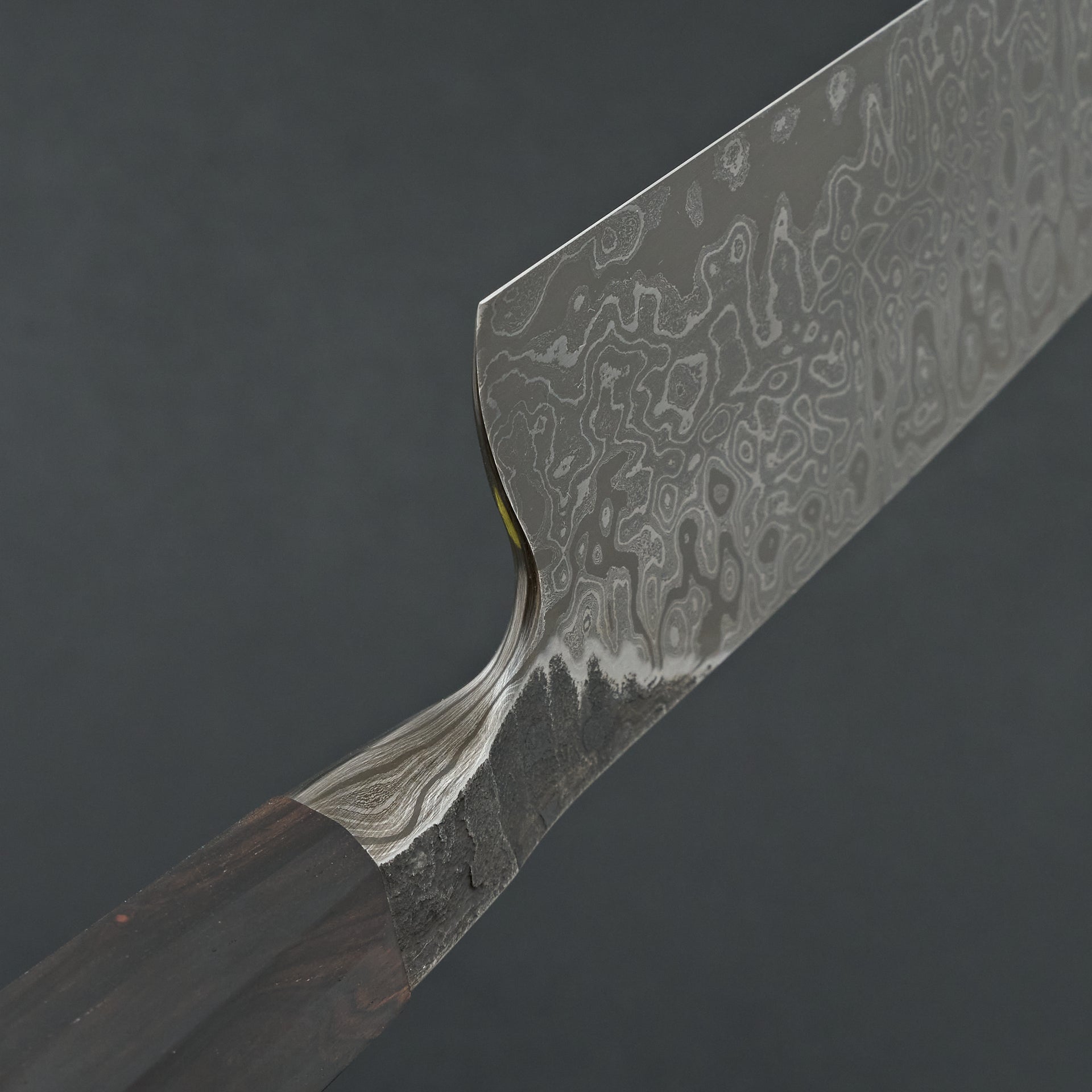 This blade is a hand forged damascus made from high carbon Pro-cut and 52100 steels in a very deep layer pattern. The blade has a deep etch to display the layers in the steel. Medium bodied with very thin cutting edge gives a nice balance of feel and performance. The core steel is hardened to ~65hrc. The handle is hand sculpted from African Blackwood.