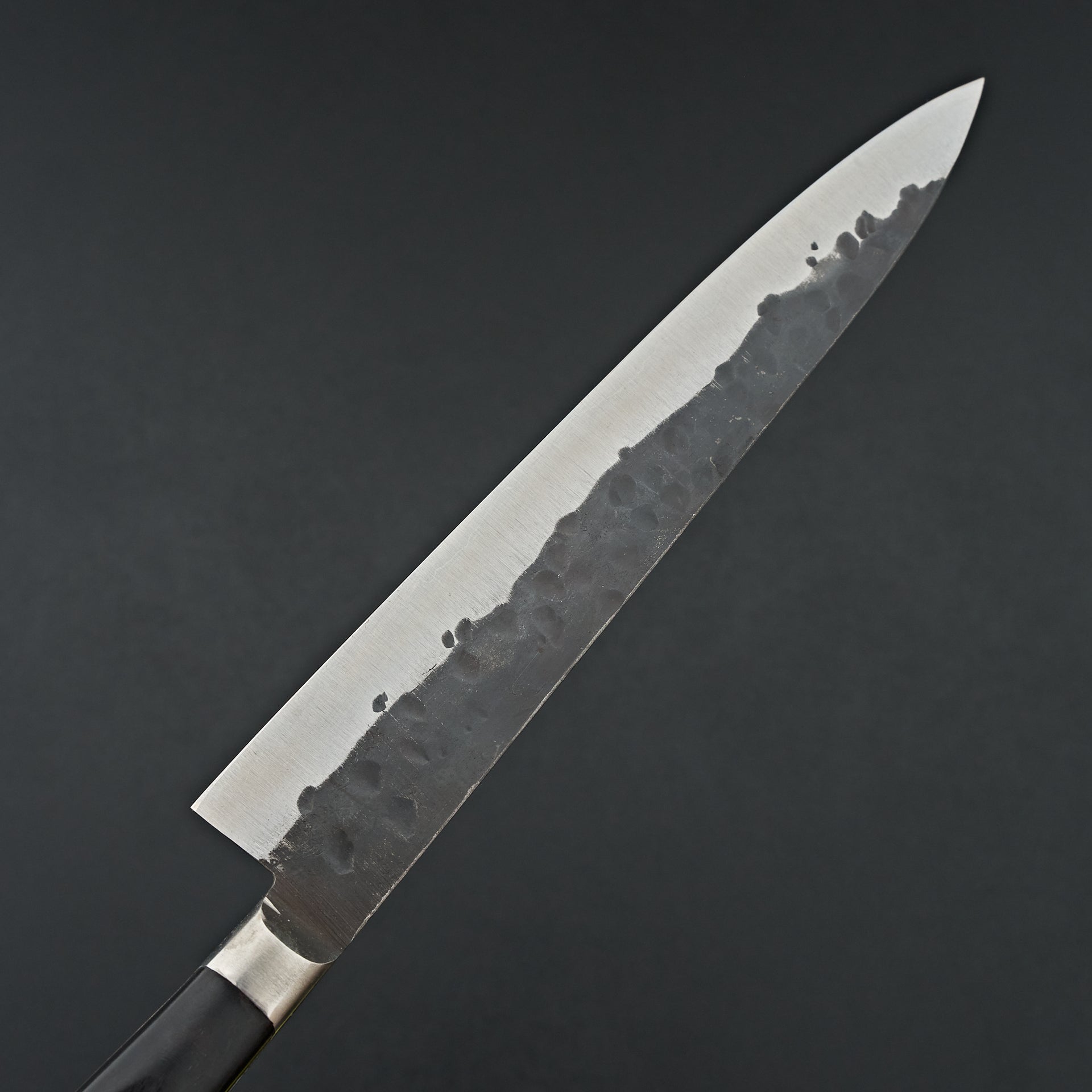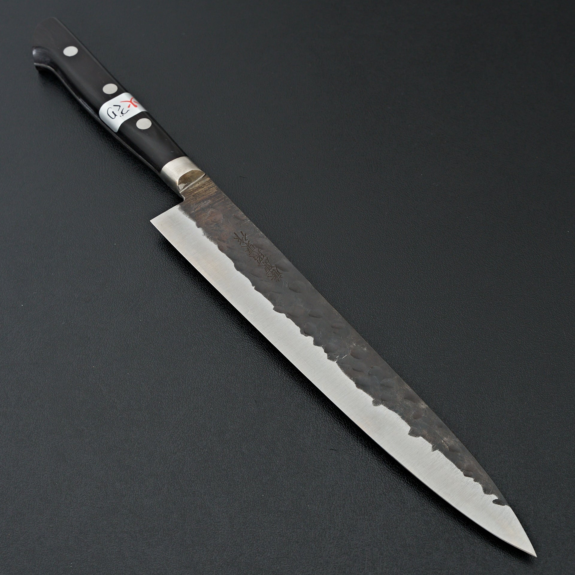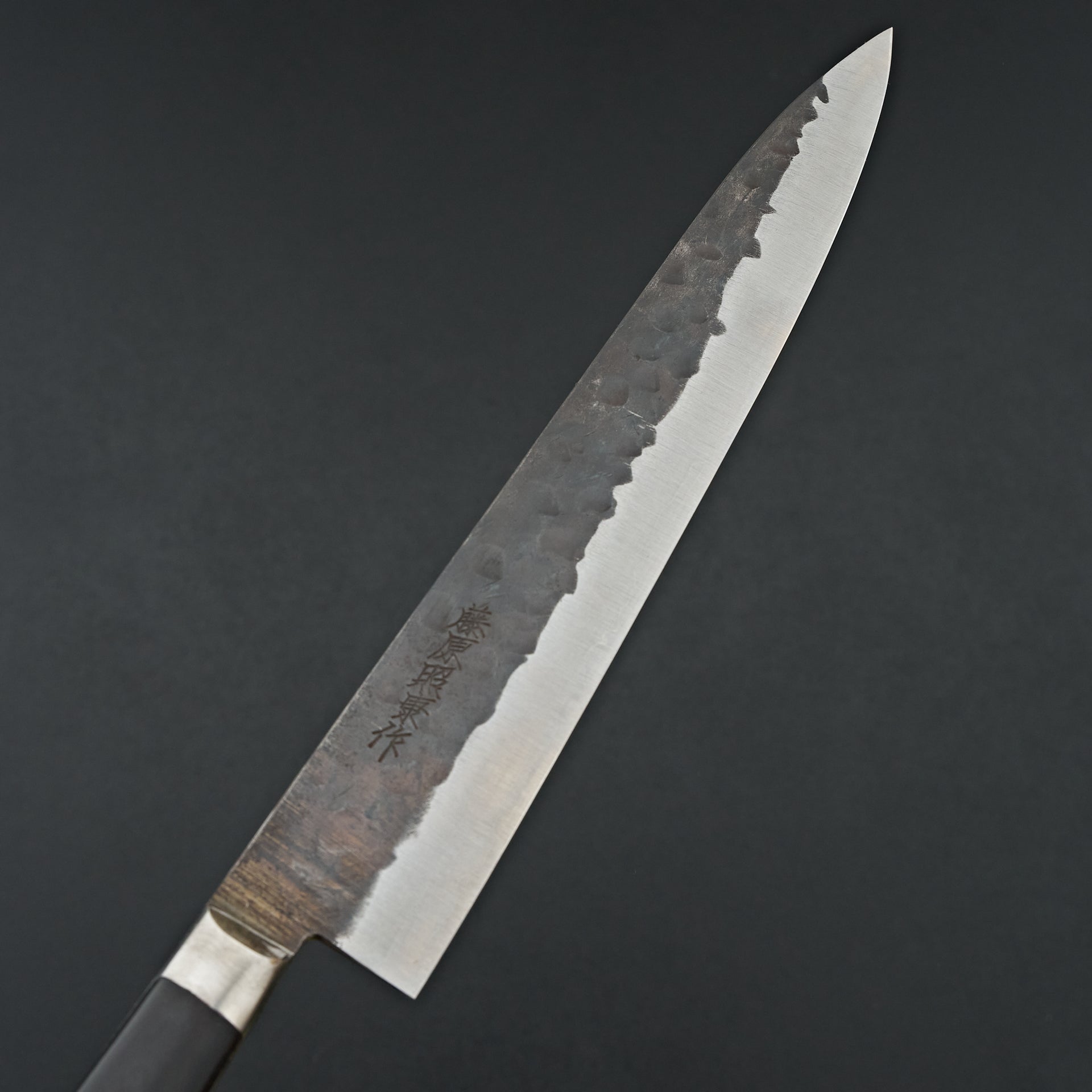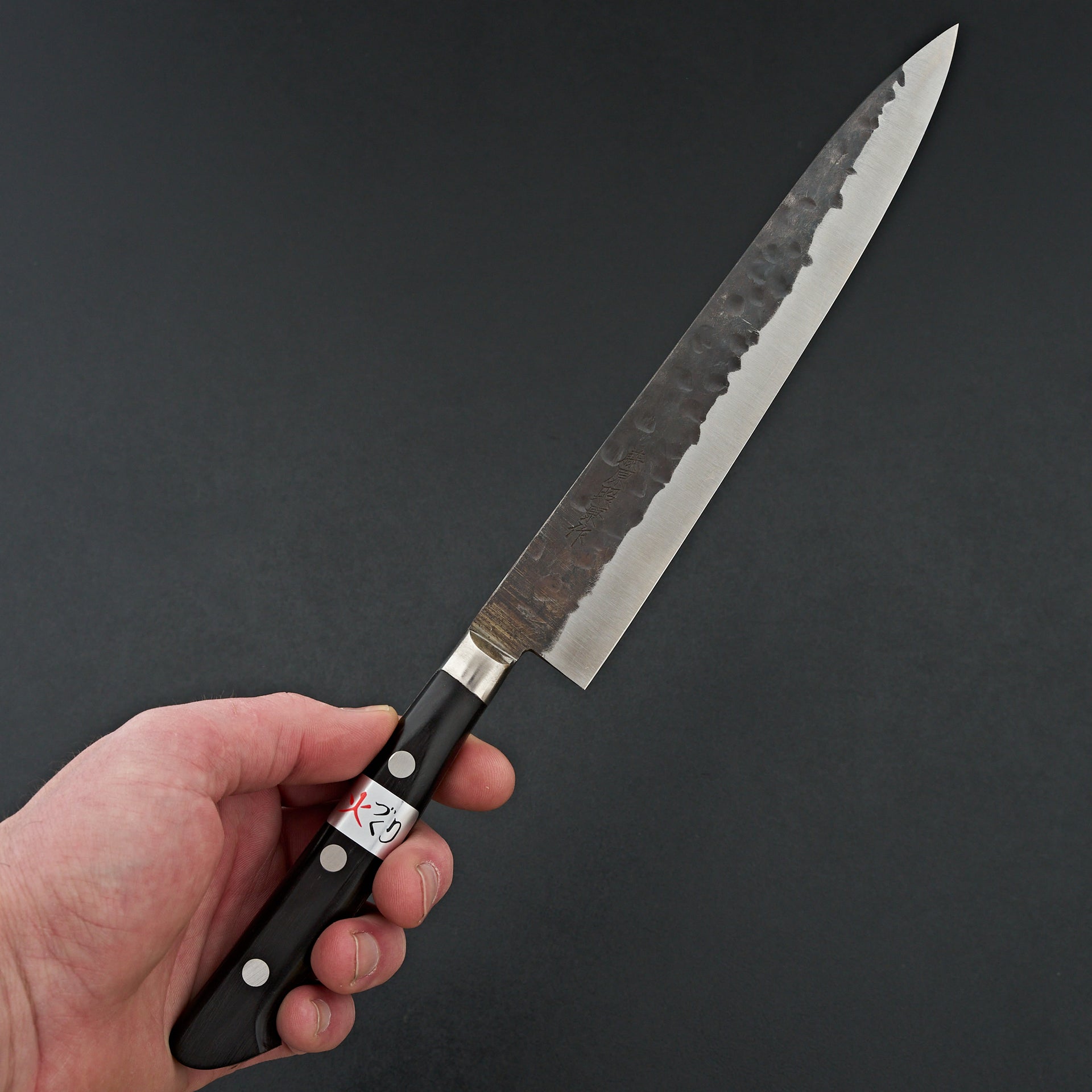Teruyasu Fujiwara makes some of the highest regarded knives on the market for their ability to take an incredibly sharp edge. The Denka line is forged from Aogami Super steel rated at 65-66 hrc. The edge retention of this knife is top of the line. They are cladded with a stainless steel and kurouchi hammered finish. Fitted with a western handle and his signature finger notch makes for a very comfortable cutting experience.