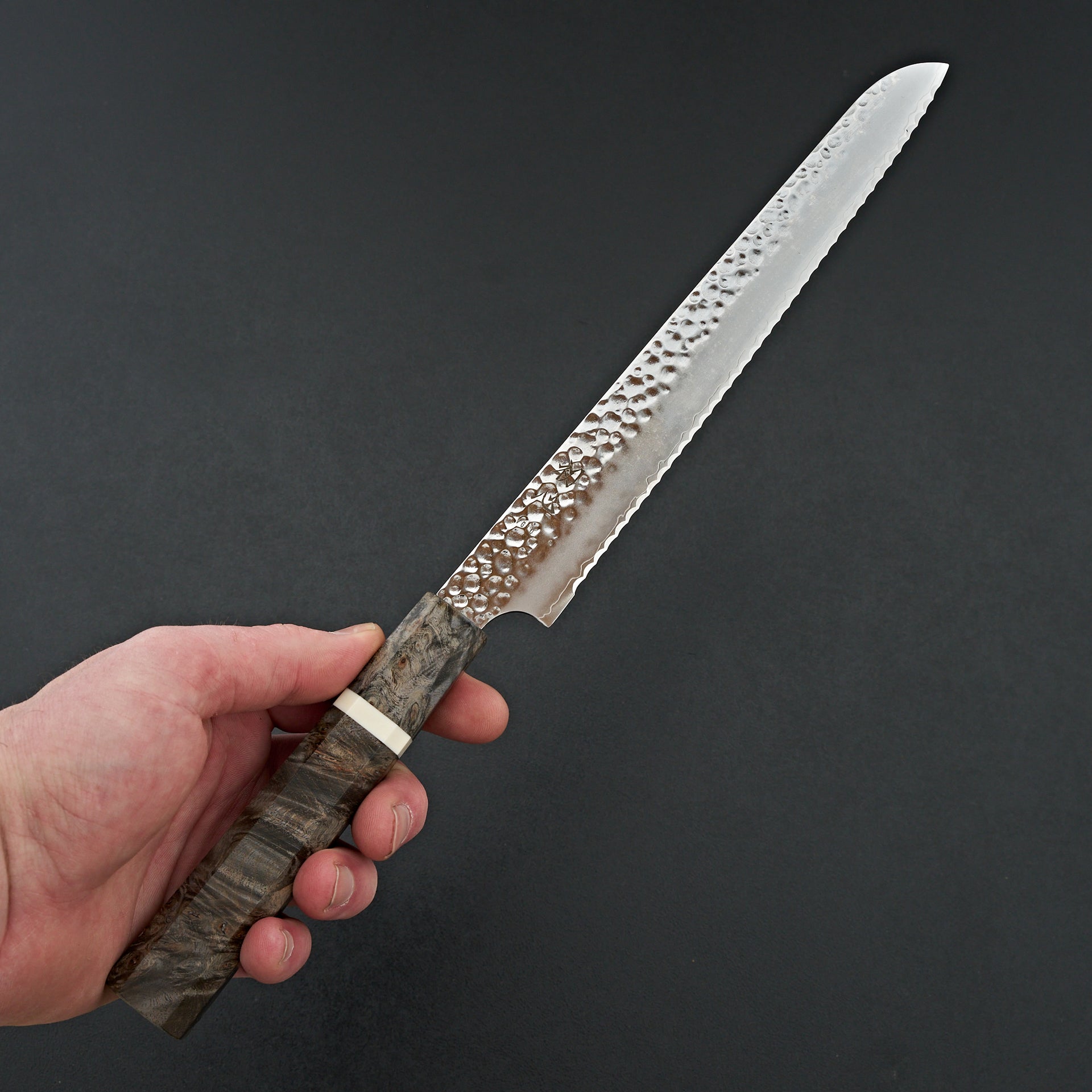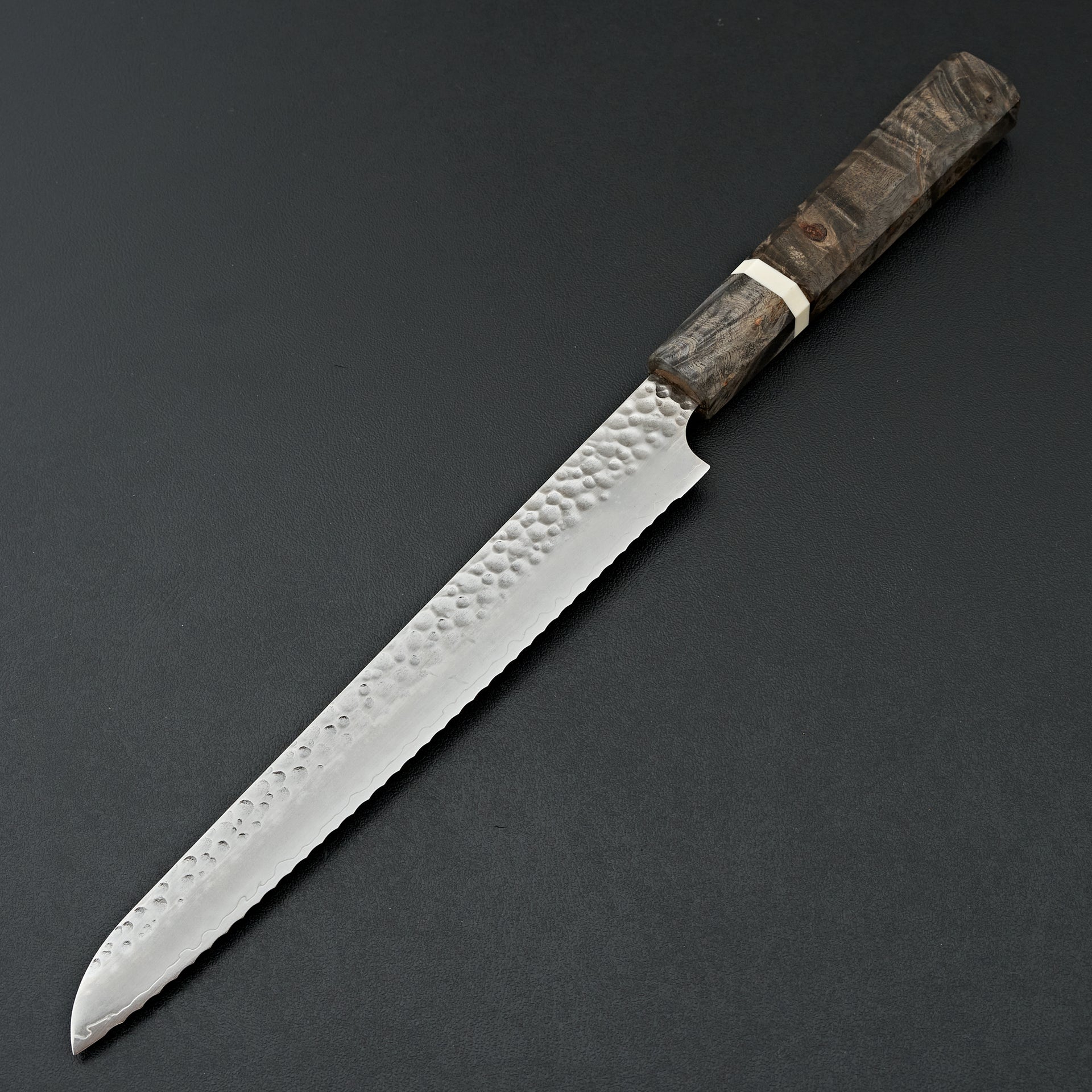 The Hatsukokuro Hayabusa Bread Knife is made from VG10 core cladded in stainless with a hammered finish. The handle is made from stabilized maple with a synthetic white spacer.