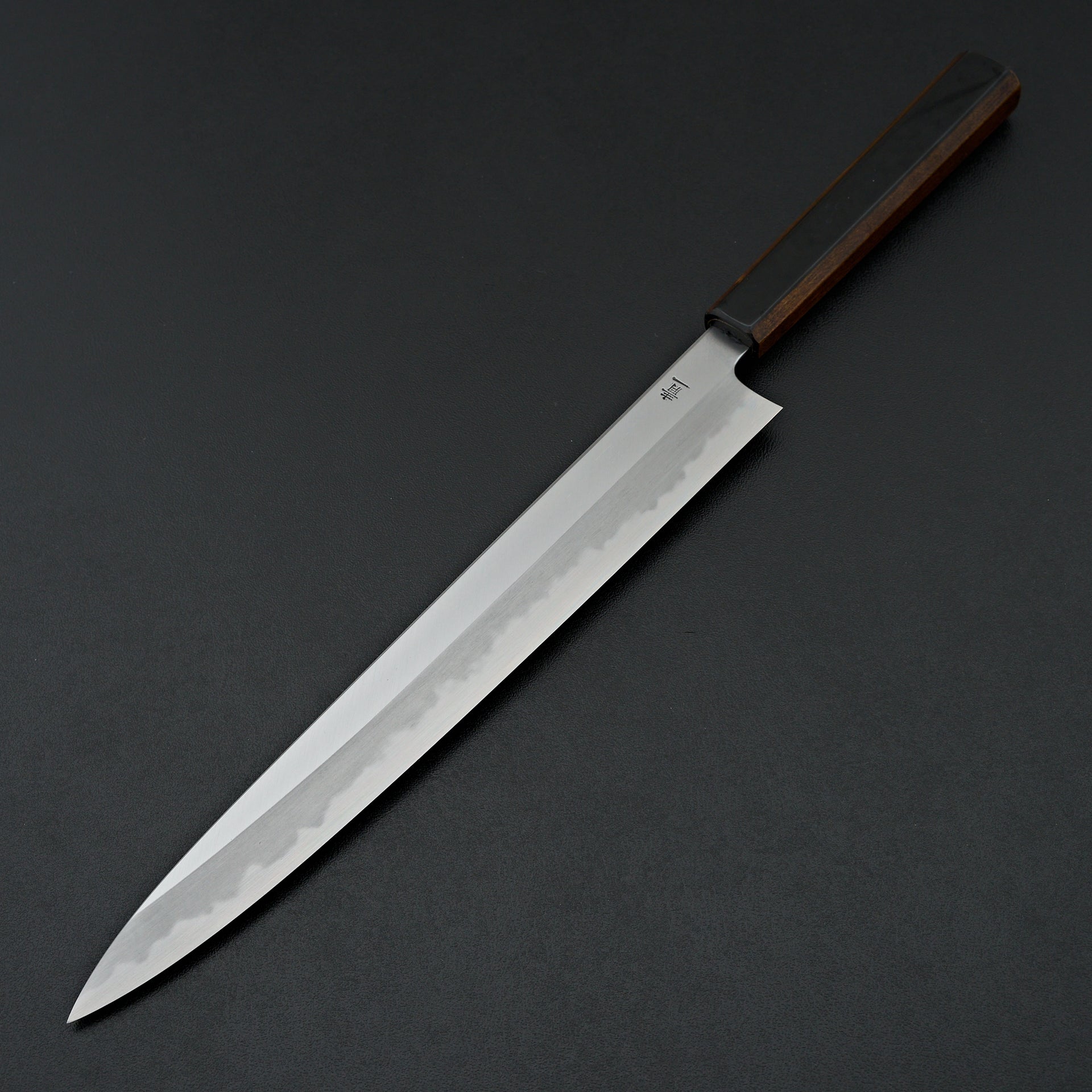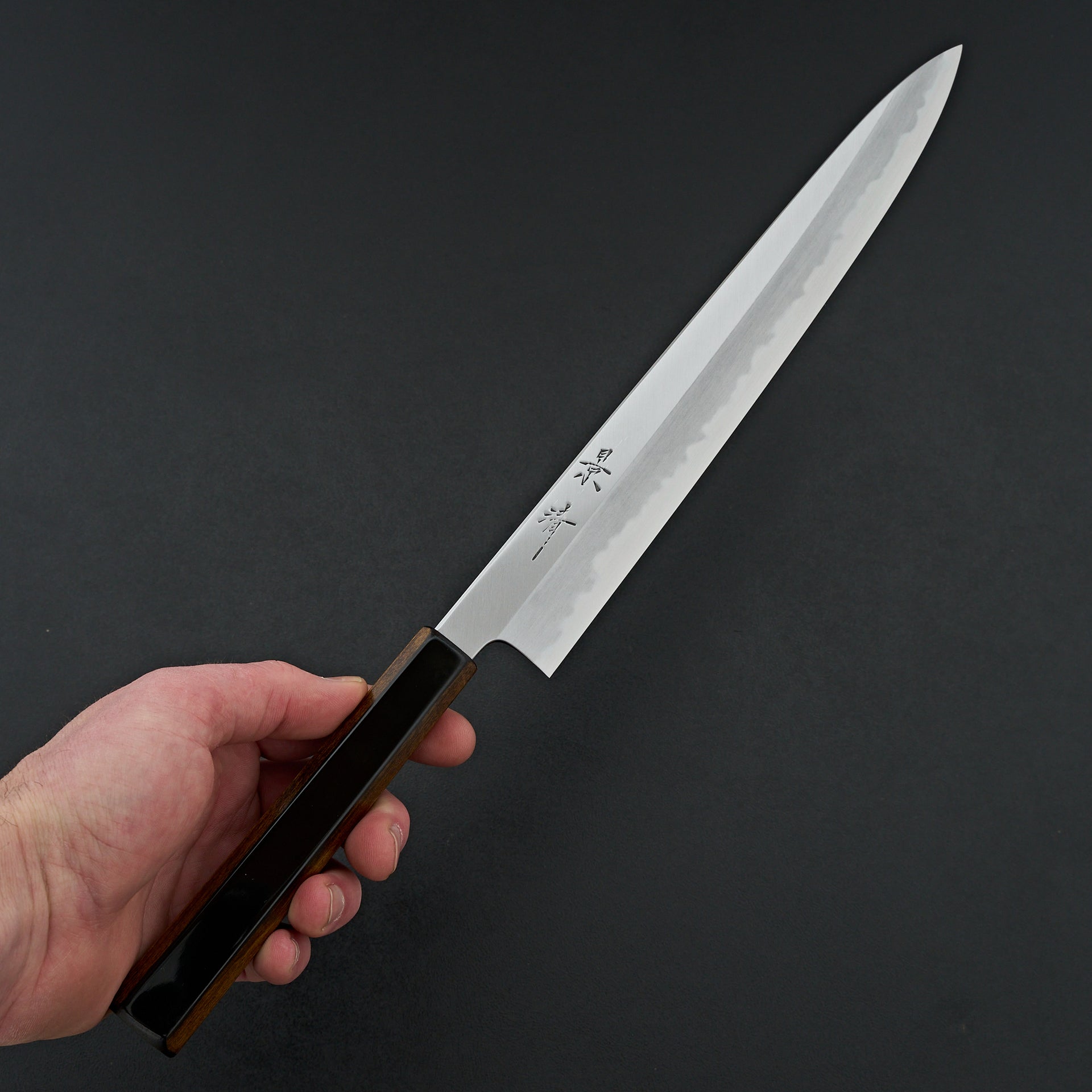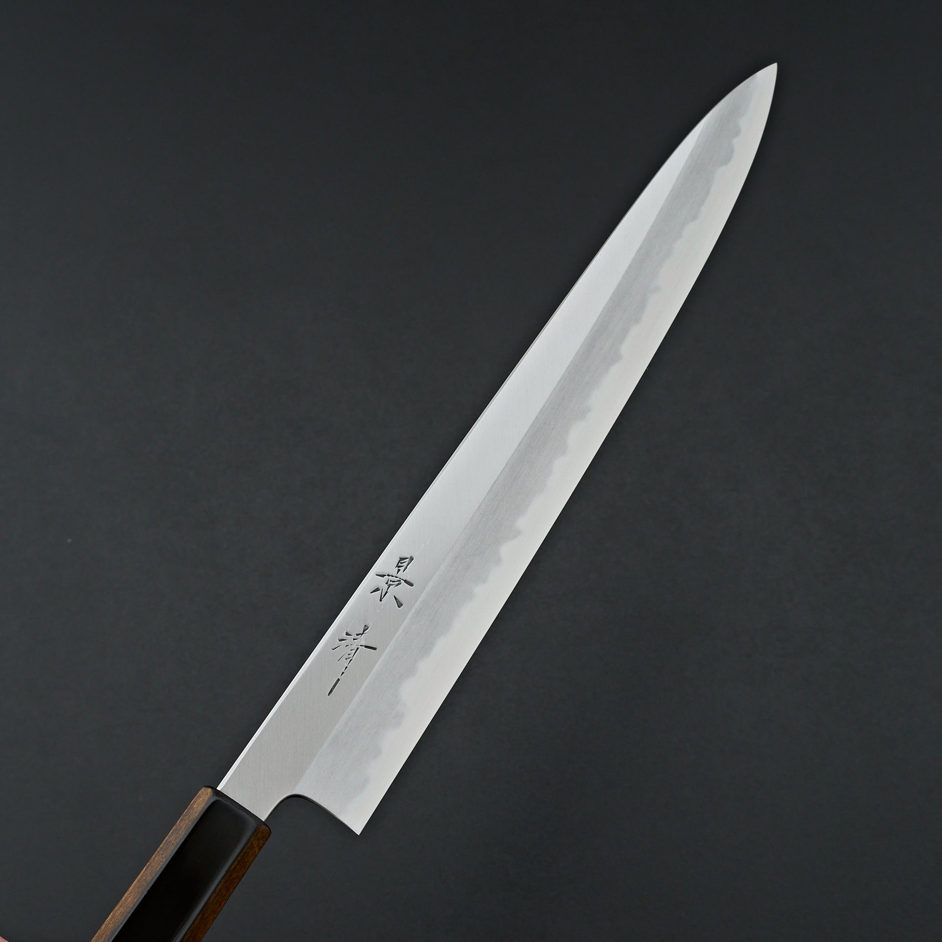 Kagekiyo is a premium line made in Sakai. Every craftsman that works on this line is a certified master craftsman and it shows in the beauty and finesse of these knives. The blade is forged from aogami #1 (blue #1) steel with iron cladding rated at 64hrc. Aogami 1 is known for excellent edge retention and and fine edge formation. These knives have impressive geometry and are very thin at the edge. The spine and choil are mirror polished. The handle, saya, and box are all finished with the highest quality black urushi (traditional japanese lacquering).