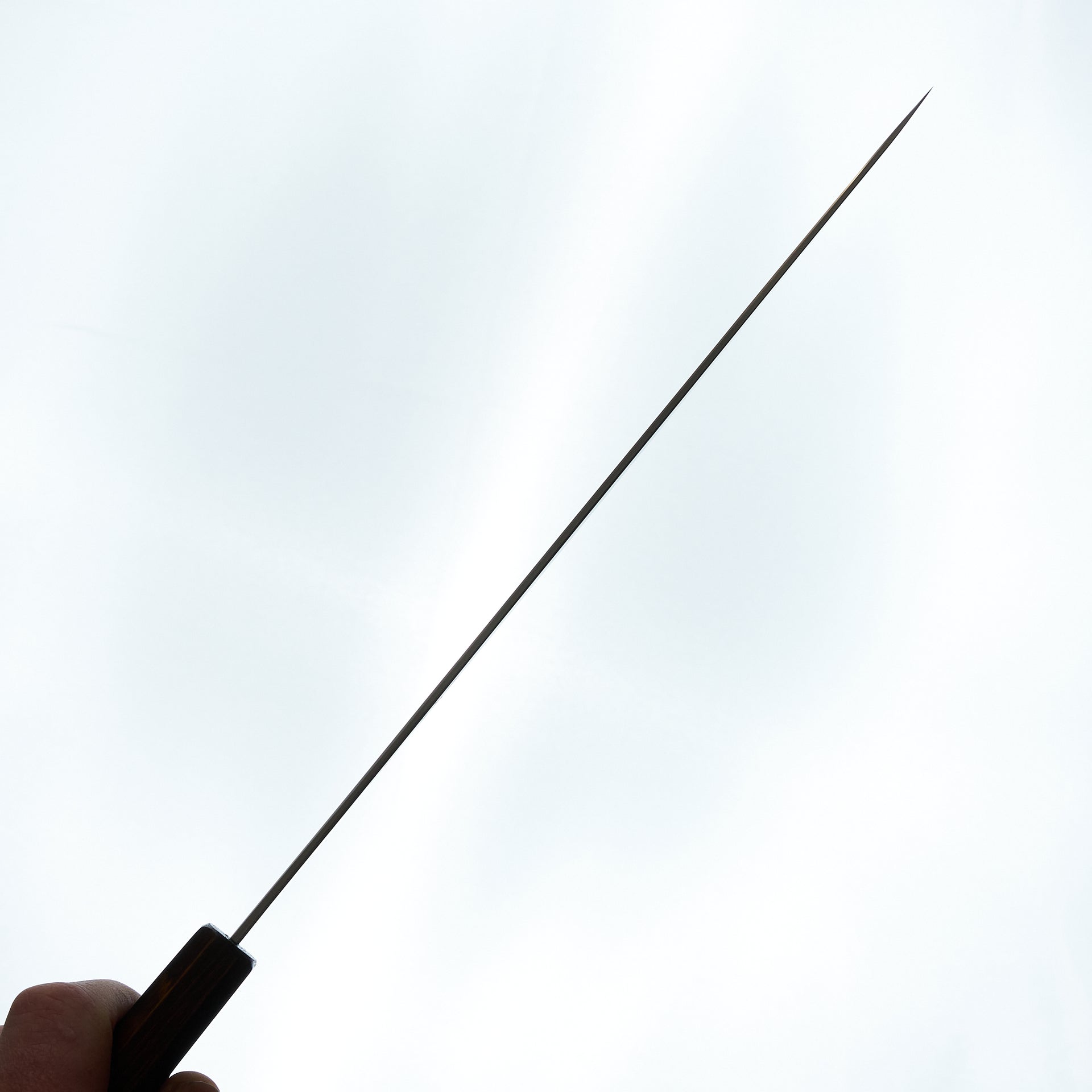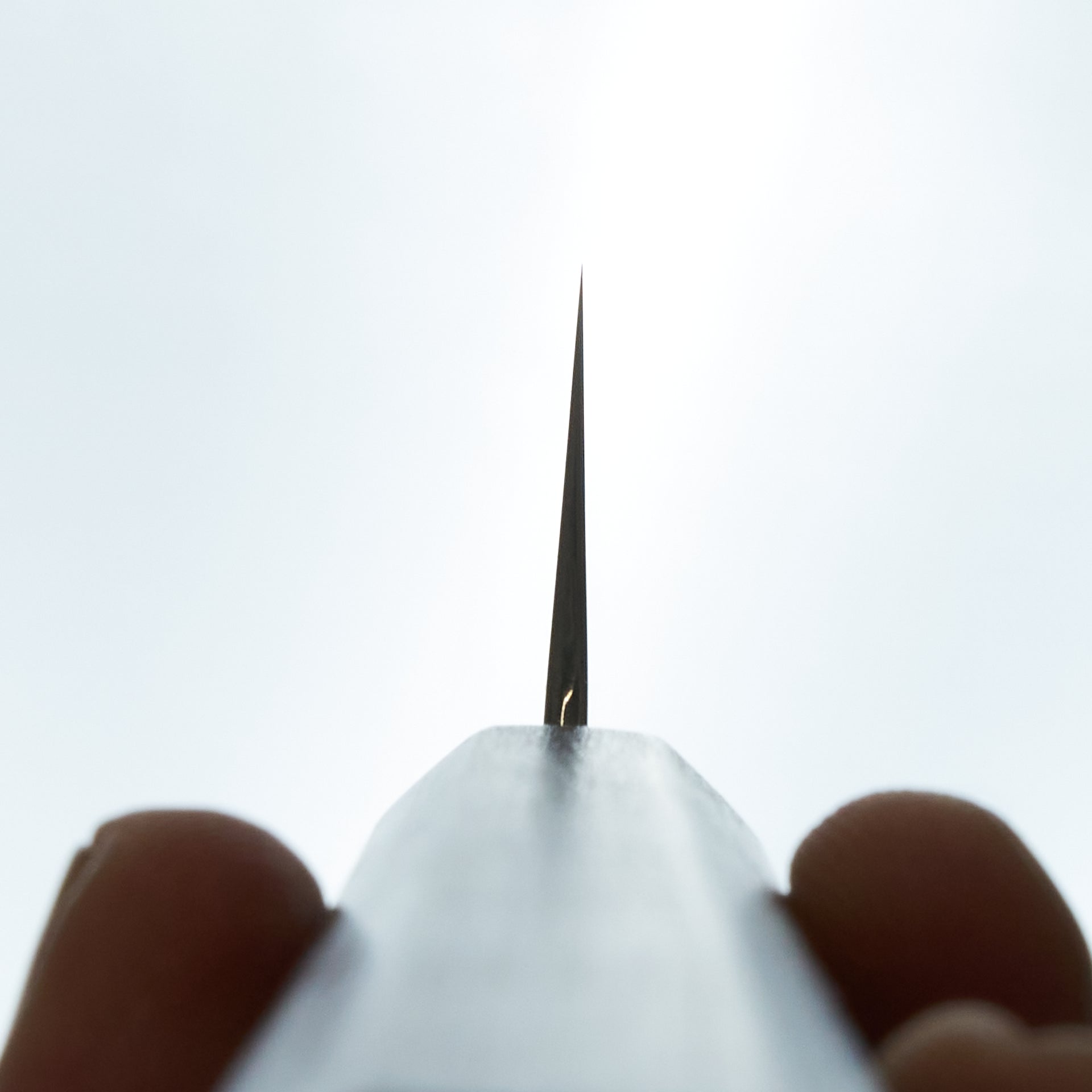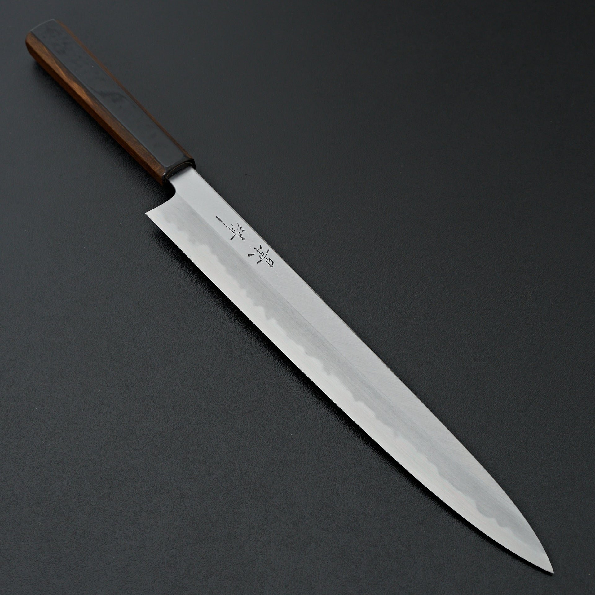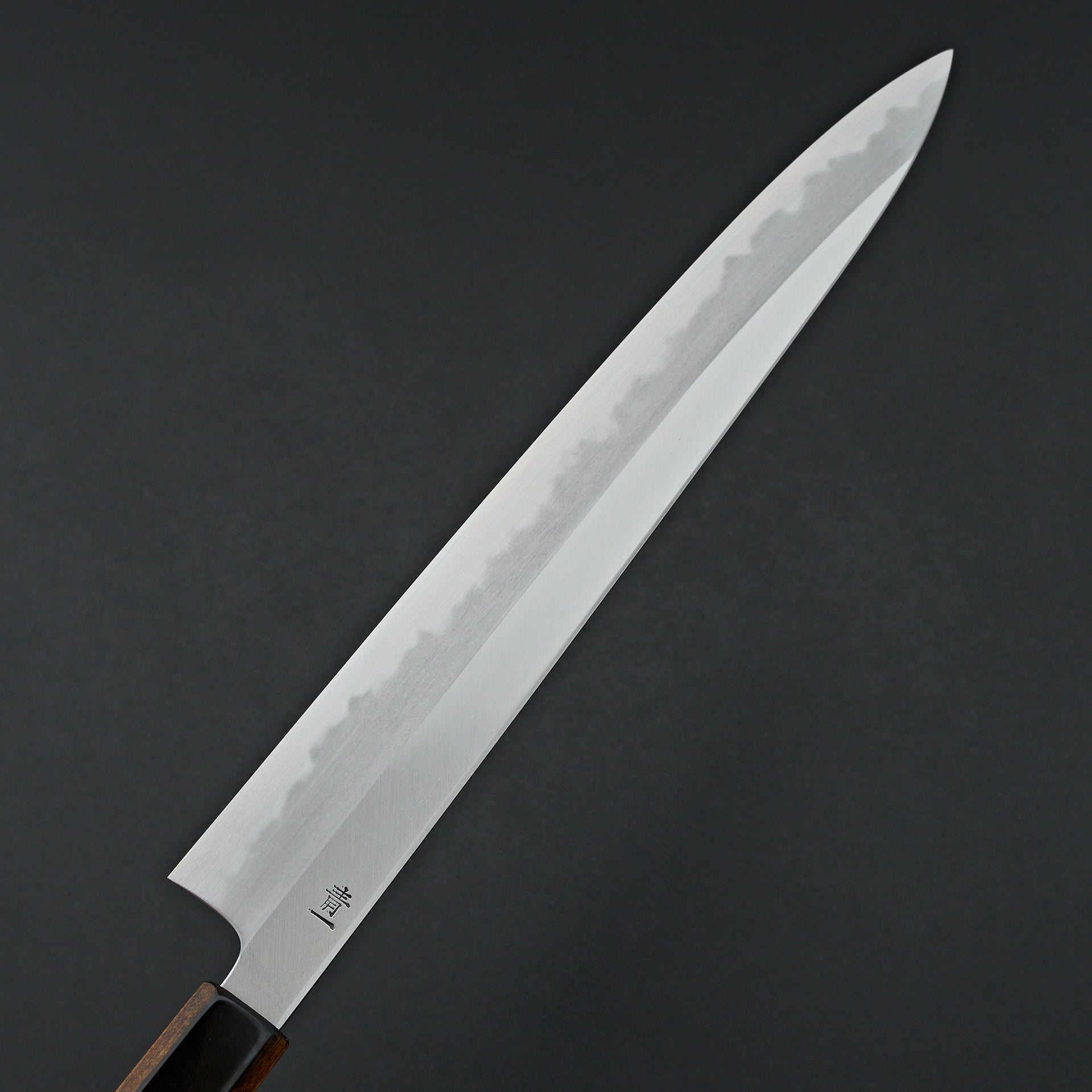 Kagekiyo is a premium line made in Sakai. Every craftsman that works on this line is a certified master craftsman and it shows in the beauty and finesse of these knives. The blade is forged from aogami #1 (blue #1) steel with iron cladding rated at 64hrc. Aogami 1 is known for excellent edge retention and and fine edge formation. These knives have impressive geometry and are very thin at the edge. The spine and choil are mirror polished. The handle, saya, and box are all finished with the highest quality black urushi (traditional japanese lacquering).