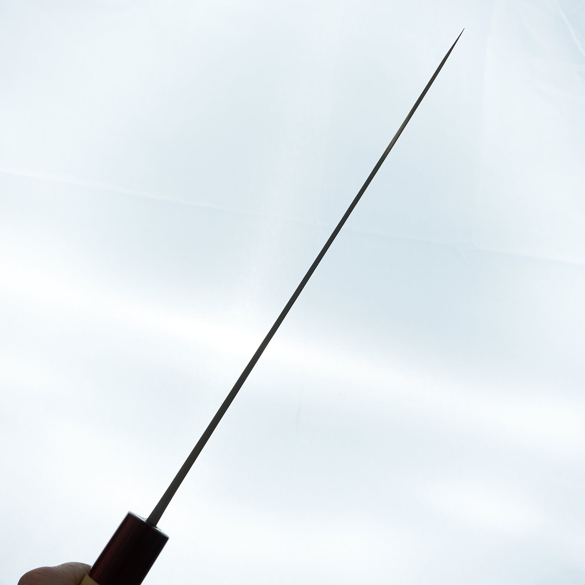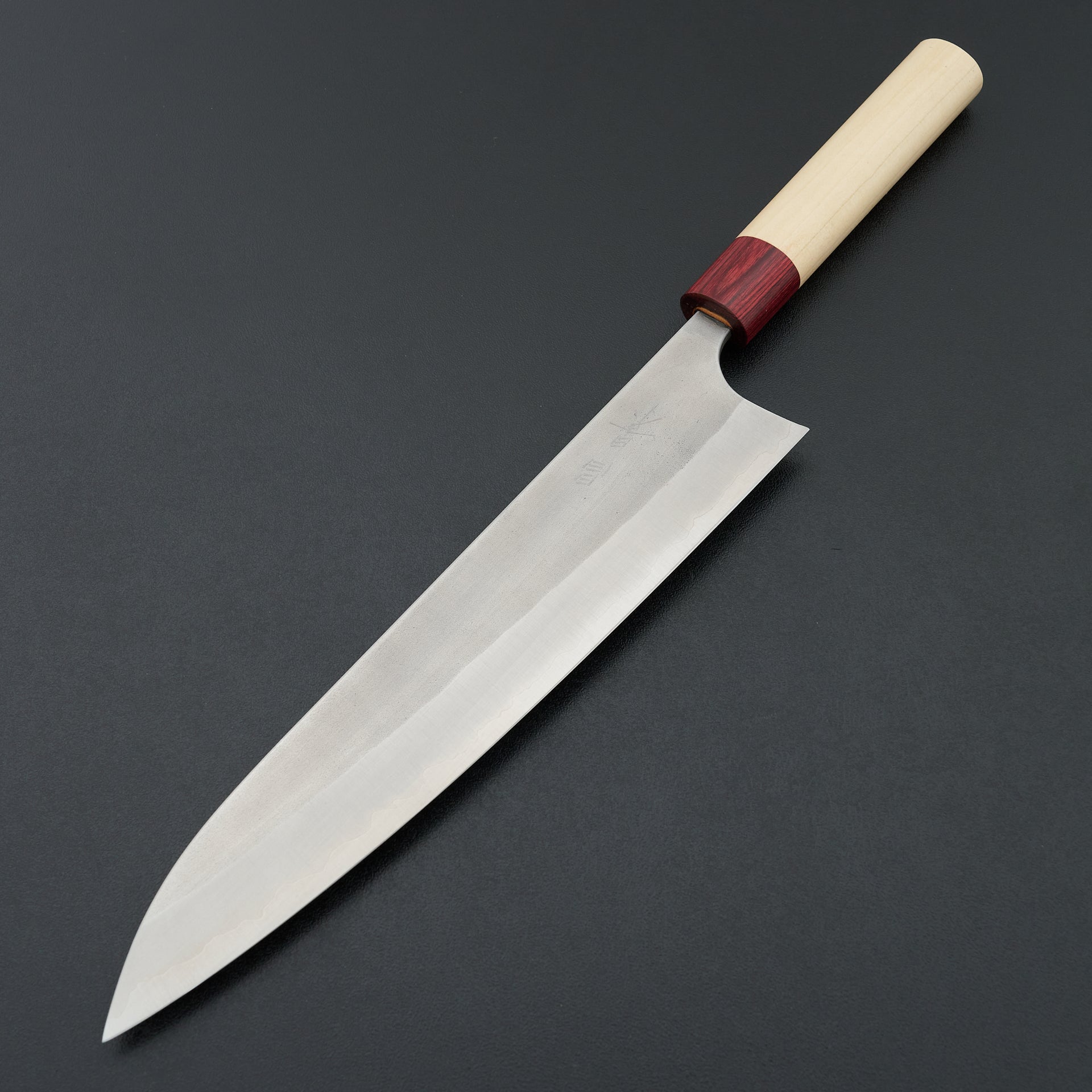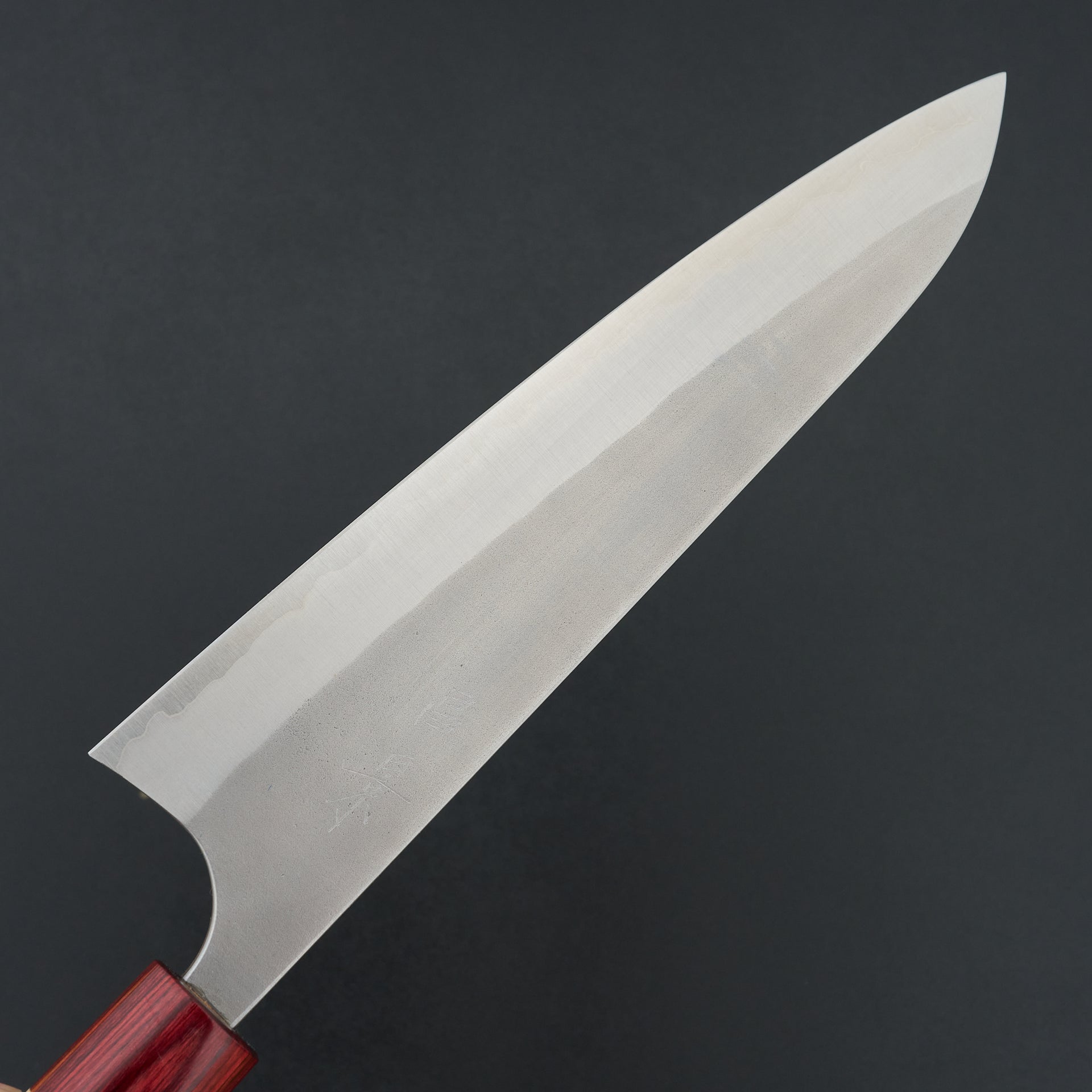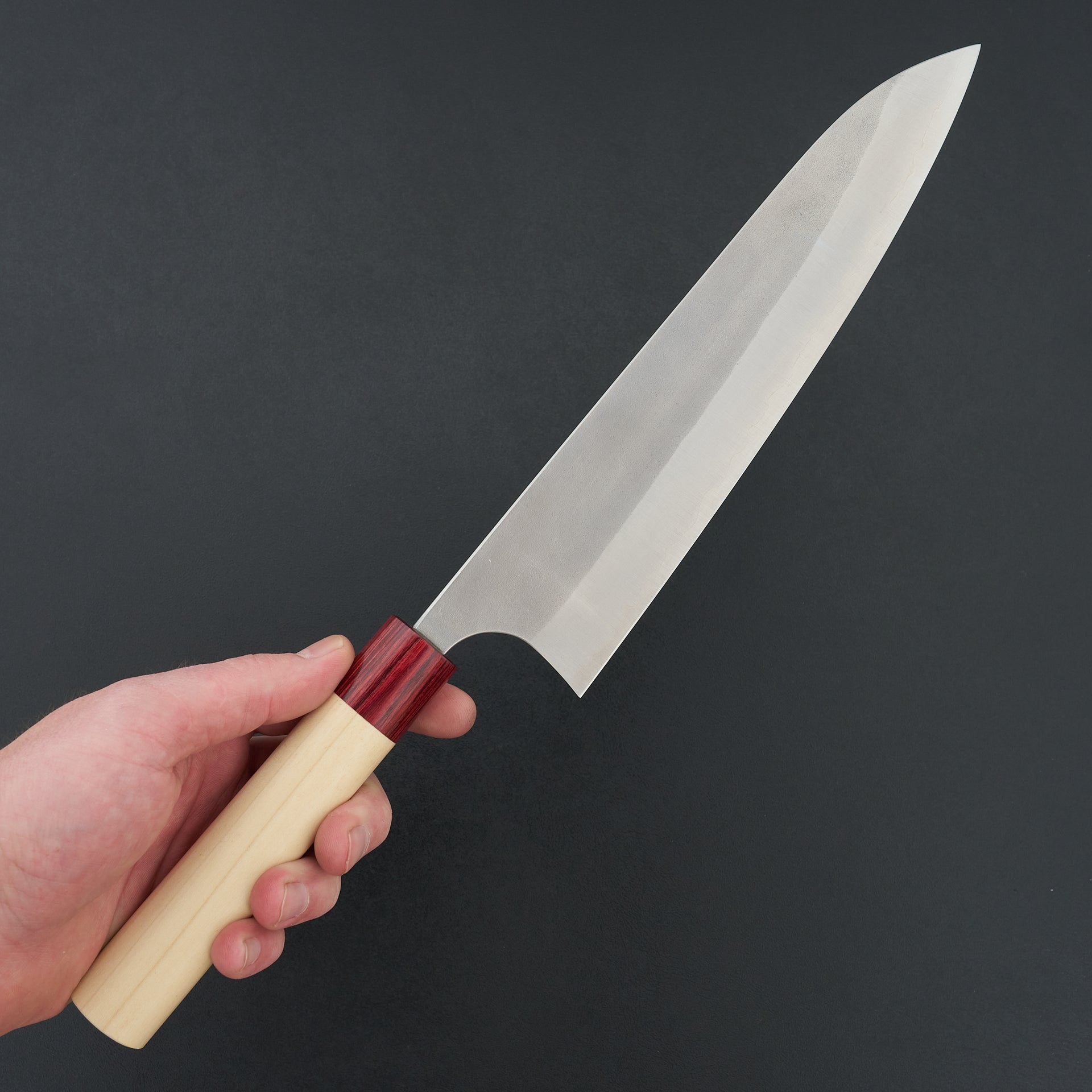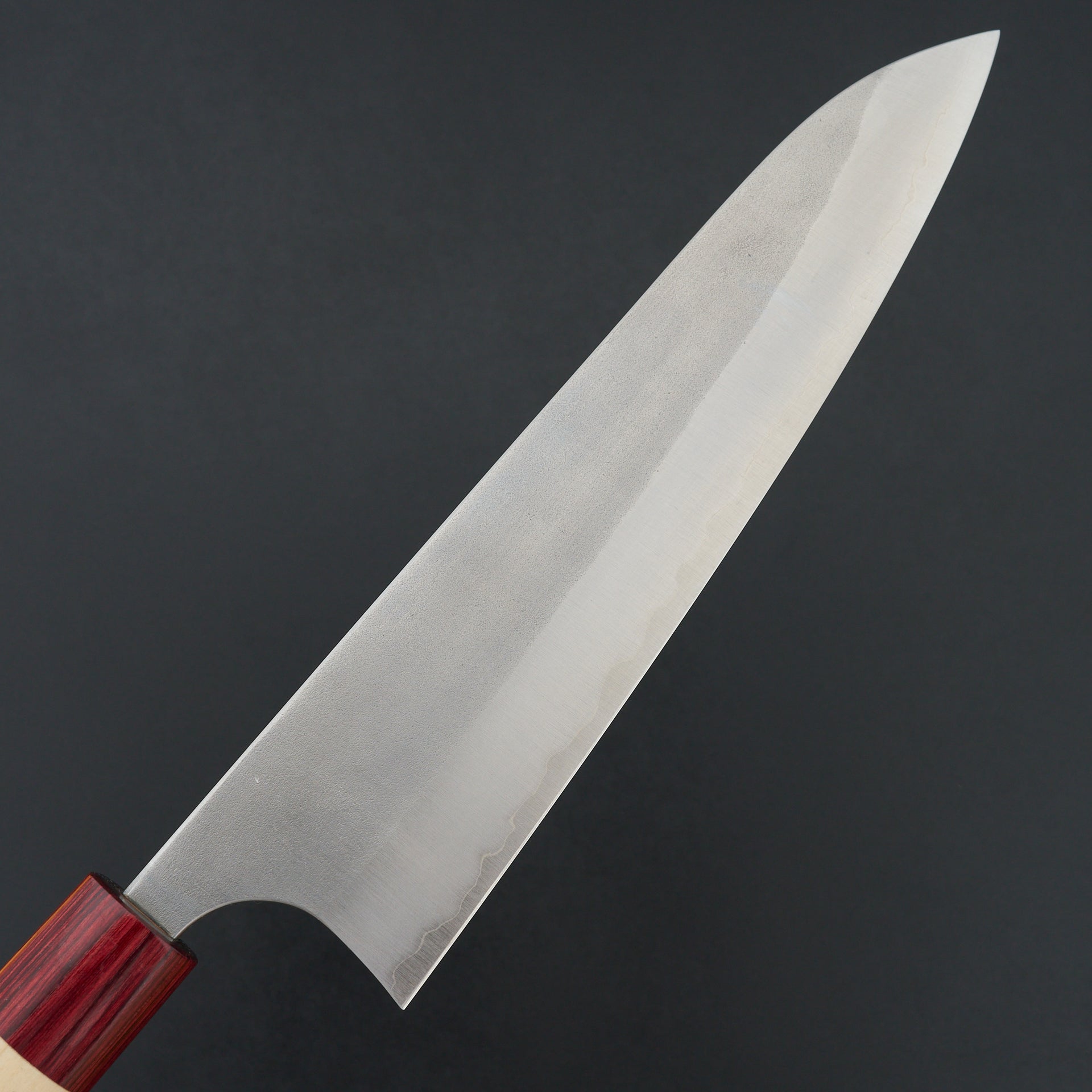 The Masakage Yuki is forged by Yoshimi Kato san out of Shirogami #2 (white) steel. Cladded with stainless steel makes these knives very low maintenance. Workhorse style grinds make this blade a perfect match for a large range of tasks. Shirogami is known for its ability to take a razor sharp edge and ease of sharpening. Hardness rated at 62-63 HRC. Handle is magnolia oval with a red pakka wood ferrule.