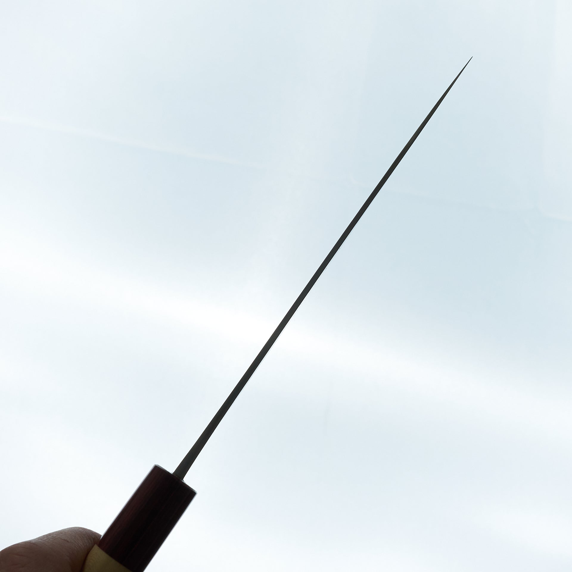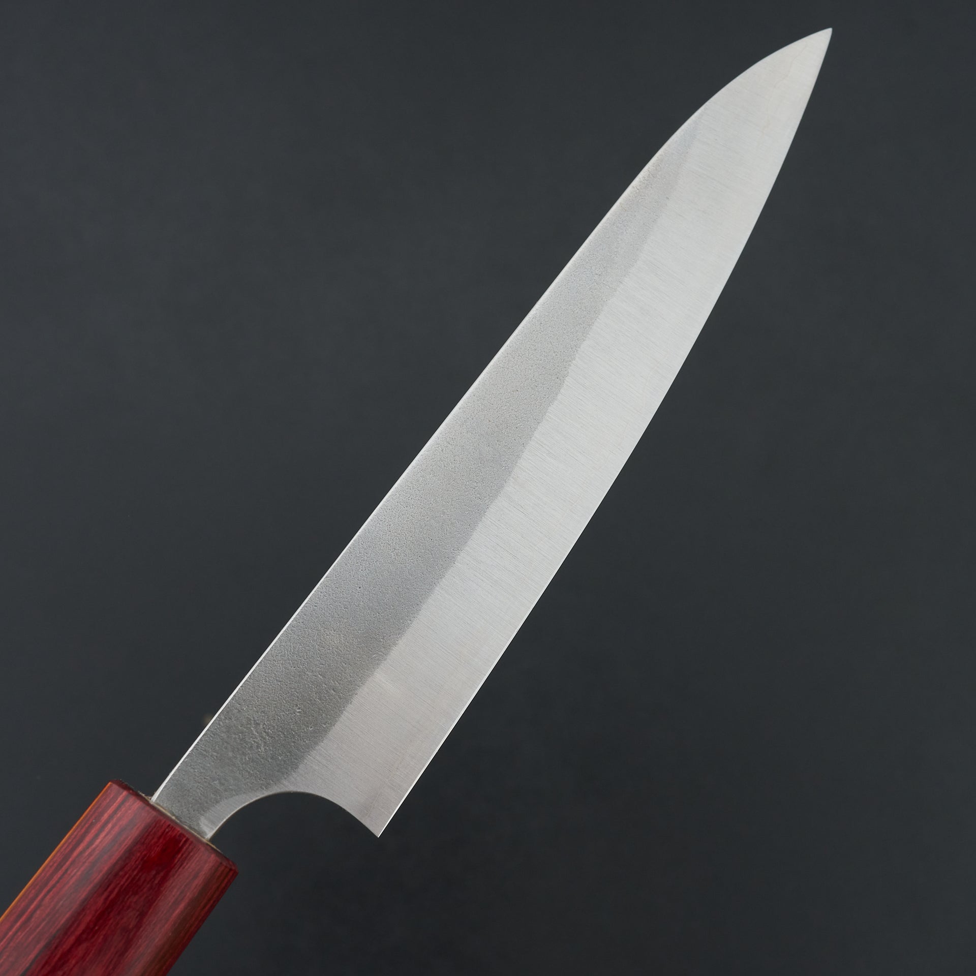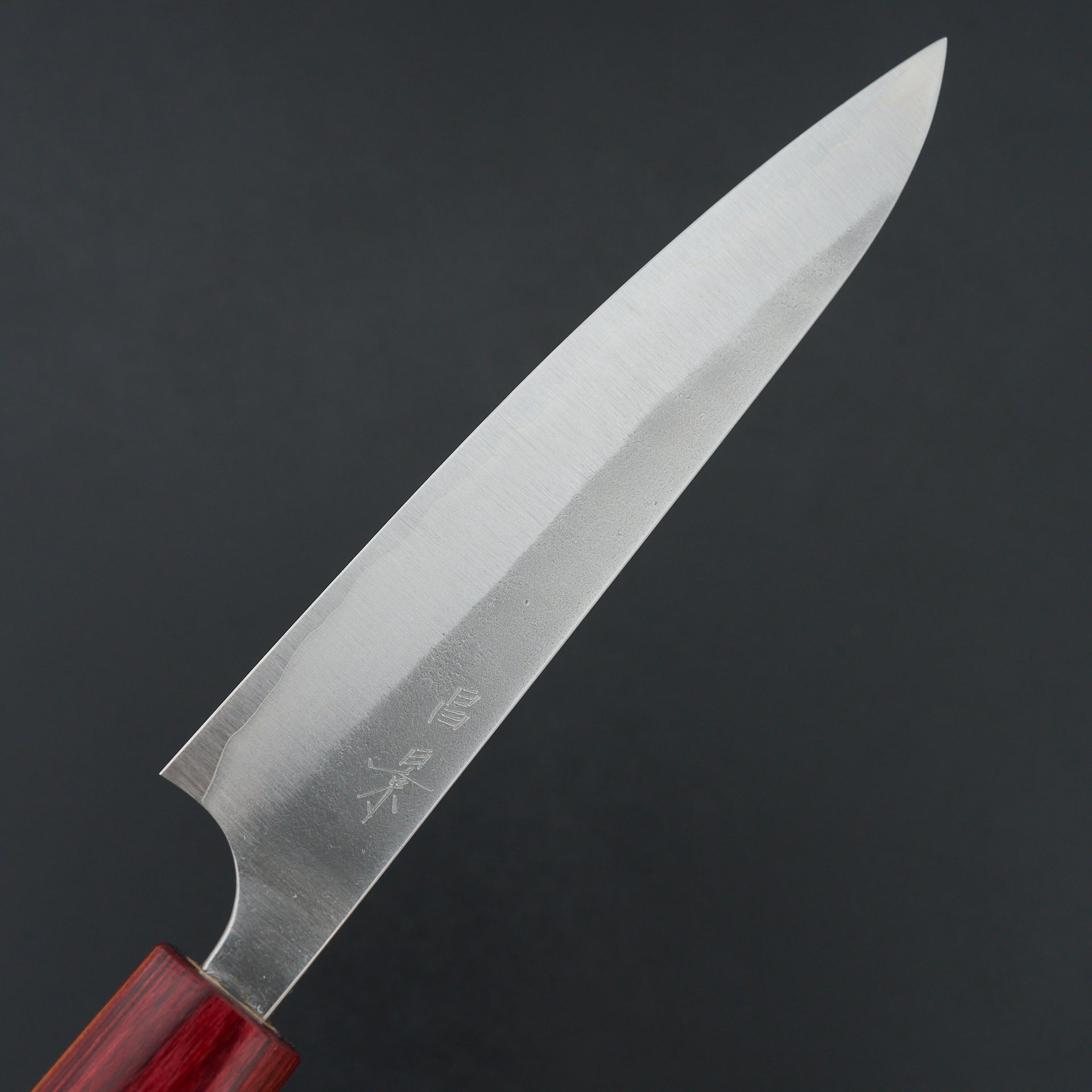 The Masakage Yuki is forged by Yoshimi Kato san out of Shirogami #2 (white) steel. Cladded with stainless steel makes these knives very low maintenance. Workhorse style grinds make this blade a perfect match for a large range of tasks. Shirogami is known for its ability to take a razor sharp edge and ease of sharpening. Hardness rated at 62-63 HRC. Handle is magnolia oval with a red pakka wood ferrule.