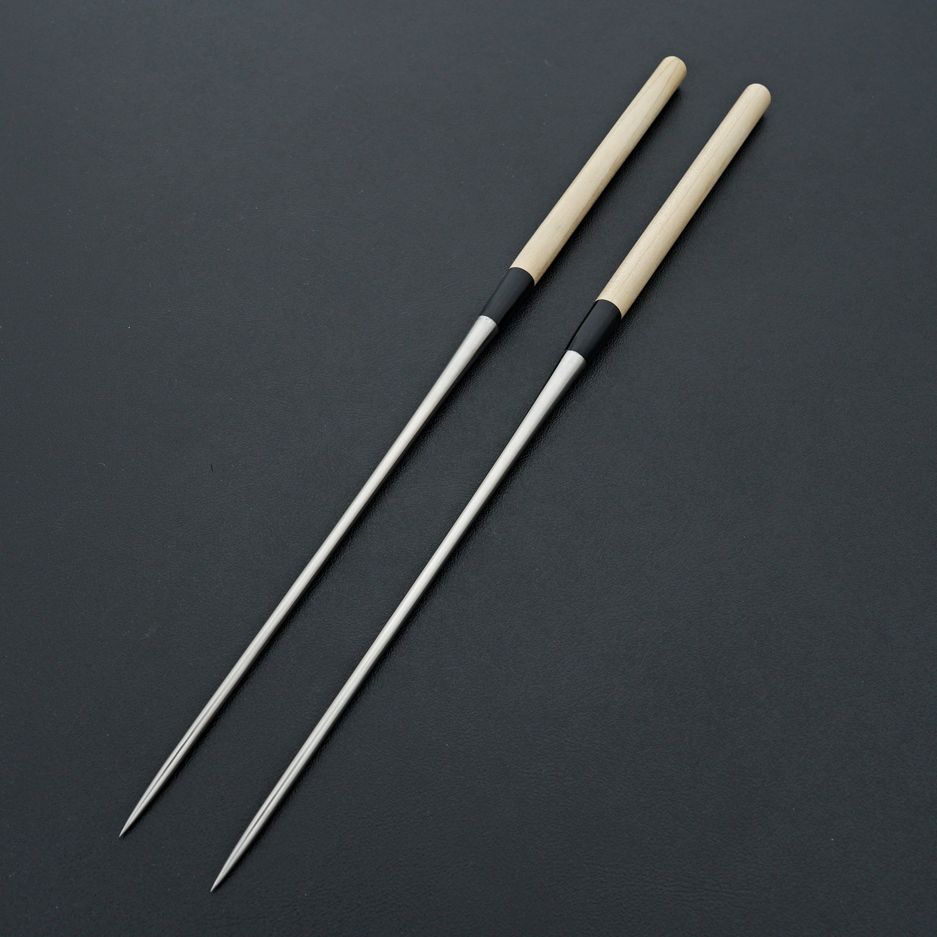 Traditional Japanese plating chopsticks made from Inox stainless steel fitted with oval Hoo (magnolia) wood and black buffalo ferrules.