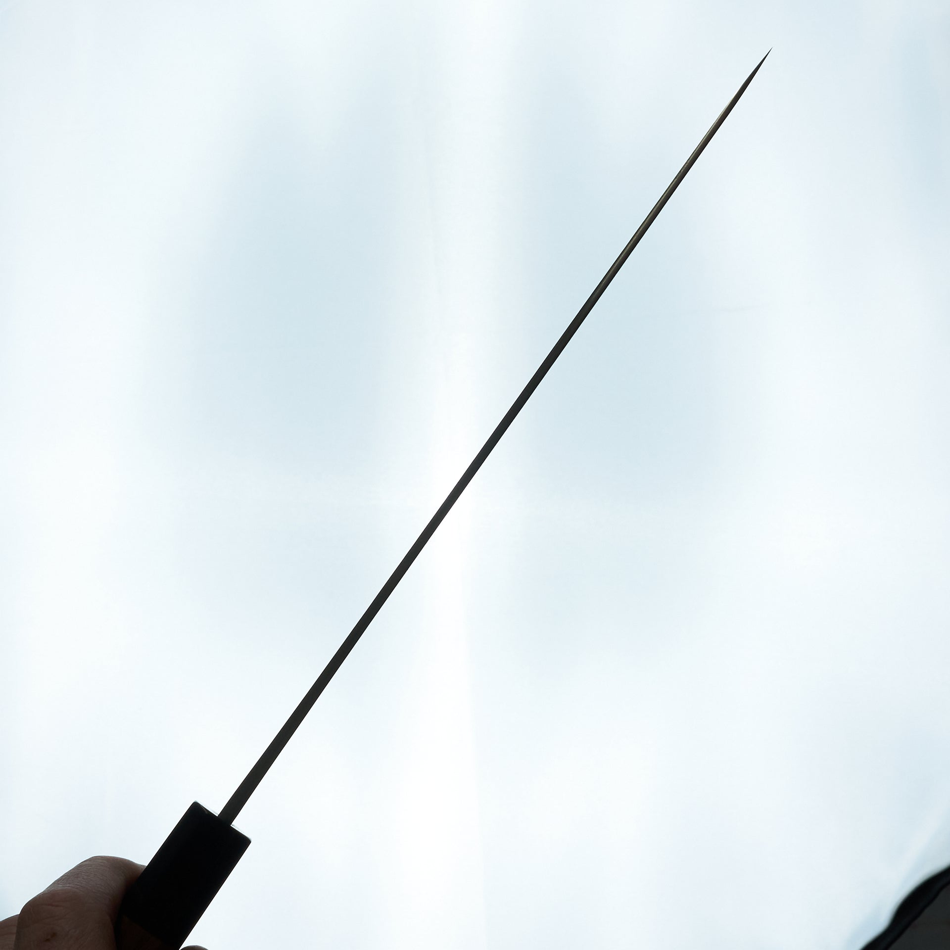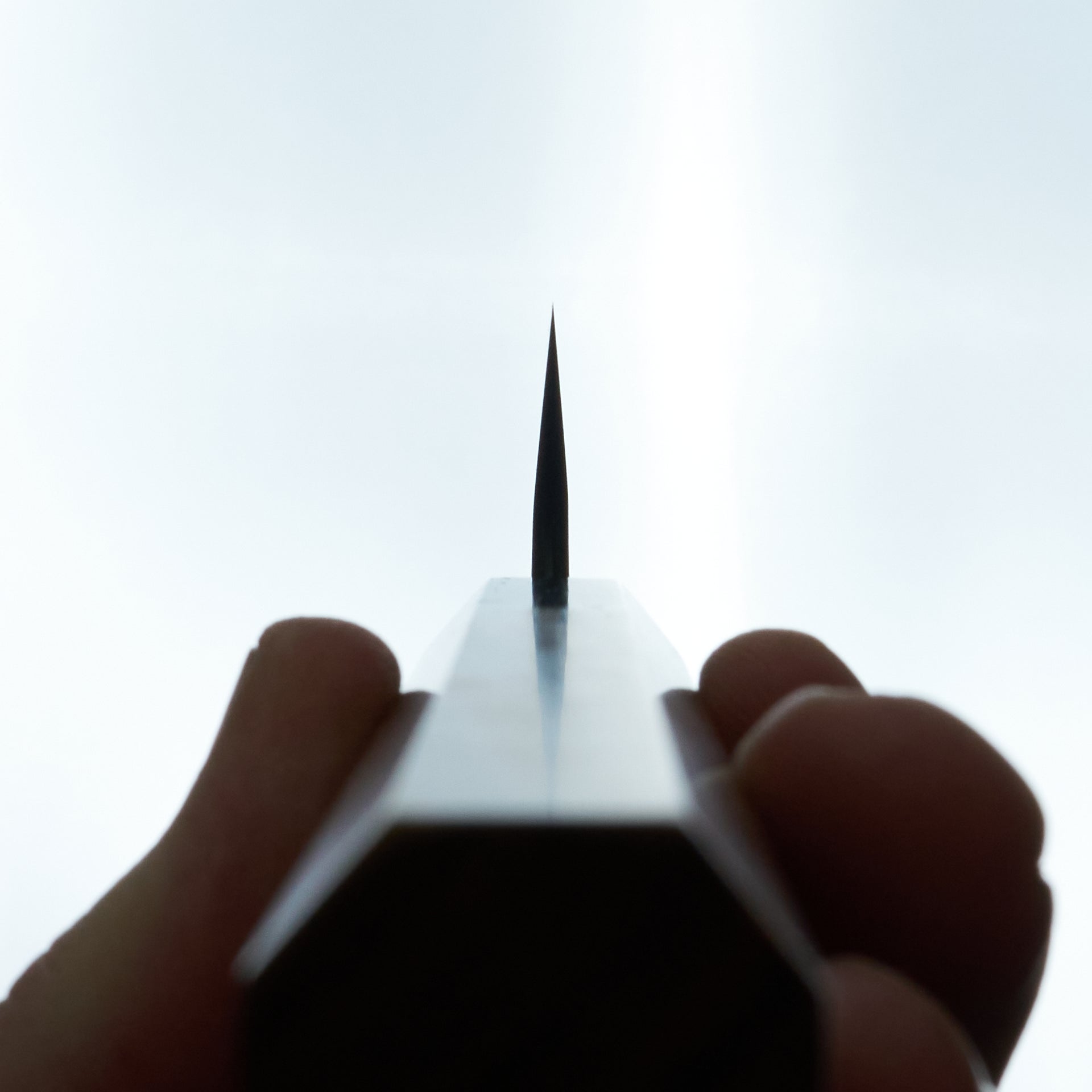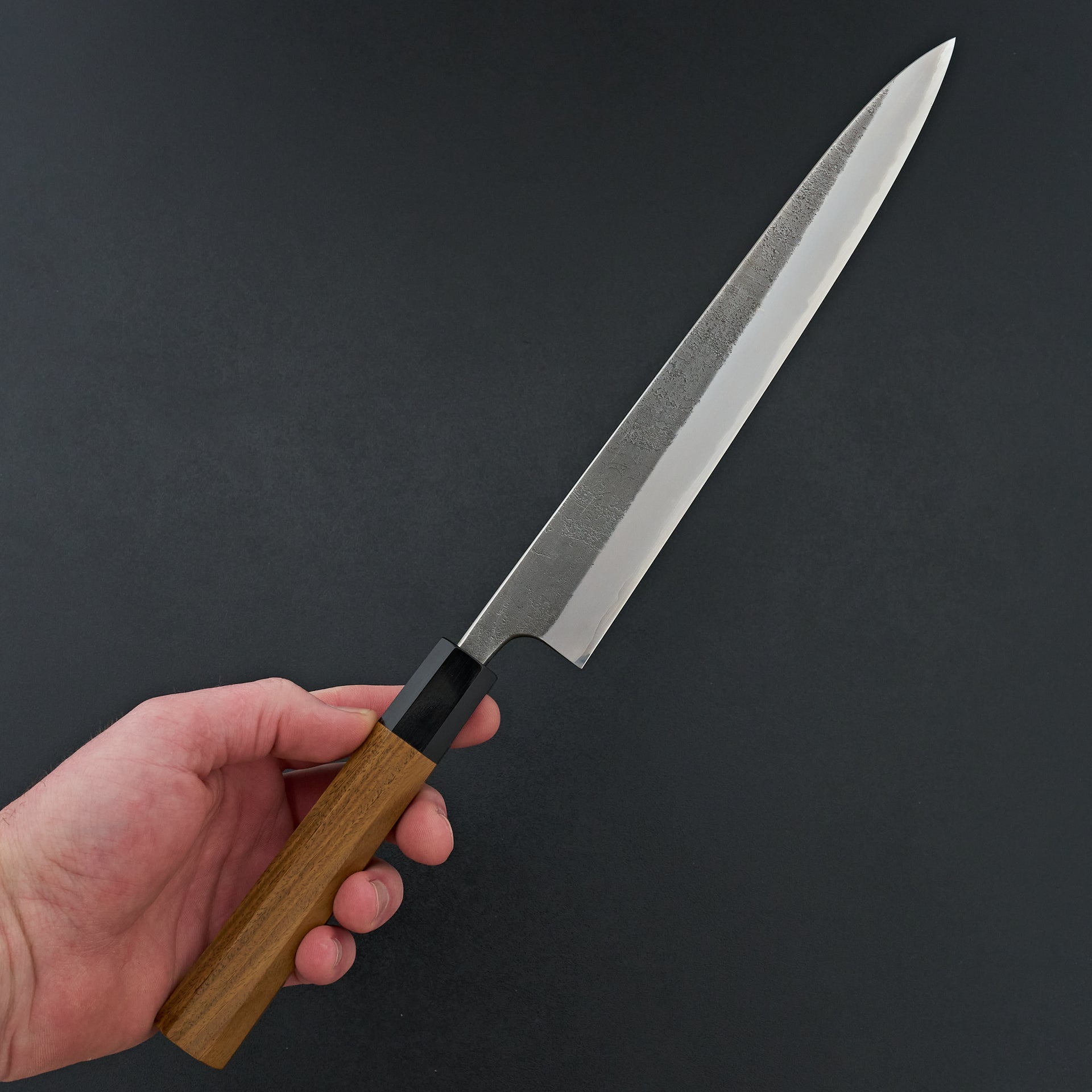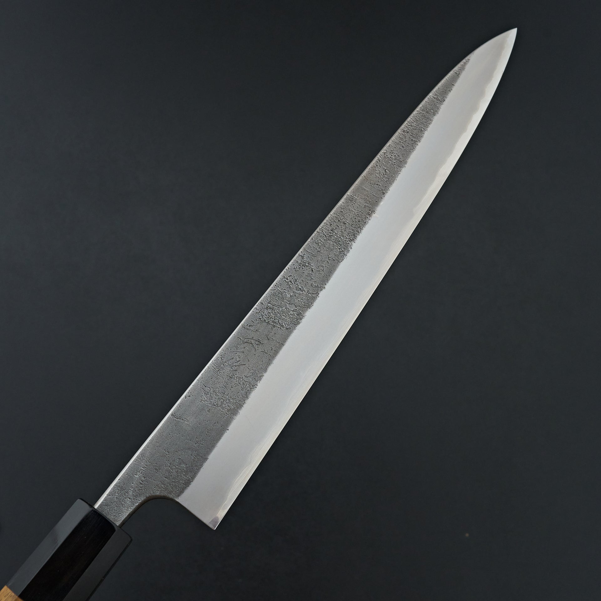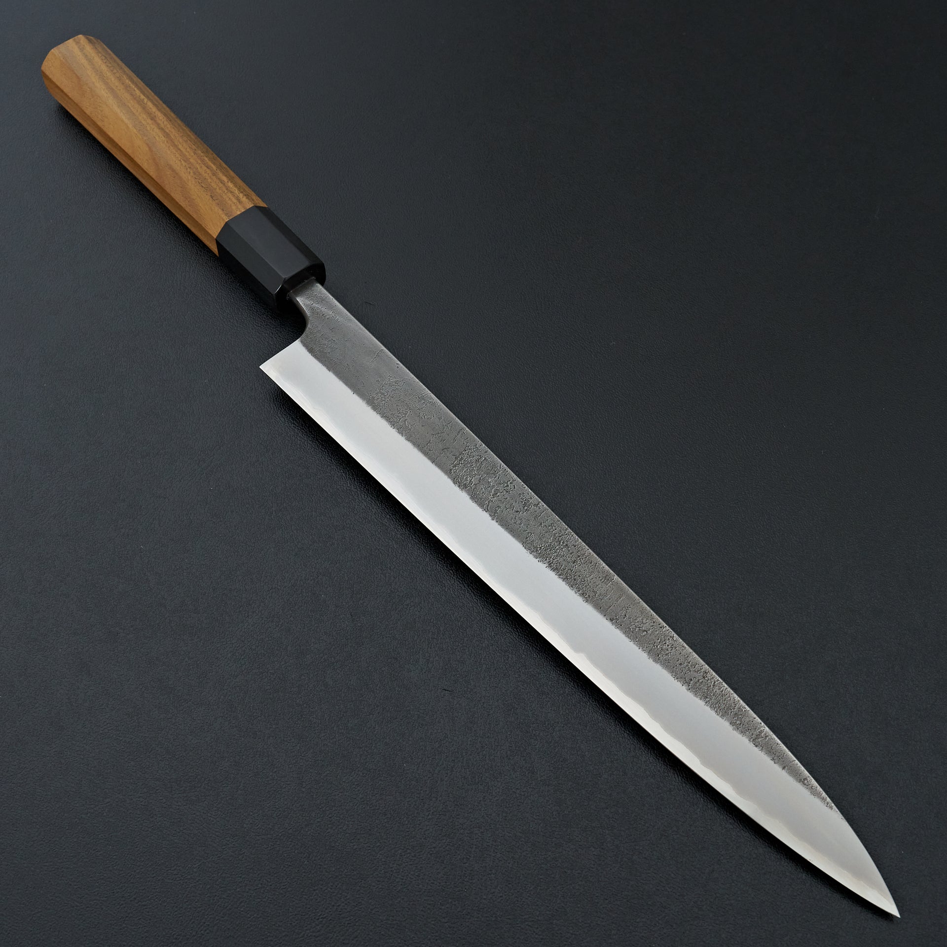 Toshihiro Wakui is a very talented blacksmith who is known for his superb grind and craftmanship. This series is forged from shirogami #2 (white #2) core steel with stainless cladding and a hardness of 63-64 hrc. The blades are very thin behind the edge while still retaining a stiffness at the spine. Wakui's blades have a very enjoyable cutting feel and move through ingredients with ease. Handle is octagonal Palo Santo and horn ferrule.