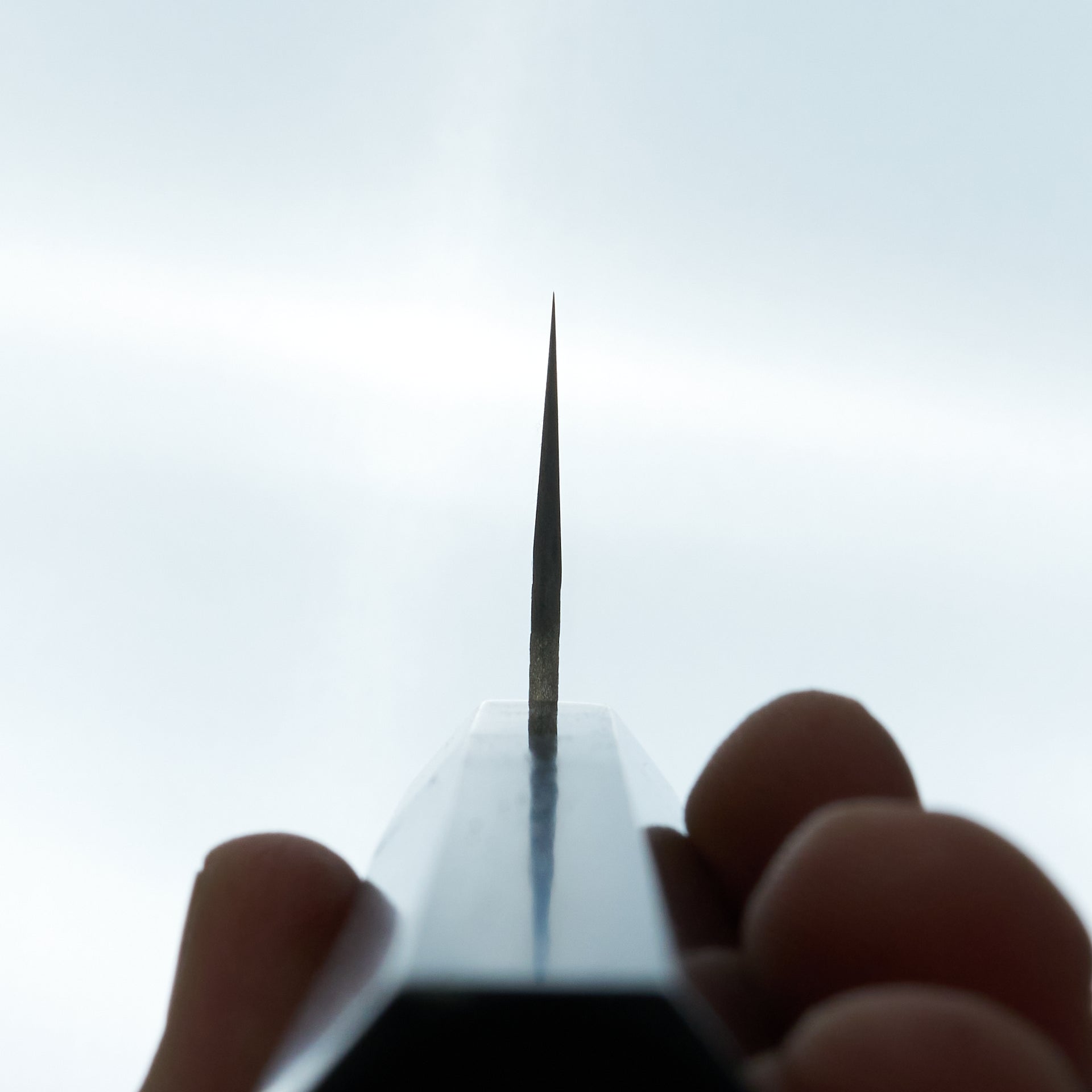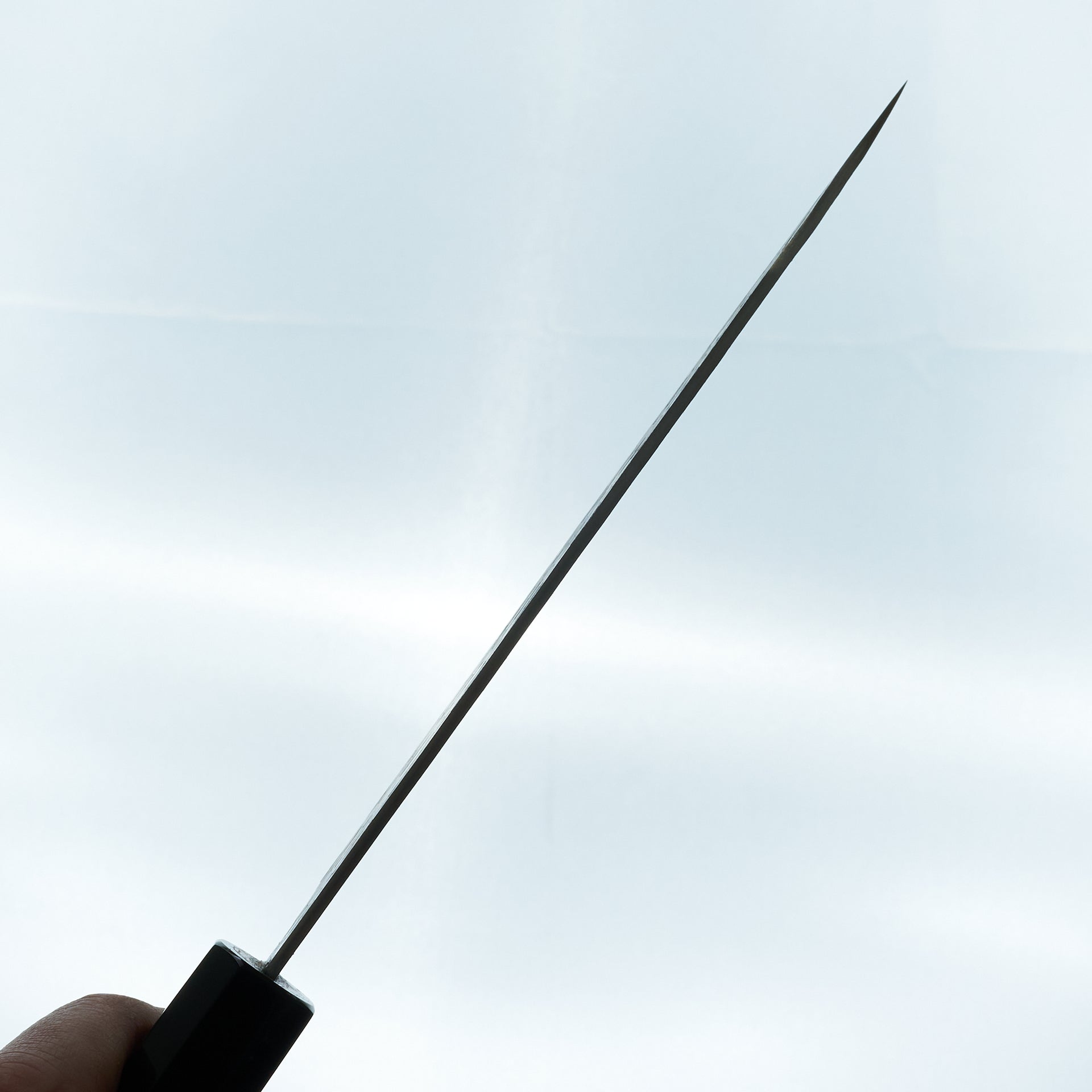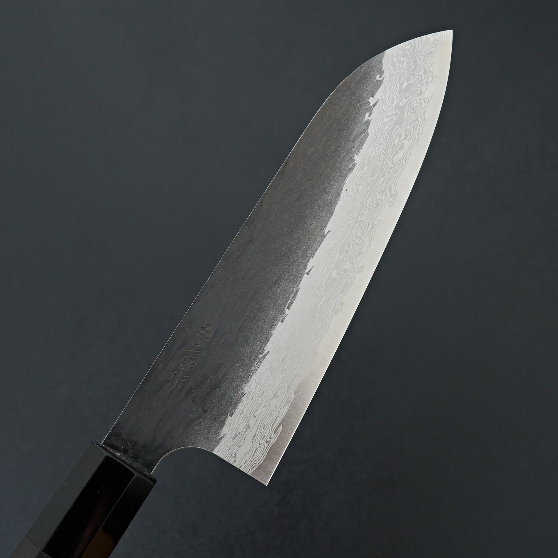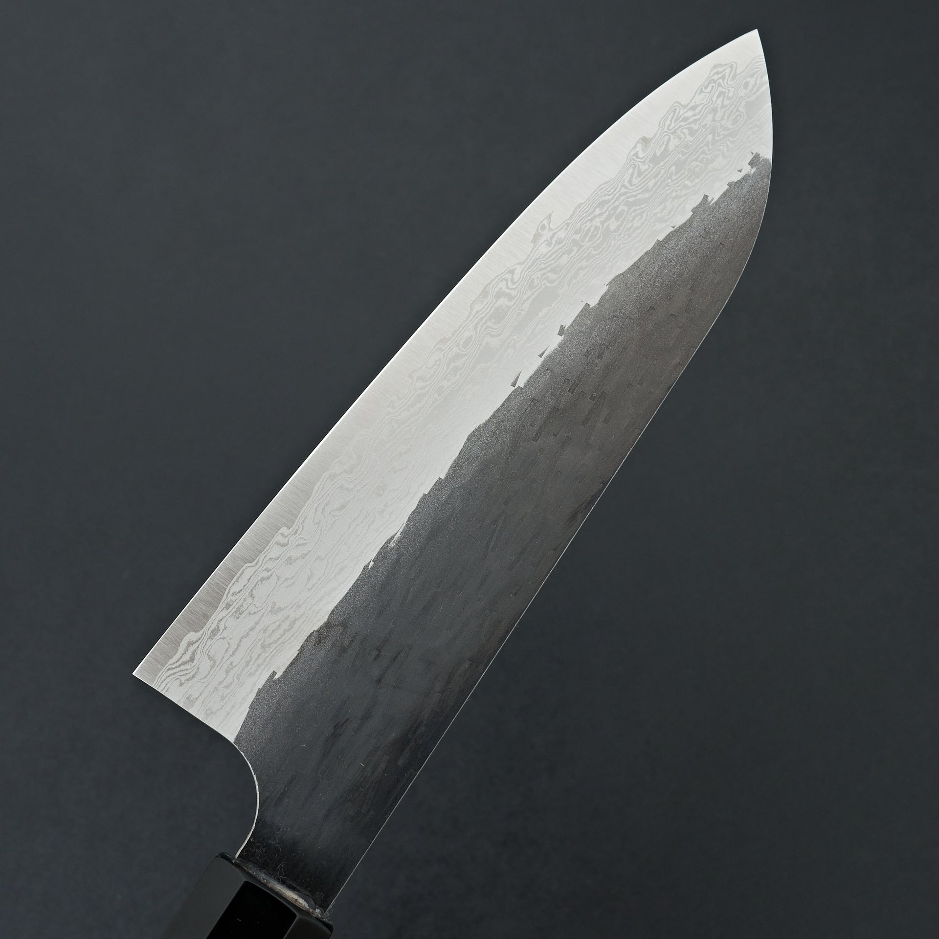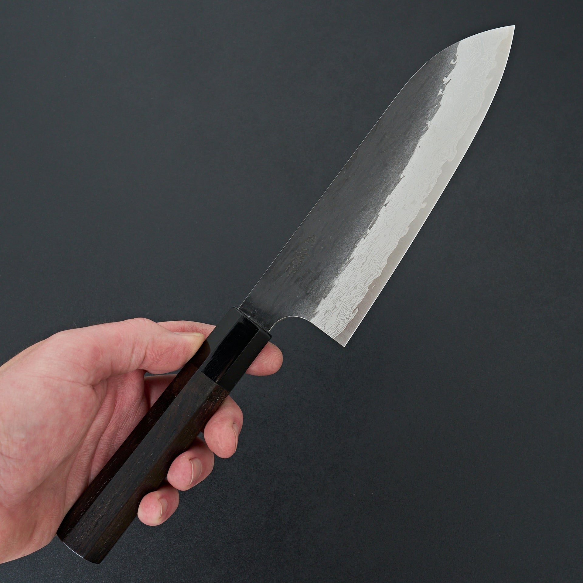This blade is forged from VG Xeos steel laminated in damascus with a kurouchi finish. The blade face is finished with a light hammered pattern. These have improved sharpenability and edge retention over VG10 while still being a very well rounded and durable steel. These have a medium weight feel but still very performance focused in terms of cutting feel. Fitted with octagonal ebony handle and horn ferrule.