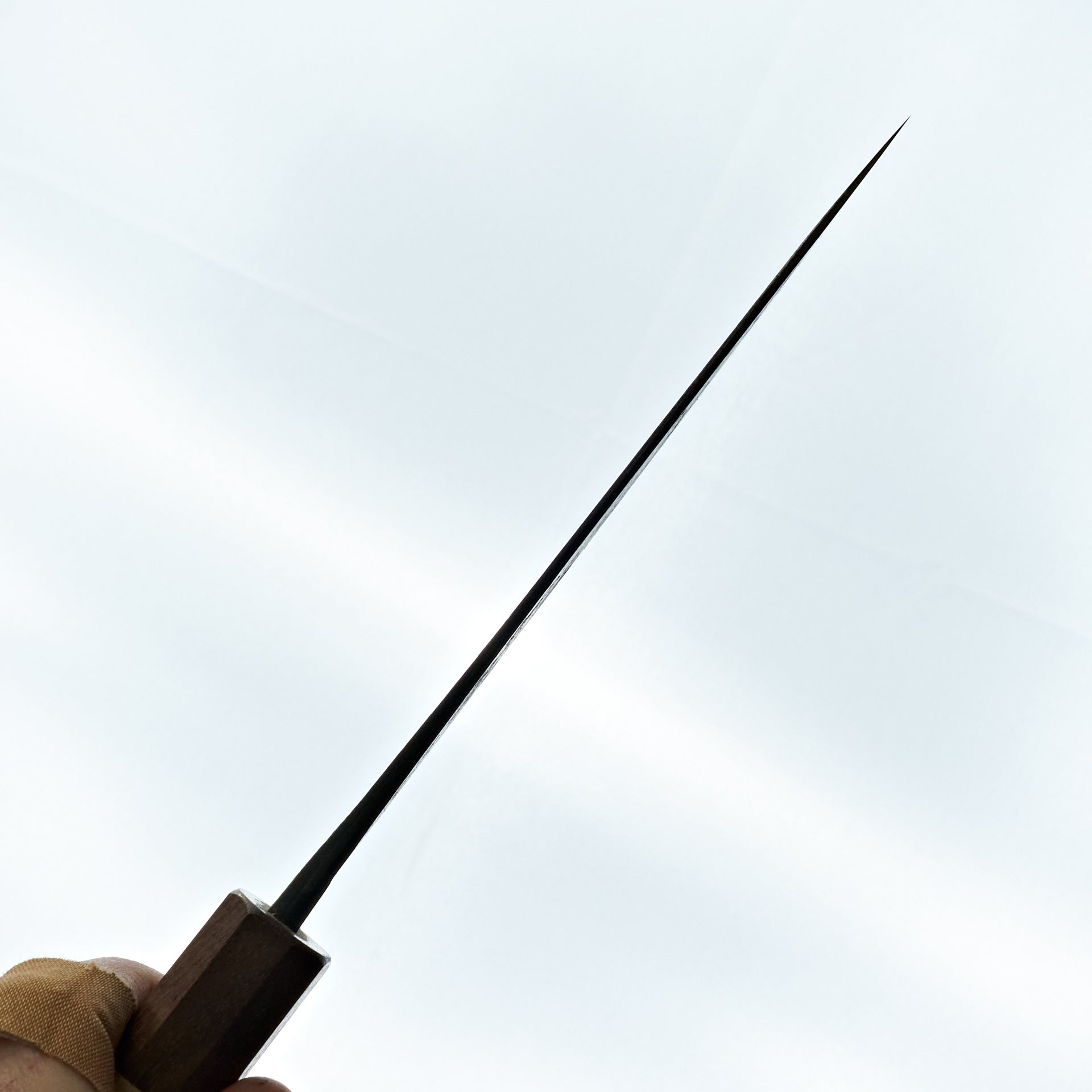 He focuses primarily on forging Shirogami (White) #2 carbon steel cladded in iron. The nashiji kurouchi displays all of the character and detail that happens during the forging process. The bevels are finished by hand on Japanese whetstones to ensure an even grind and geometry. The forged distal taper is quite impressive and has a nice progressive thinness towards the tip. Lightly convexed bevels and very thin behind the cutting edge. The octagonal handle is made from magnolia and walnut ferrule.