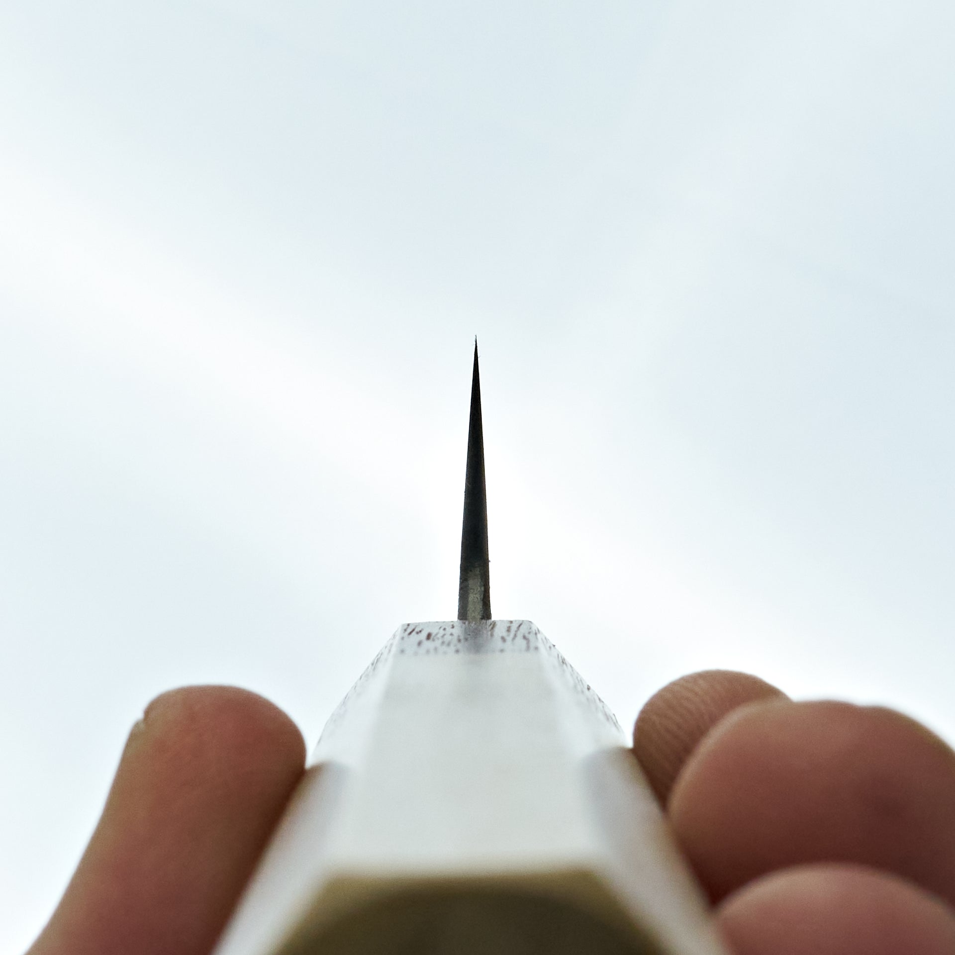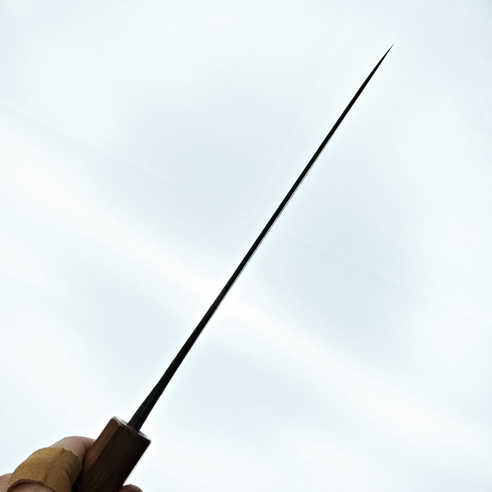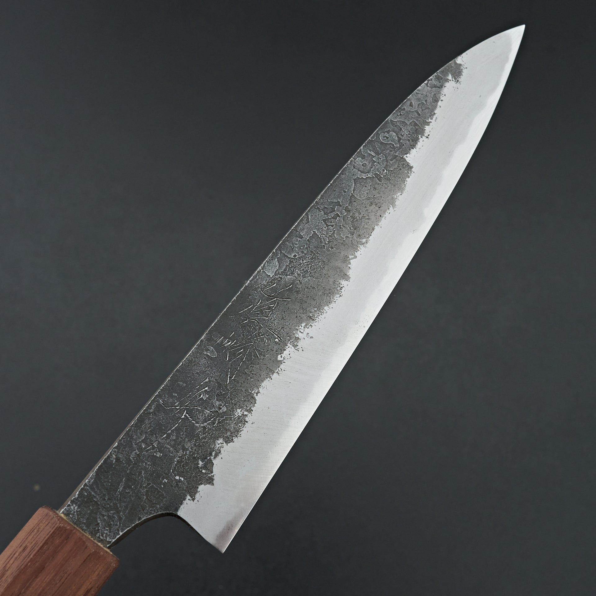 He focuses primarily on forging Shirogami (White) #2 carbon steel cladded in iron. The nashiji kurouchi displays all of the character and detail that happens during the forging process. The bevels are finished by hand on Japanese whetstones to ensure an even grind and geometry. The forged distal taper is quite impressive and has a nice progressive thinness towards the tip. Lightly convexed bevels and very thin behind the cutting edge. The octagonal handle is made from magnolia and walnut ferrule.