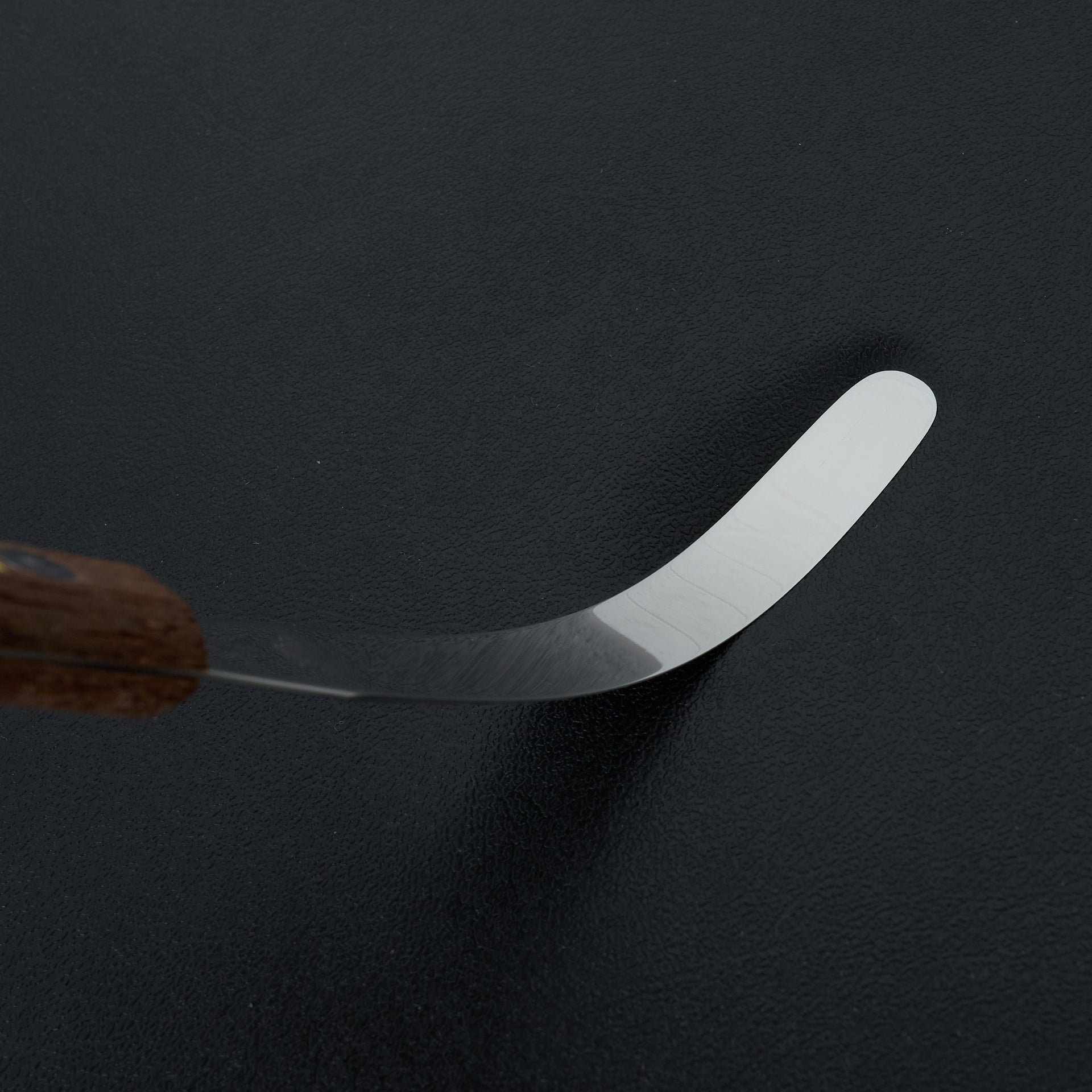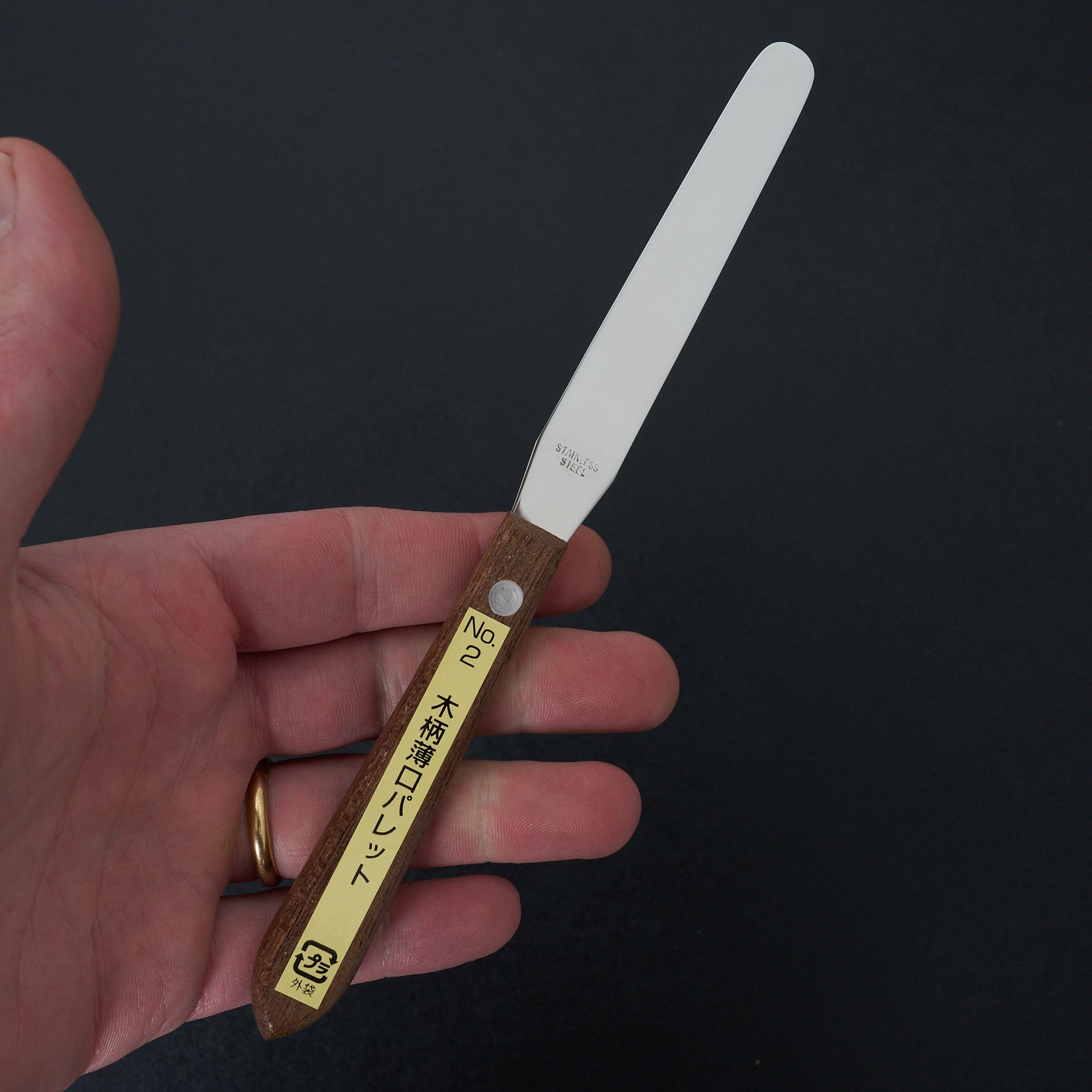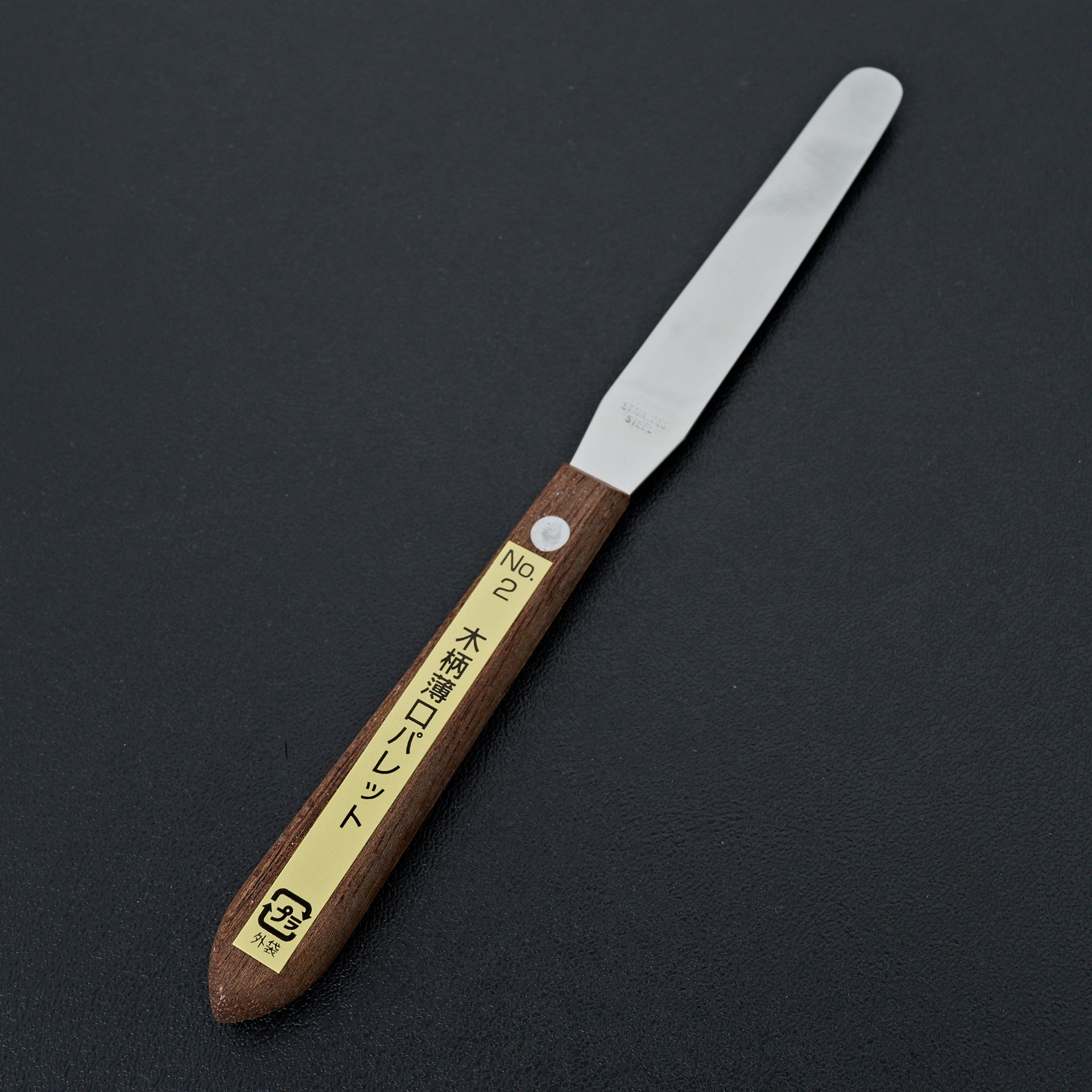 Made from stainless steel with wooden riveted handle. Very flexible blade for spreading and detail work. Made in Japan.