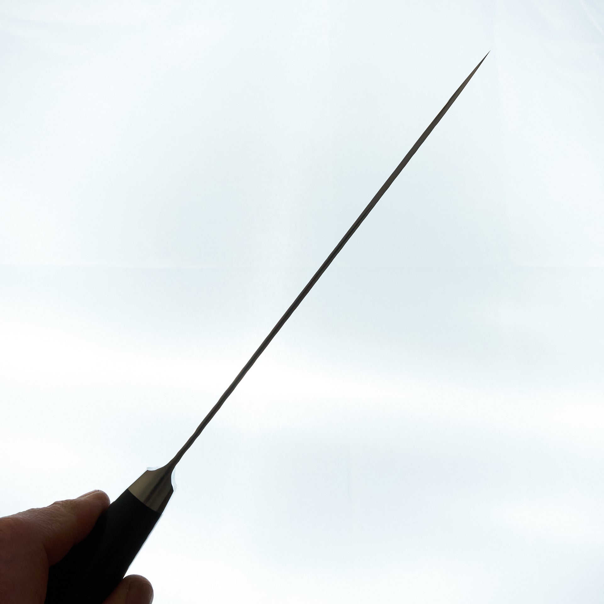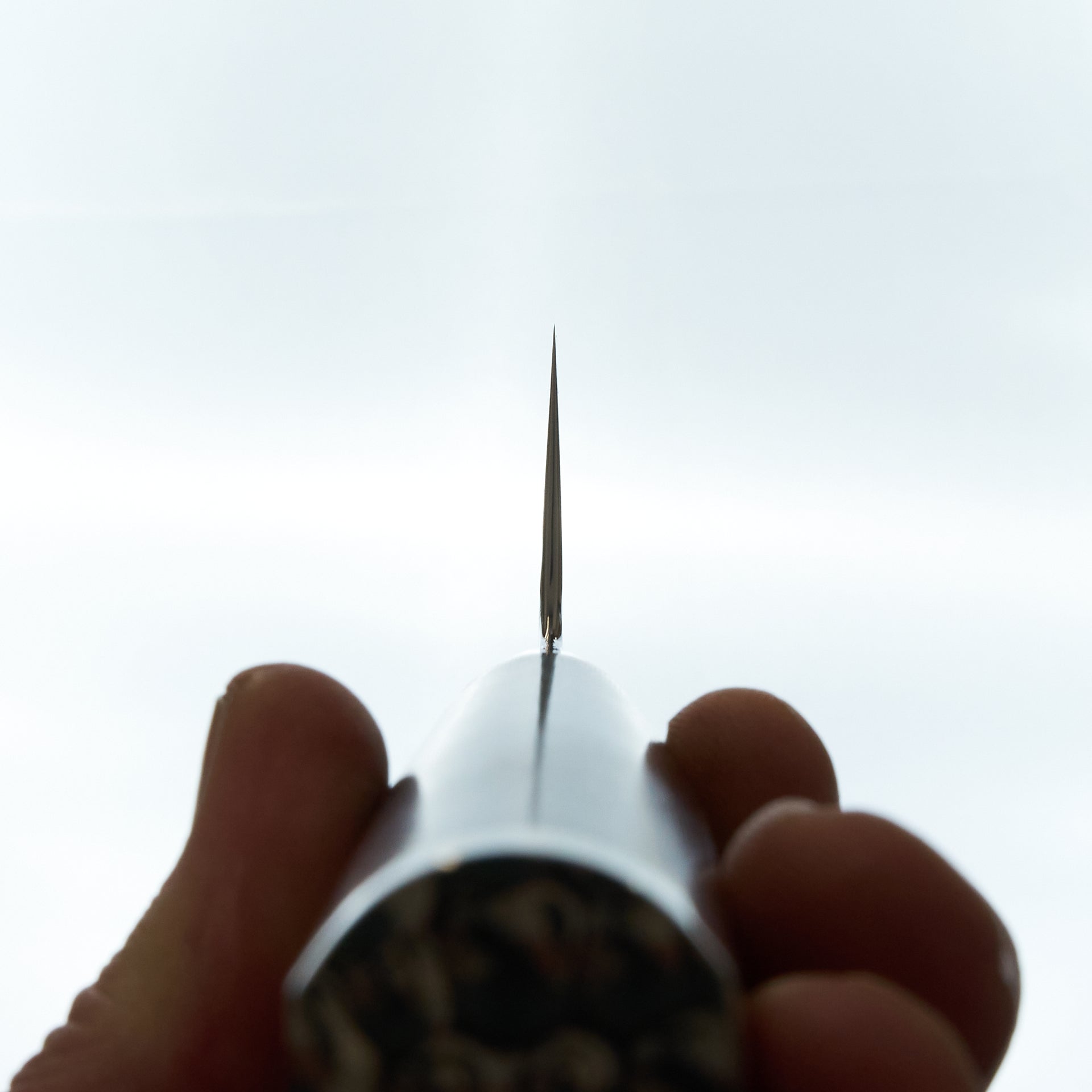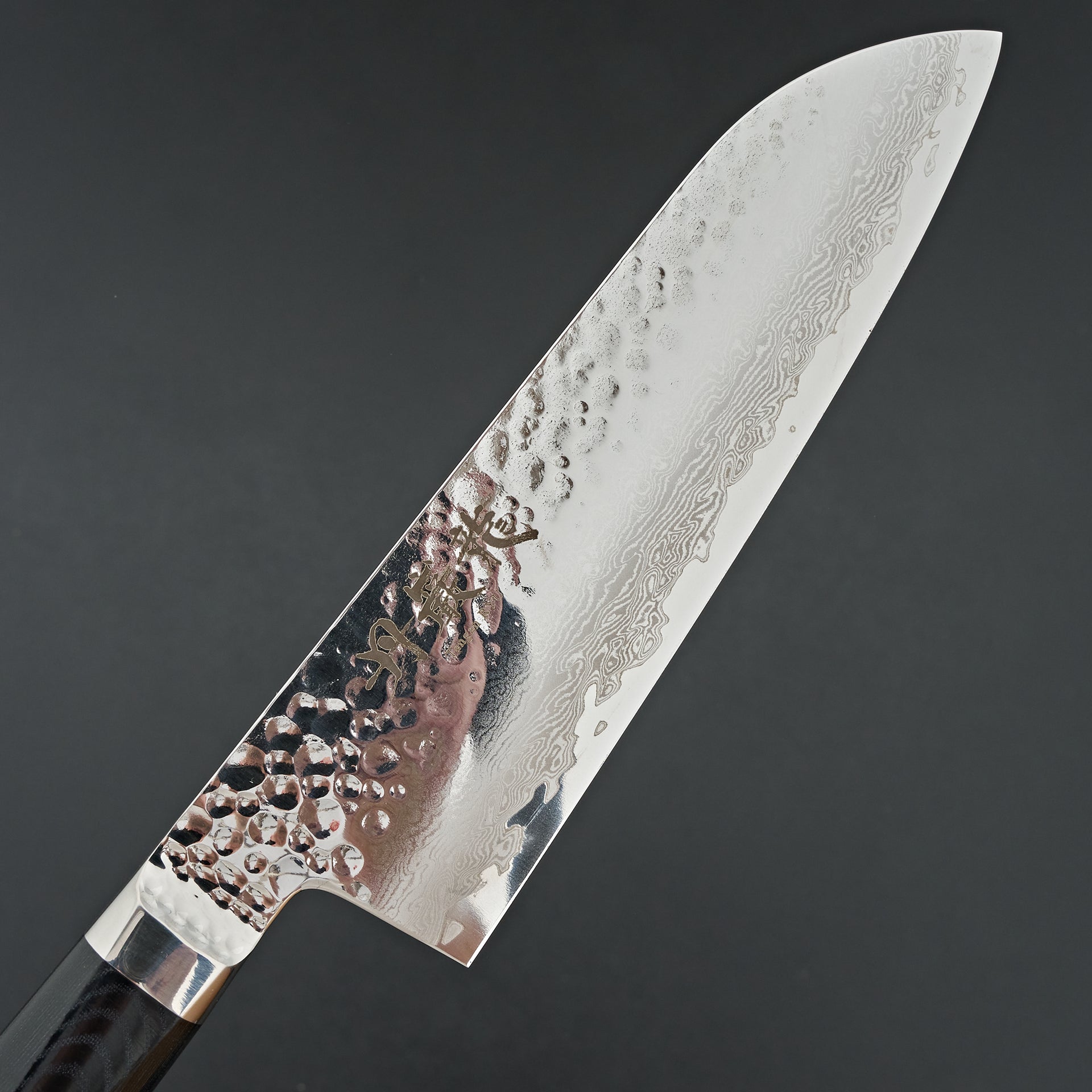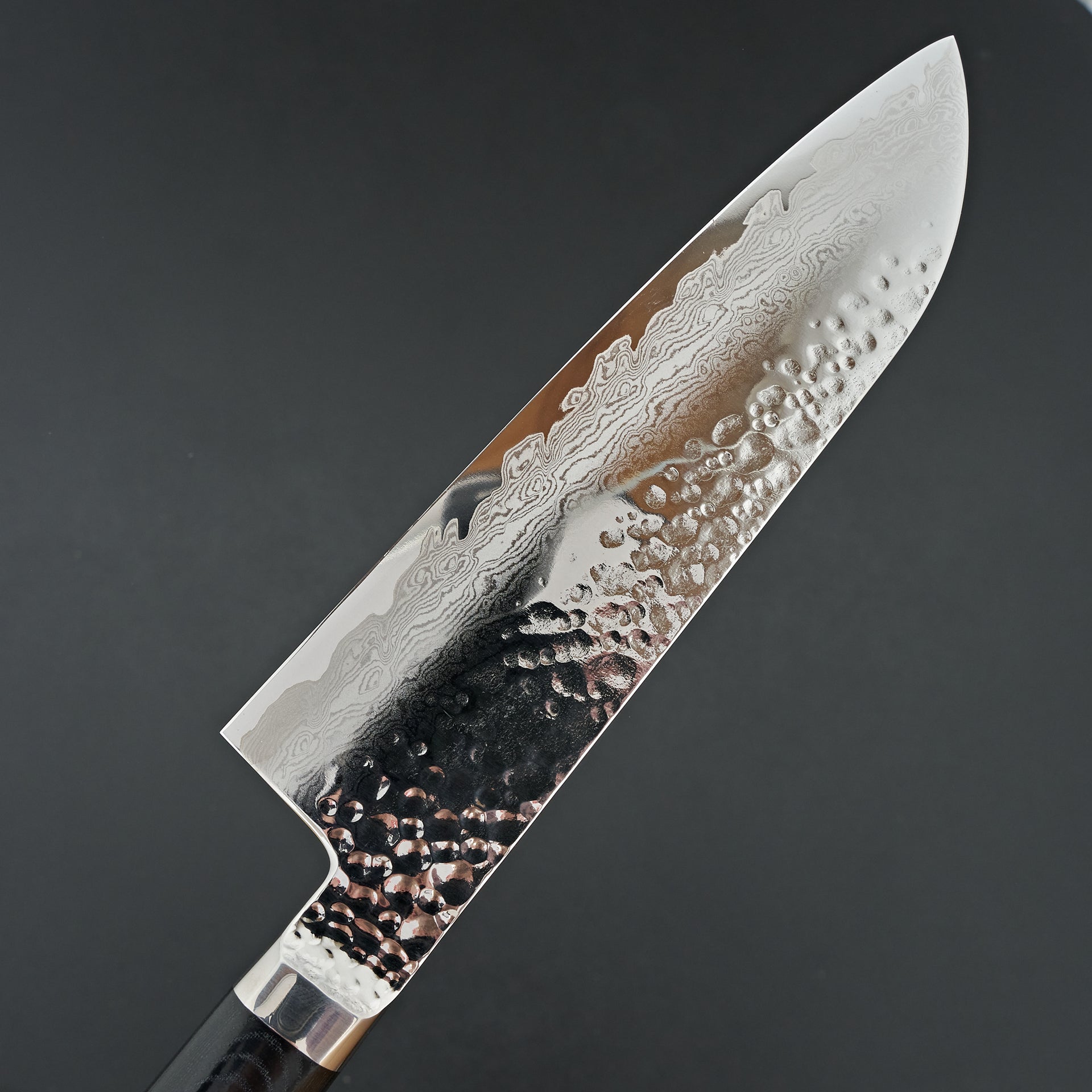 The Tanganryu series is forged from VG-10 core steel heat treated to 60 hrc, laminated in 67 layer damascus and a hammered finish on the blades surface. The finishing work on this series is absolutely top notch with every surface accounted for and polished. The handle is a hybrid style with a weighted feel like a western handle but with japanese geometry, giving the blade a very balanced feel. The handle material is black micarta which is extremely durable and very easy to care for.