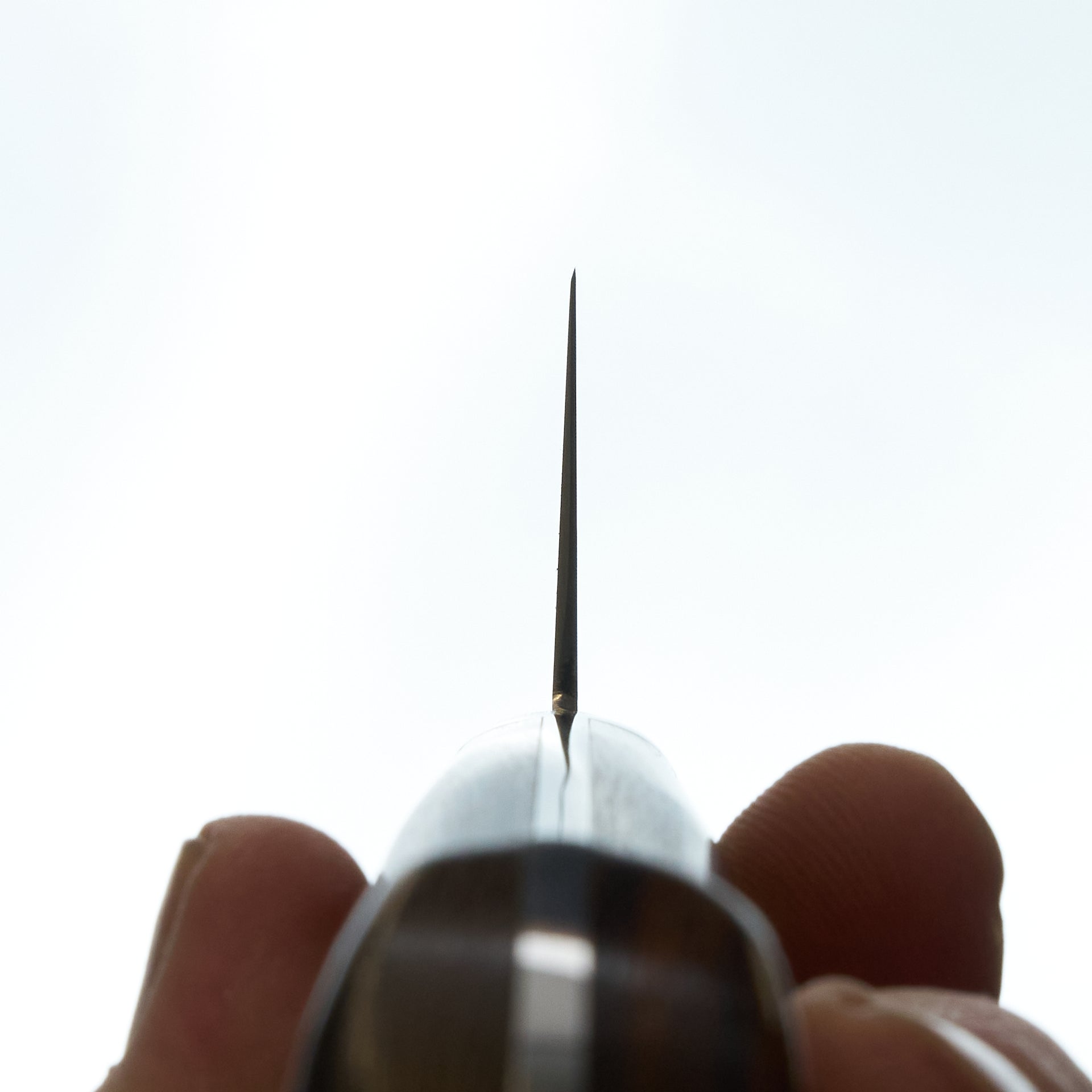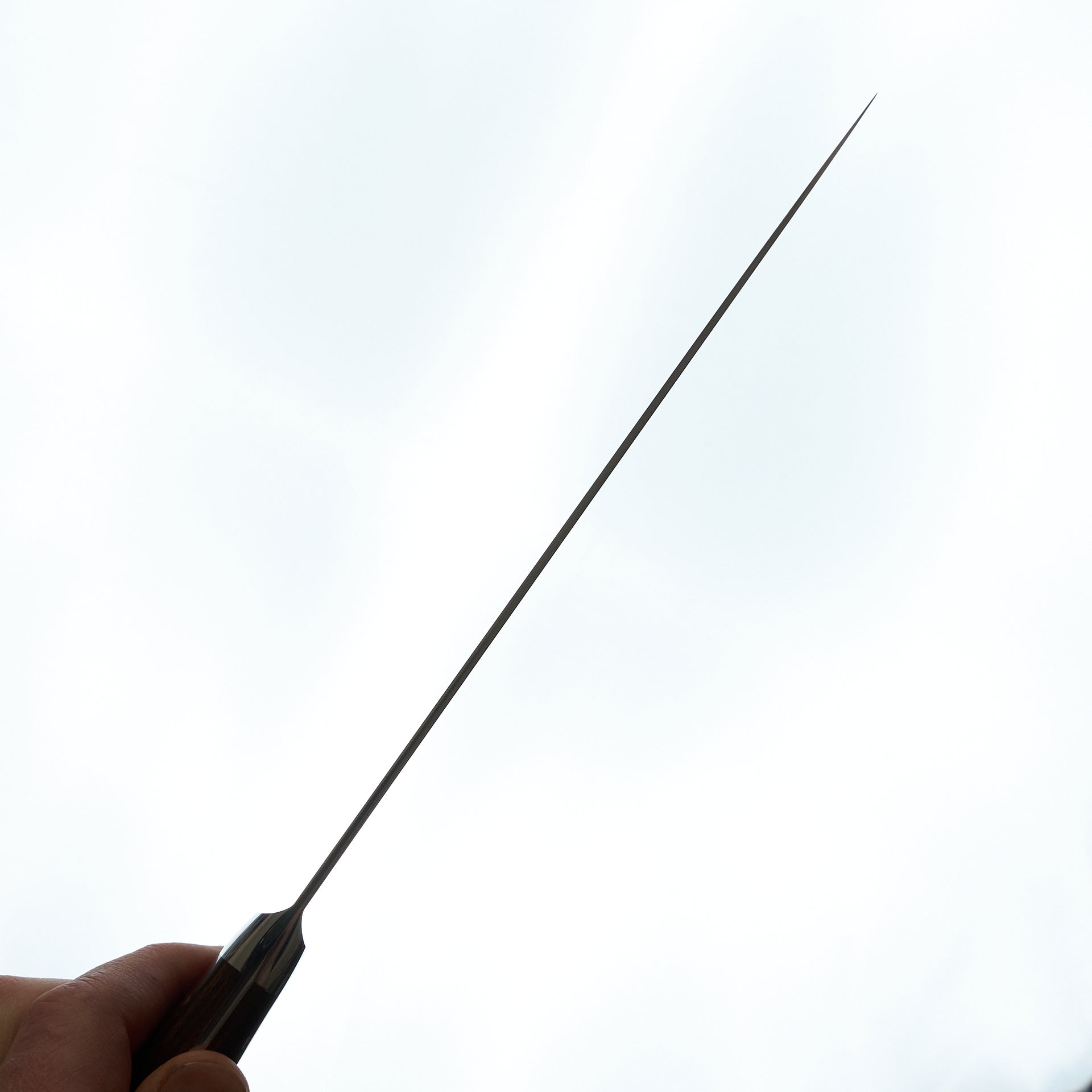 Grand Chef Series SP by Sakai Takayuki is a professional series of knives using high grade Bohler-Uddeholm stainless steel hardened to 61 HRC. This steel has very fine grain, good toughness and excellent edge life. Many professionals adore this series for its long lasting edge. The blade is ground thin and the blade face is hollow ground on the right side for excellent food release. The riveted western handle is made from Arizona desert ironwood, crafted by woodworker Sugihara.