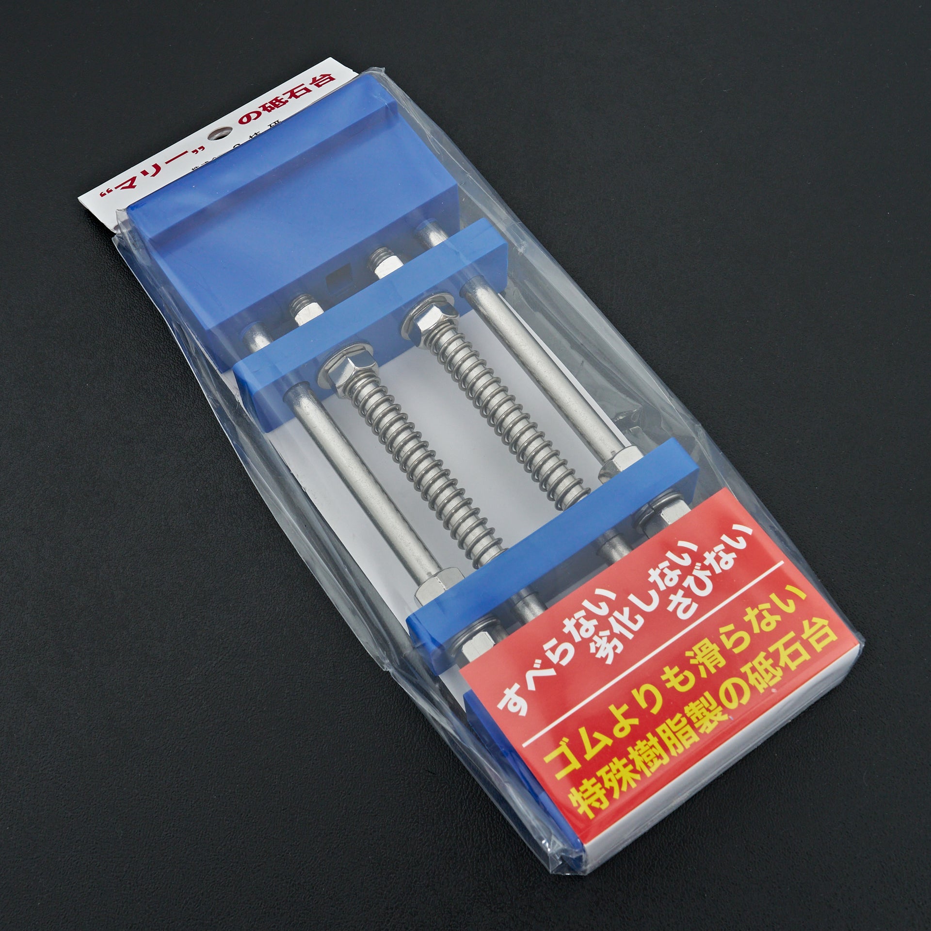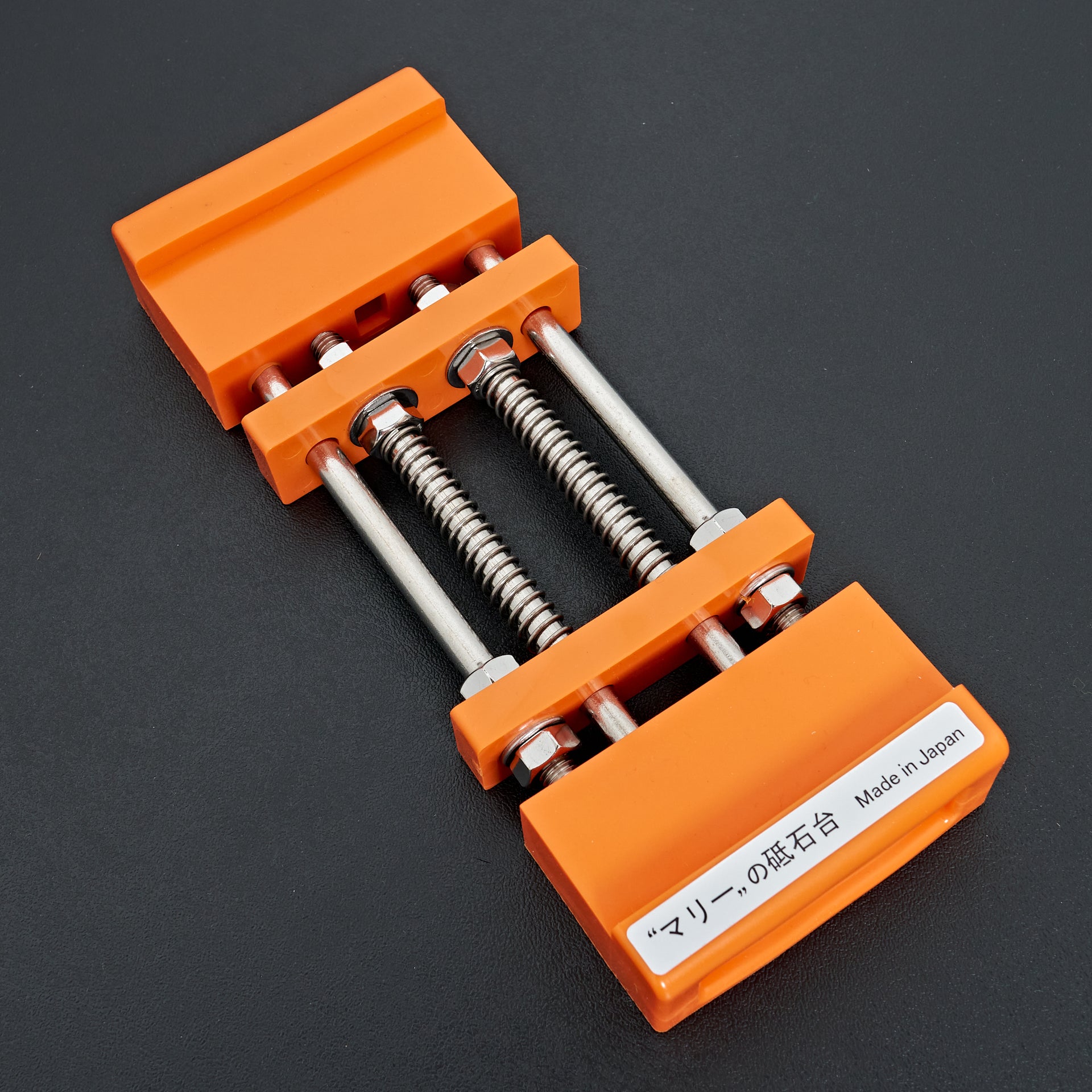 Spring loaded stone holder makes switching out stones fast and easy. Ribbed feet help with sliding and stability. Made in Japan.
