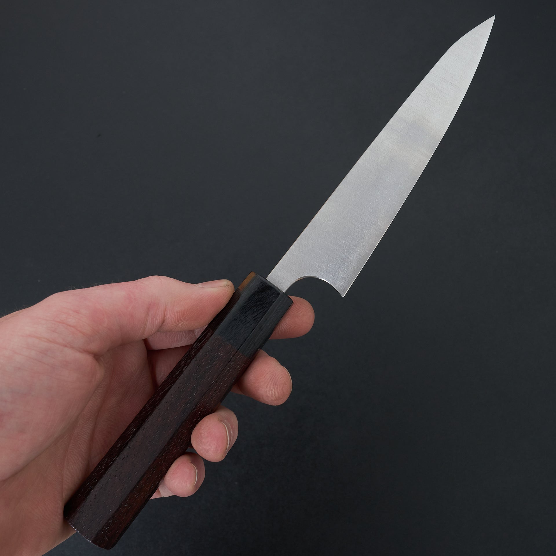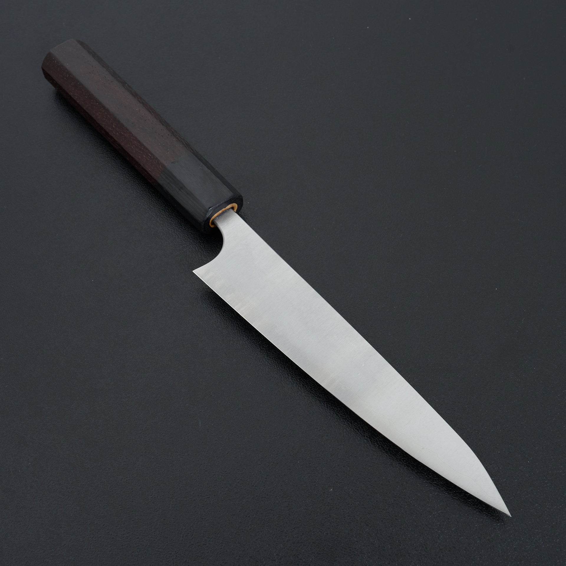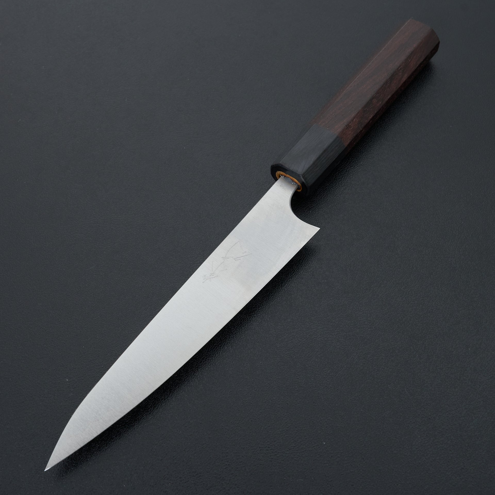 The AS (Aogami Super) Koutetsu line is a super thin and high performance knife. The blade face has a satin finish to help with food release. The spine and heel are both rounded and polished. Stainless steel cladding protects the blade face from reactivity and just the edge of the knife will patina. Fitted with a rosewood octagonal handle.