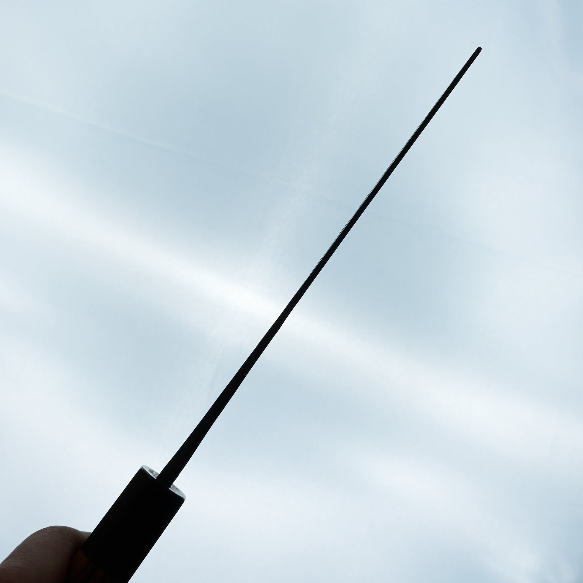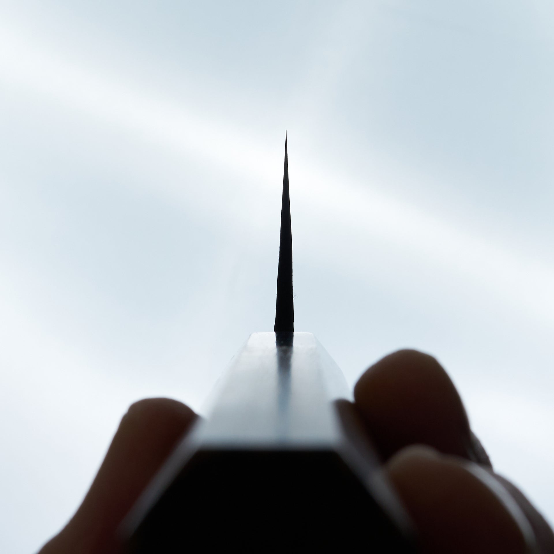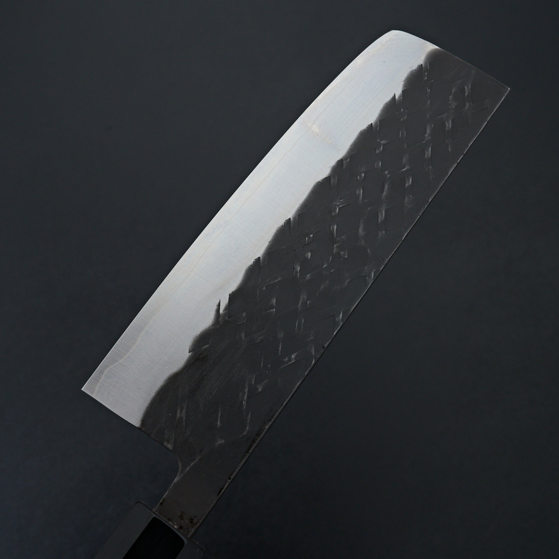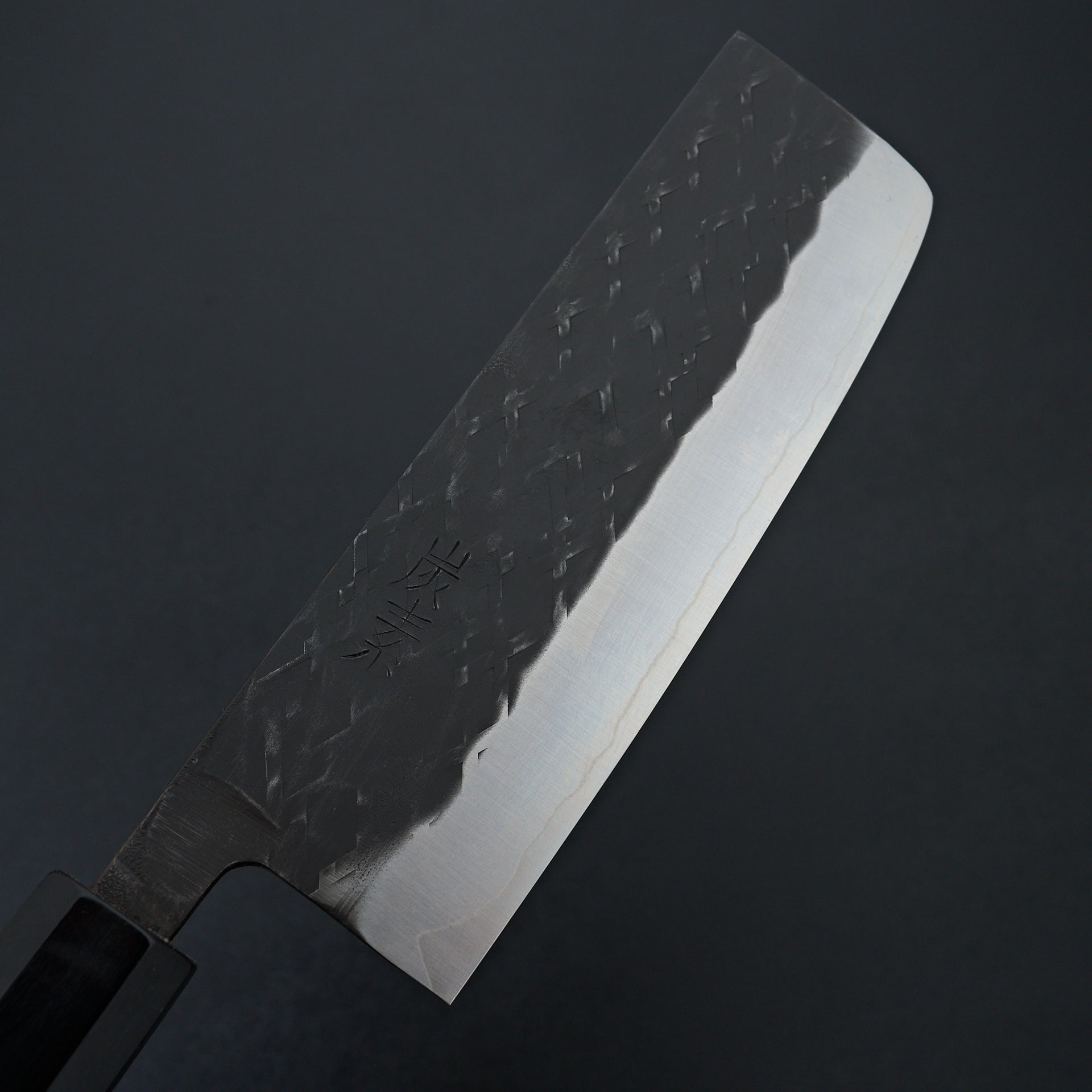 This series is hand forged from SLD semi stainless tool steel, laminated in a soft stainless cladding. SLD, though considered semi stainless, is quite easy to care for and very comparable to stainless in terms of upkeep. It has a high carbon content and high hardness (~64hrc) comparable to that of purer carbon steels. SLD is praised for great edge retention and good durability despite its hardness. The blade face is finished black with hammered tsuchime patterns. These come fitted with octagonal bocote and horn ferrule handles.