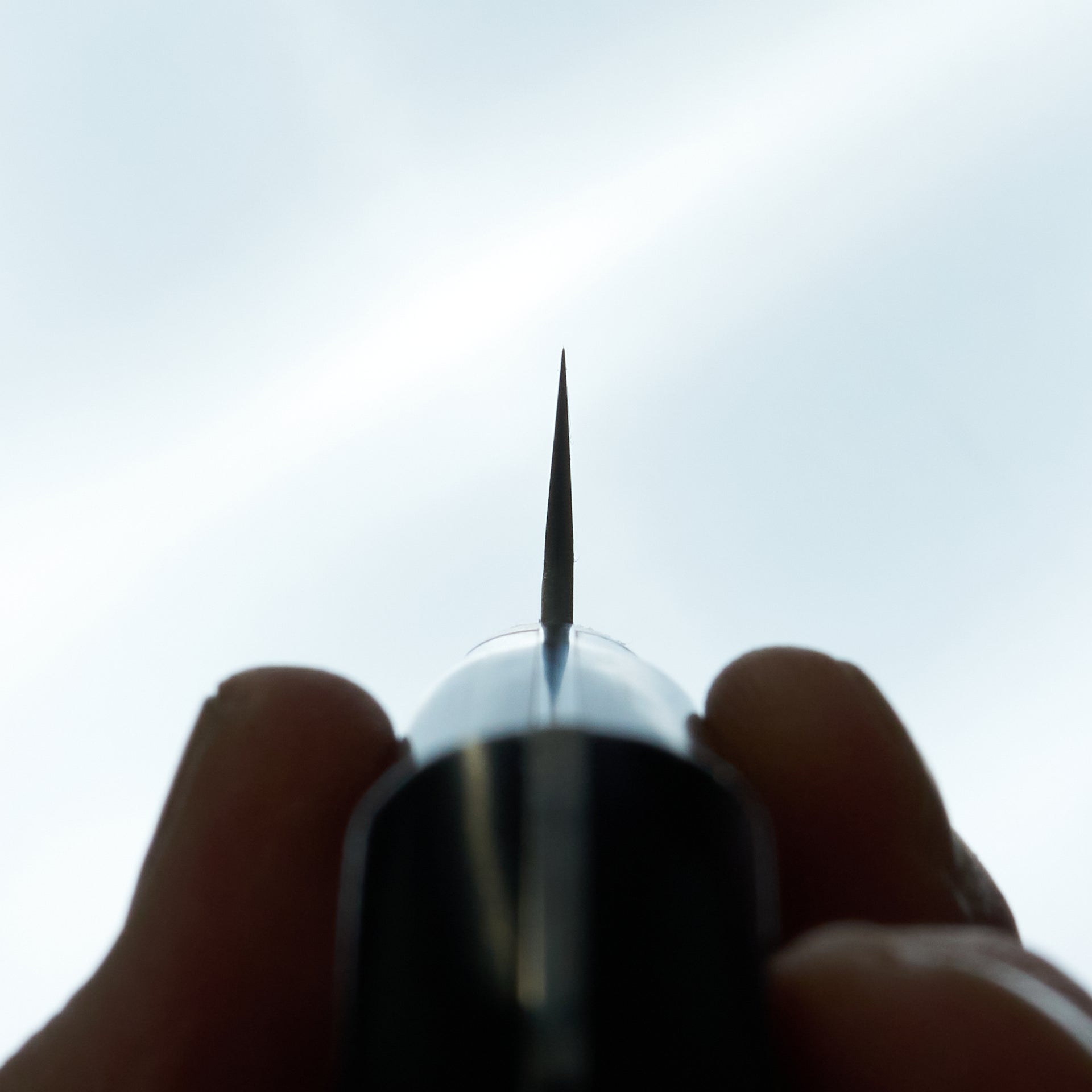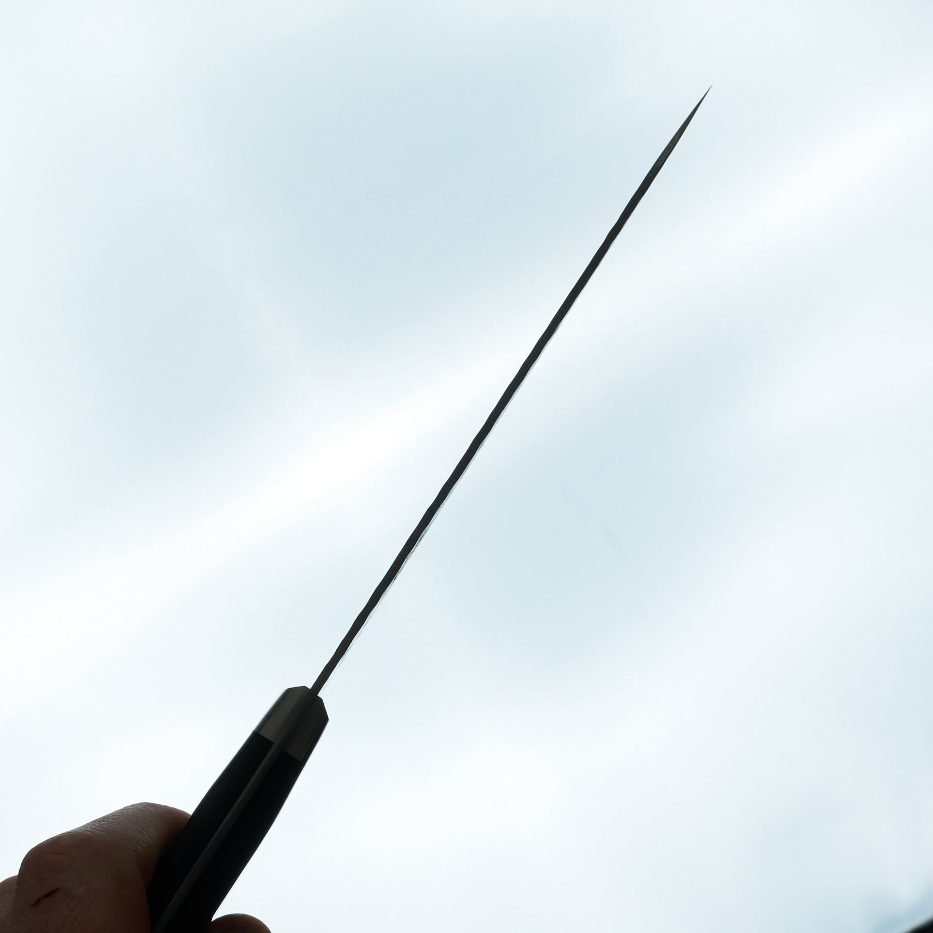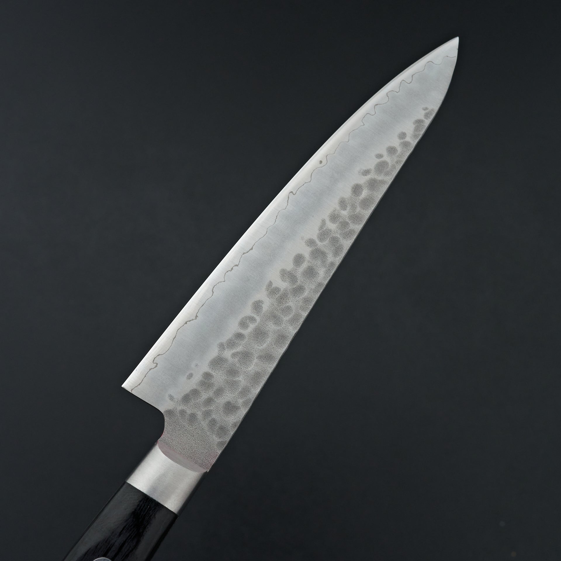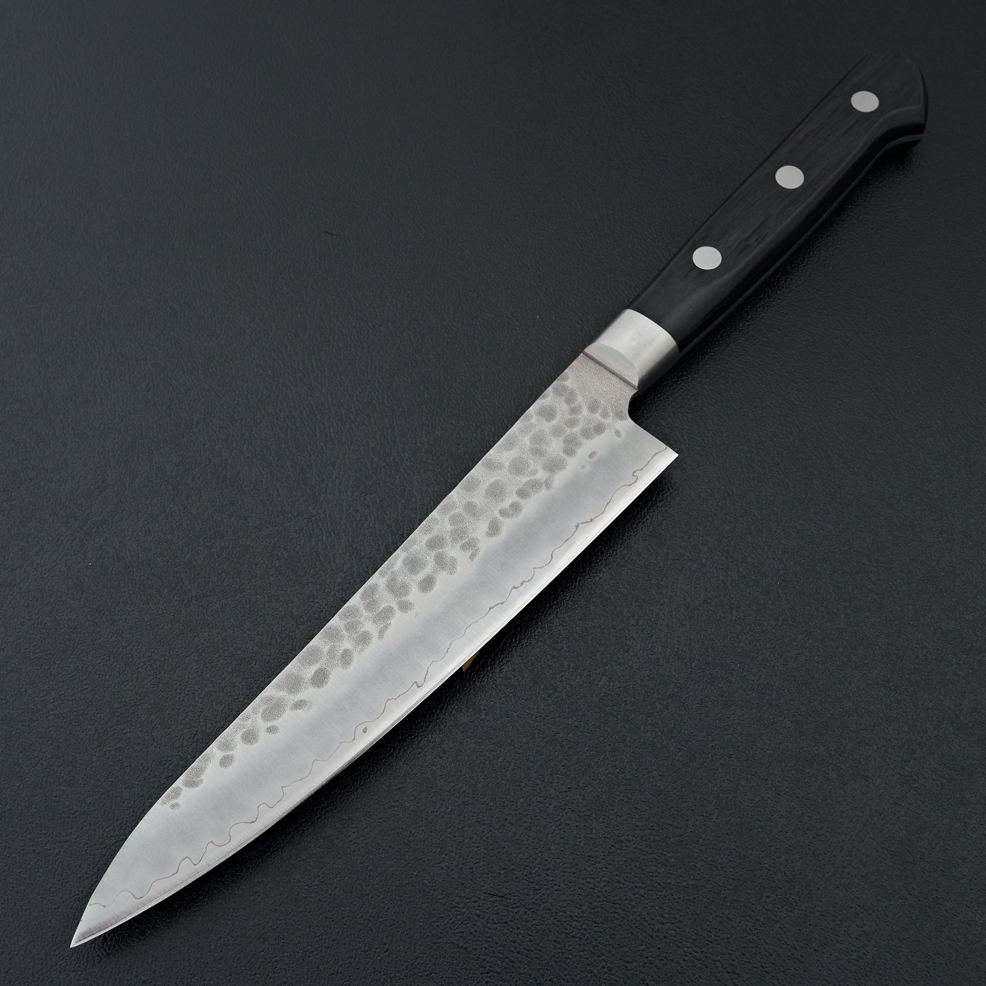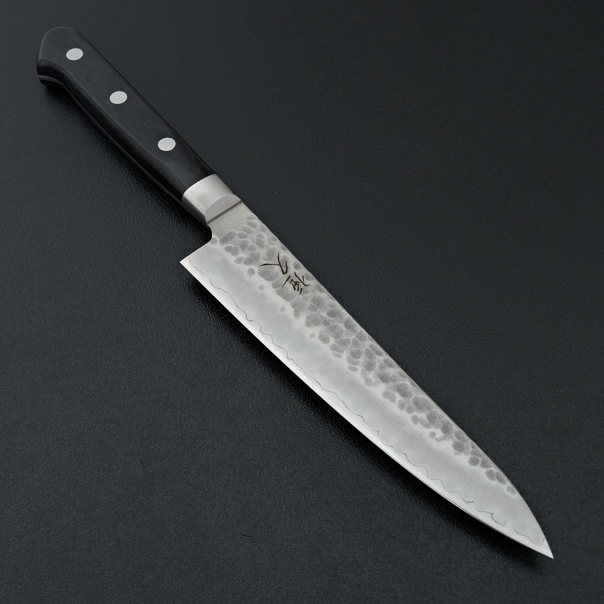Tsunehisa AUS8 is a practical everyday series that has a very balanced performance. Great toughness and enjoyable to sharpen. The blade has a matte tsuchime finish with texture remaining from forging. The handle is full tang with black pakka wood.