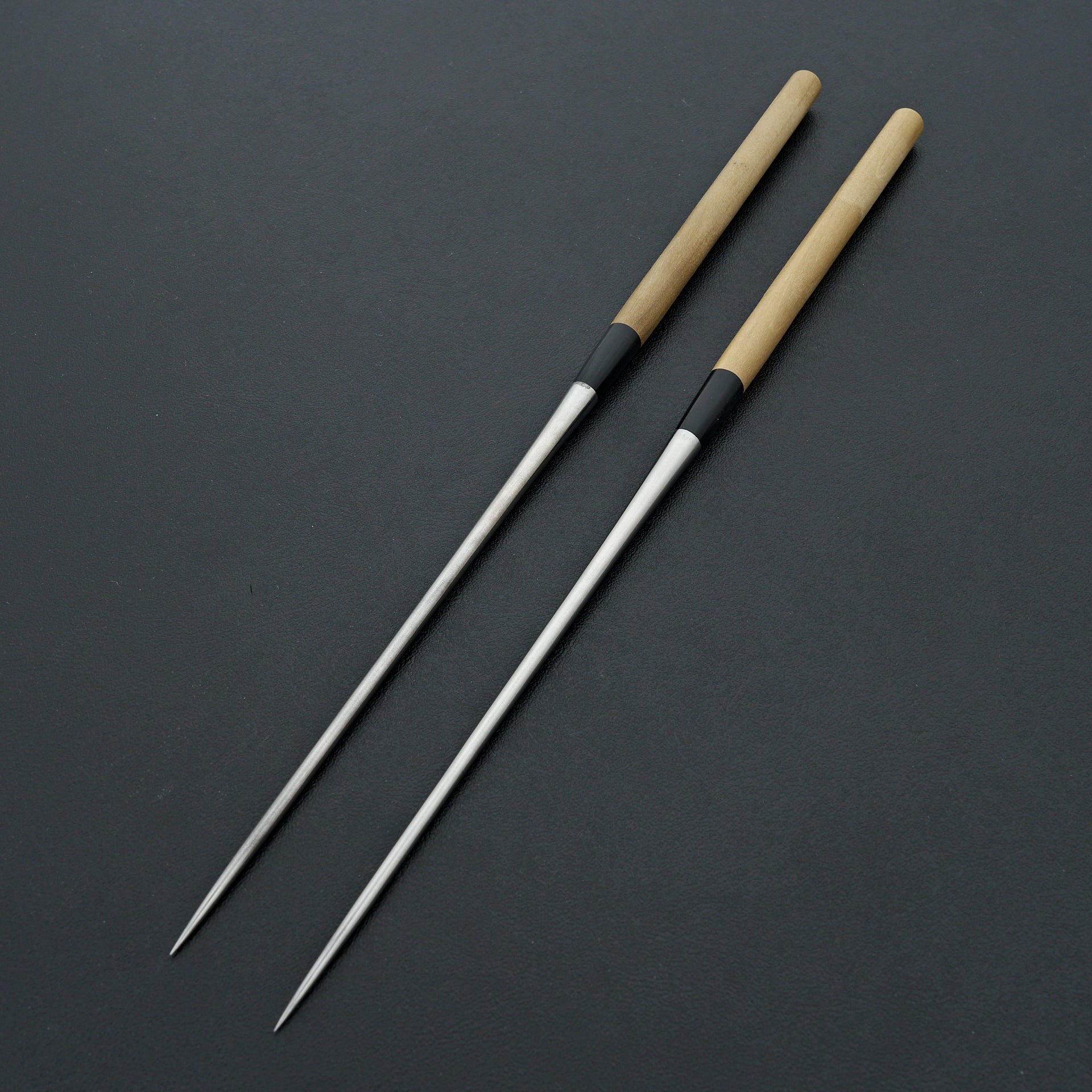 Traditional Japanese plating chopsticks made from Inox stainless steel fitted with oval Hoo (magnolia) wood and black buffalo ferrules.