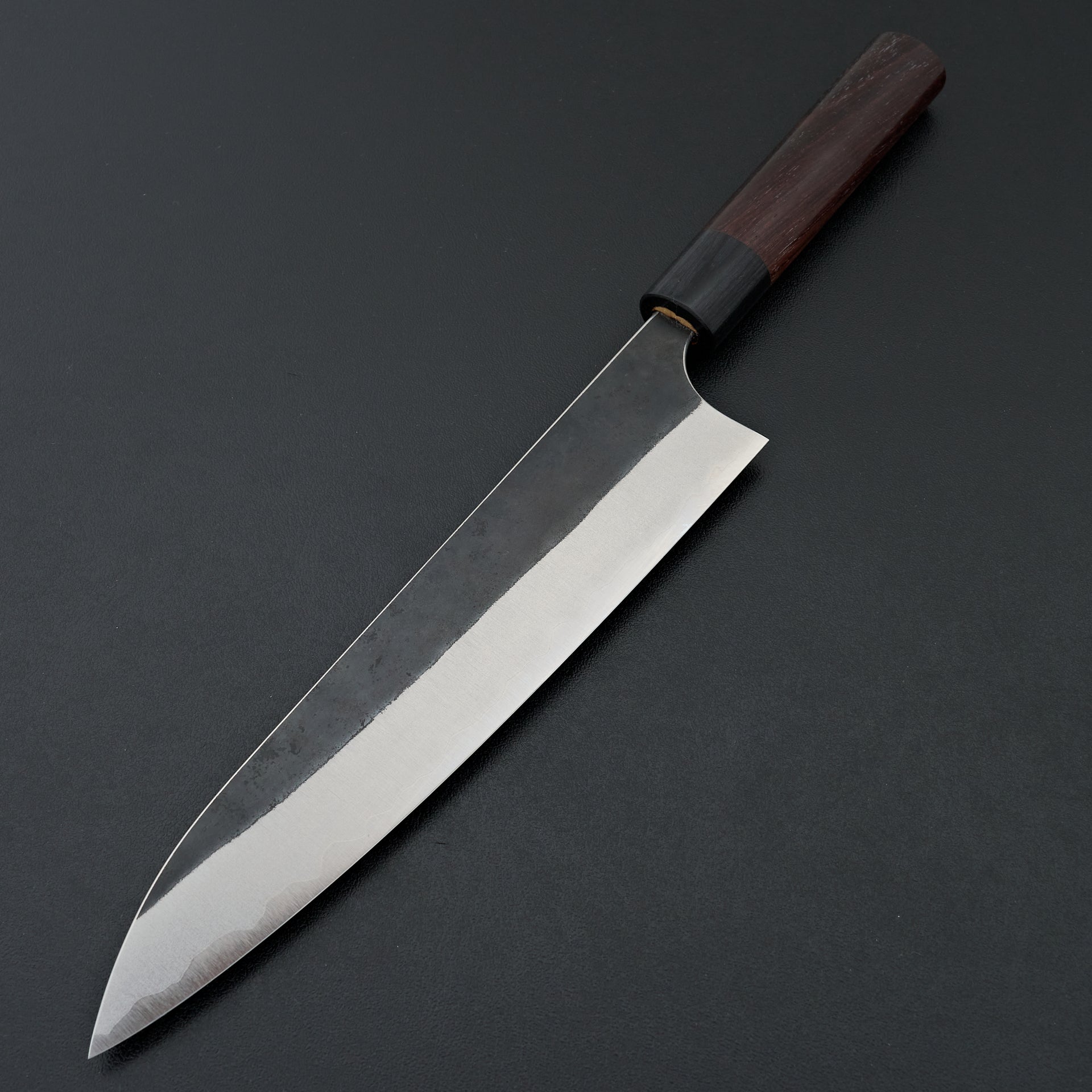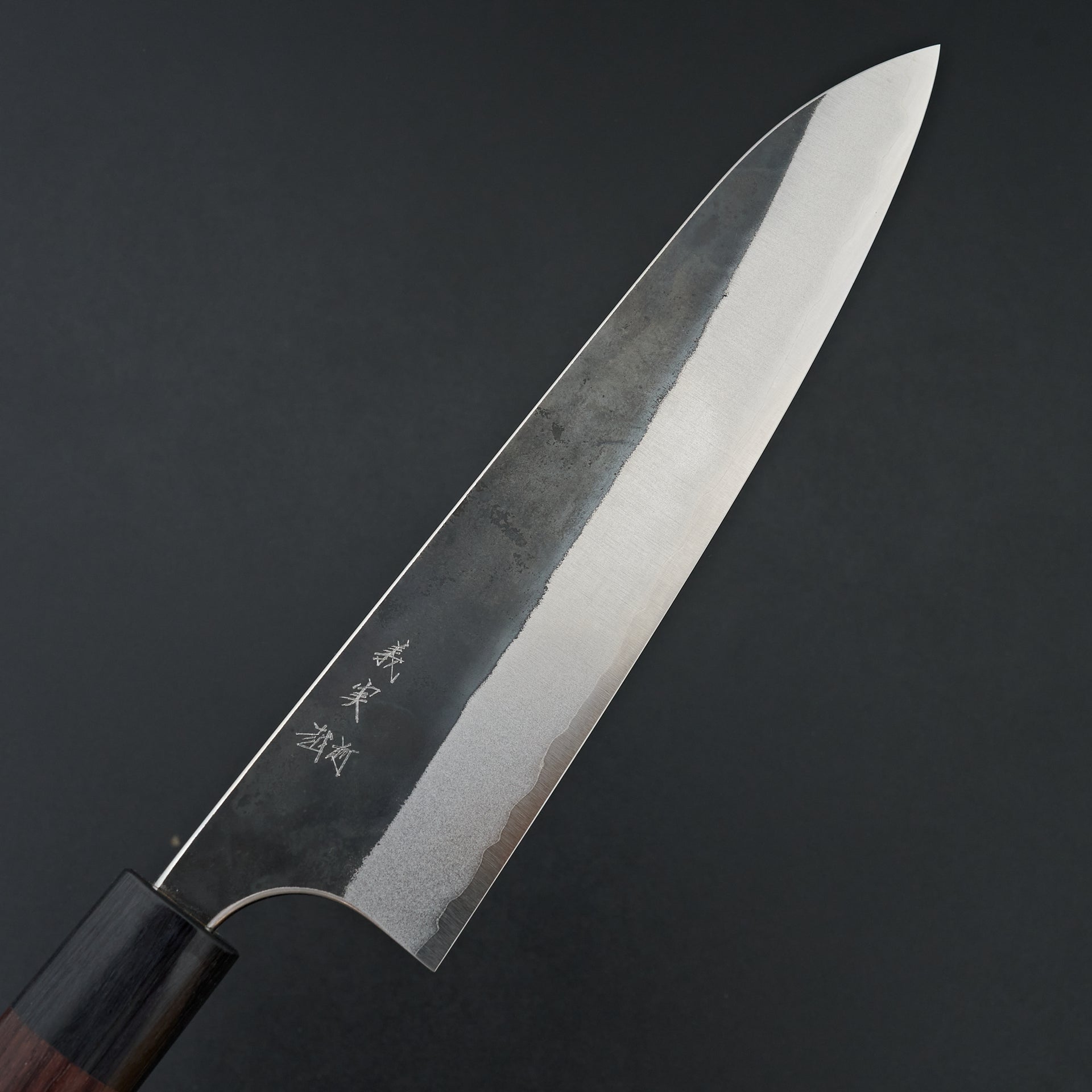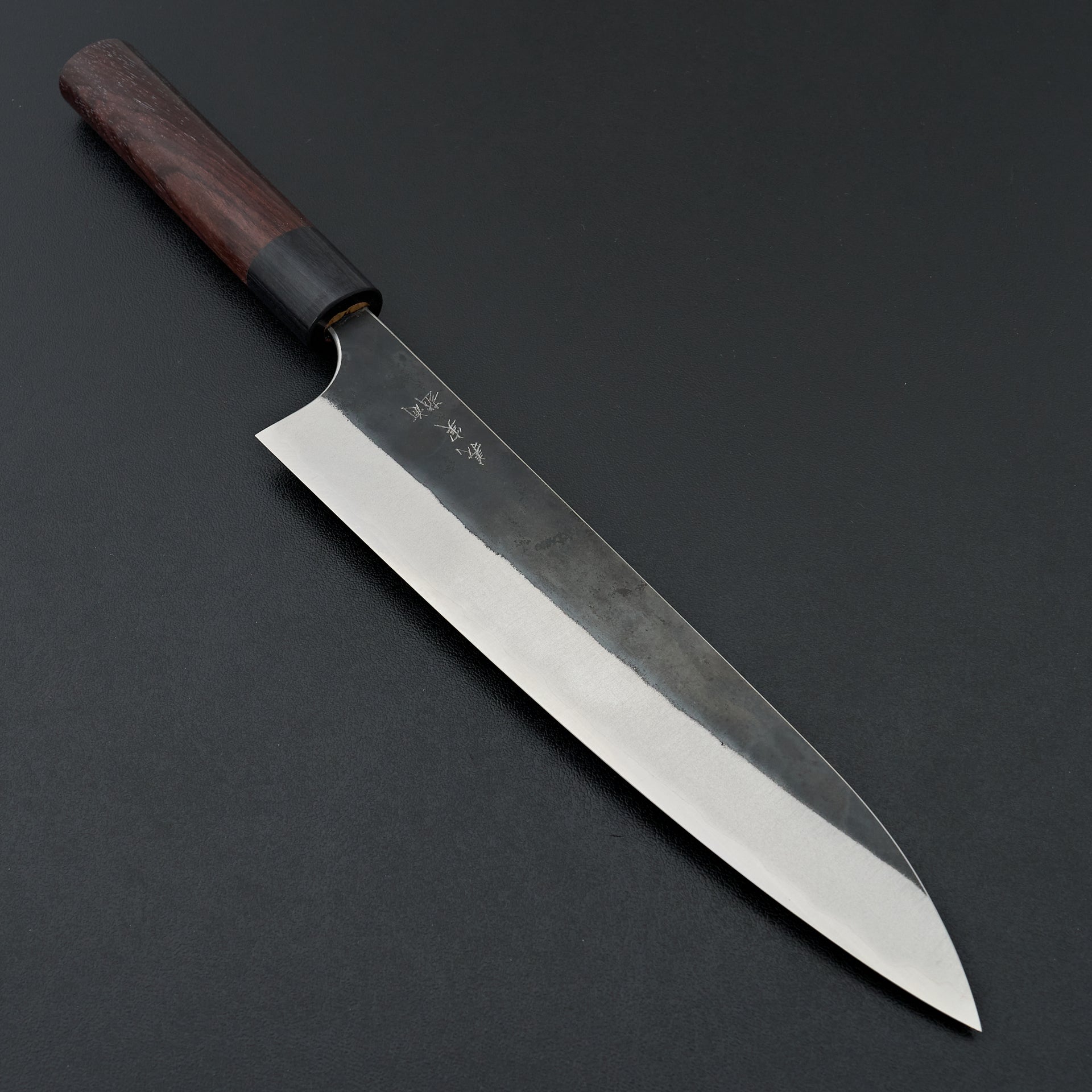 This series is made from aogami super steel (blue super) steel treated to 63-64 HRC and cladded in stainless with a kurouchi finish. This knife is very thin behind the edge and has excellent edge retention. The handle is made from oval rosewood.