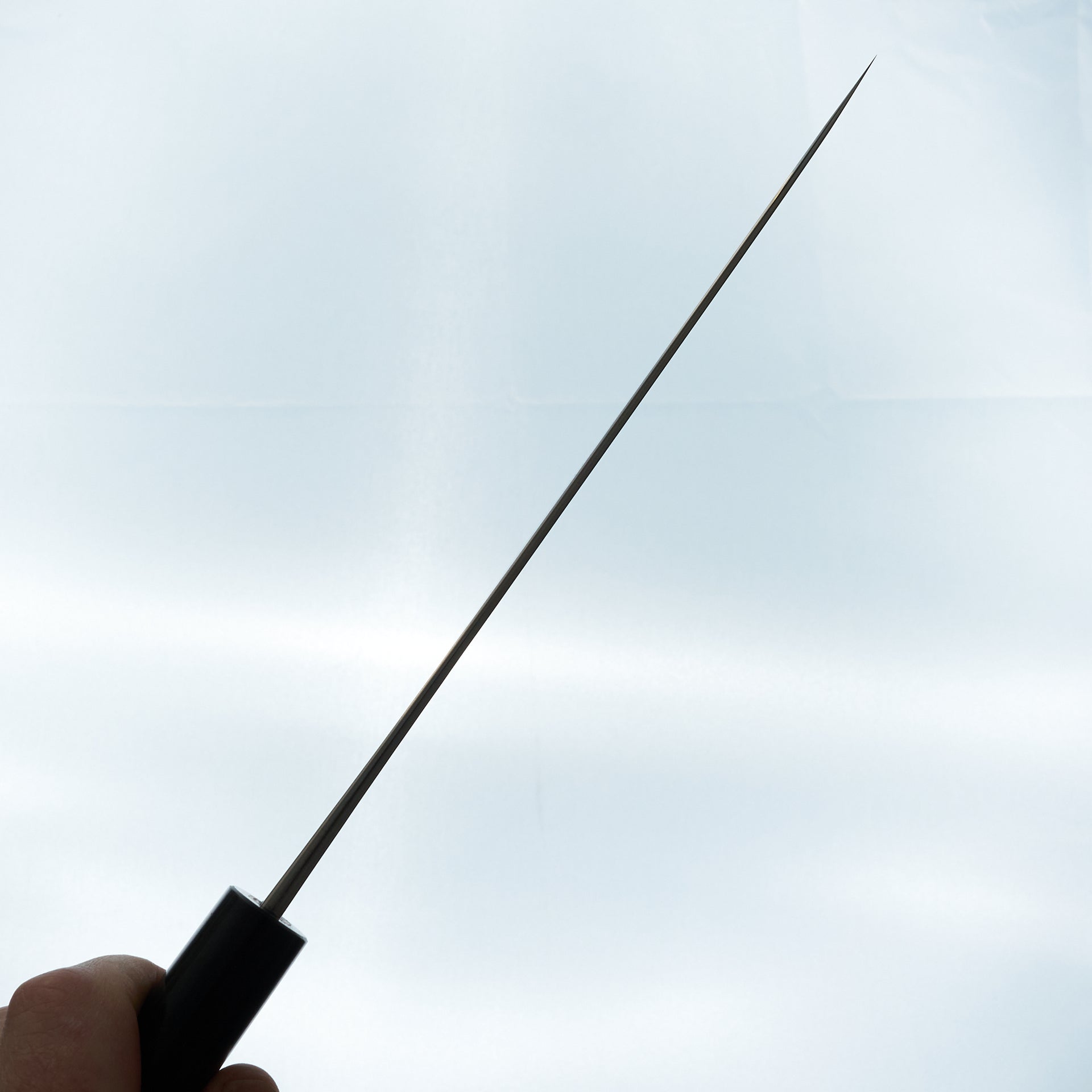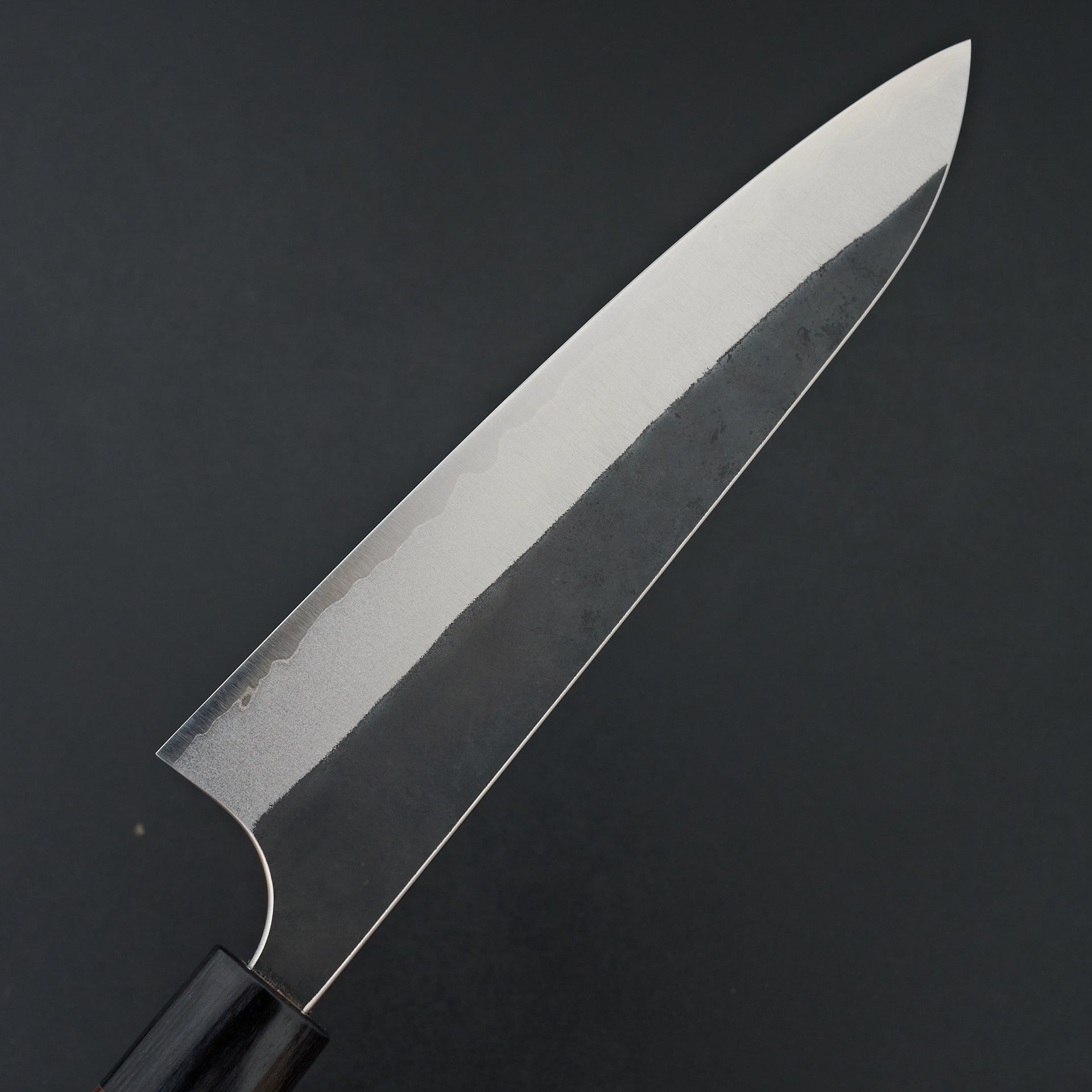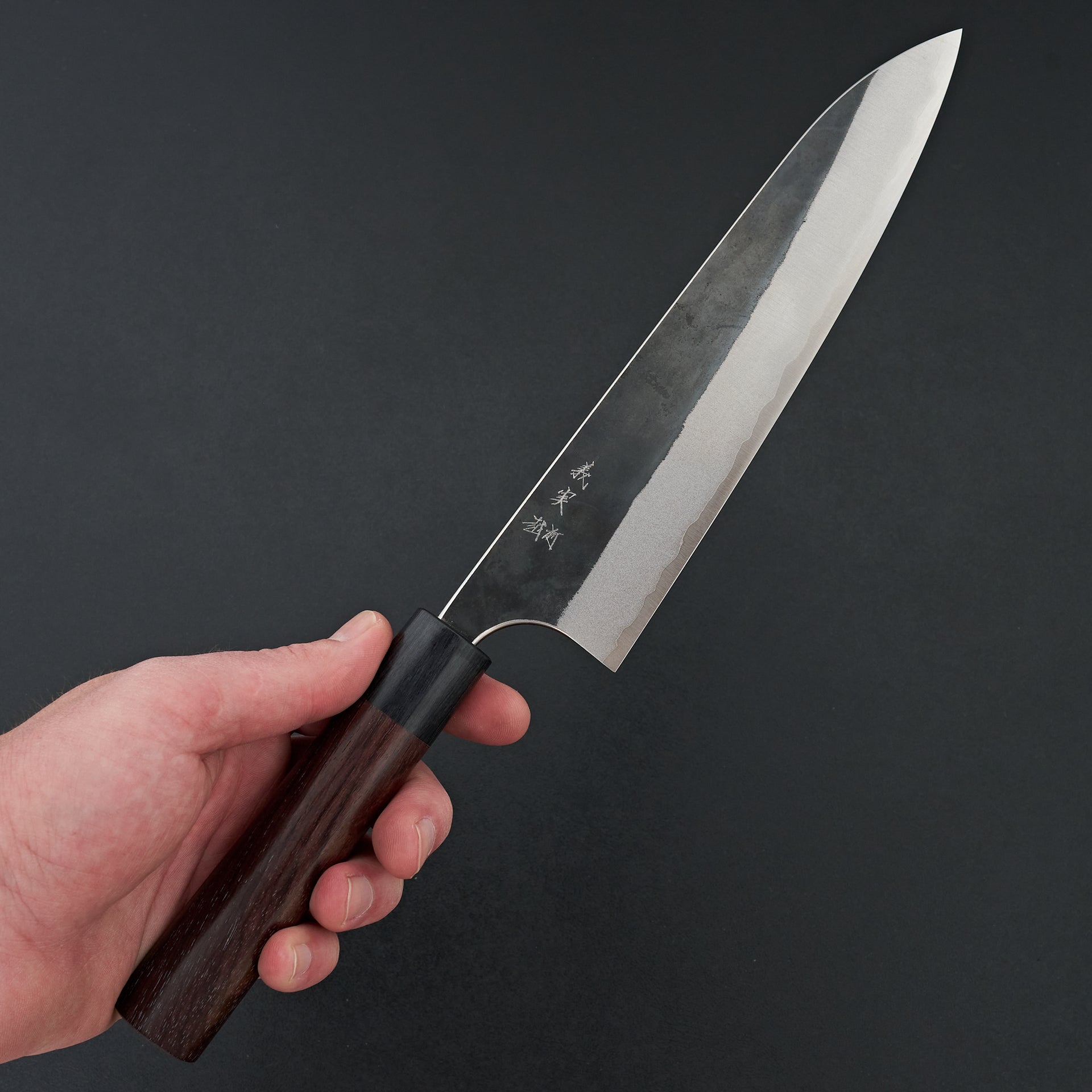 This series is made from aogami super steel (blue super) steel treated to 63-64 HRC and cladded in stainless with a kurouchi finish. This knife is very thin behind the edge and has excellent edge retention. The handle is made from oval rosewood.