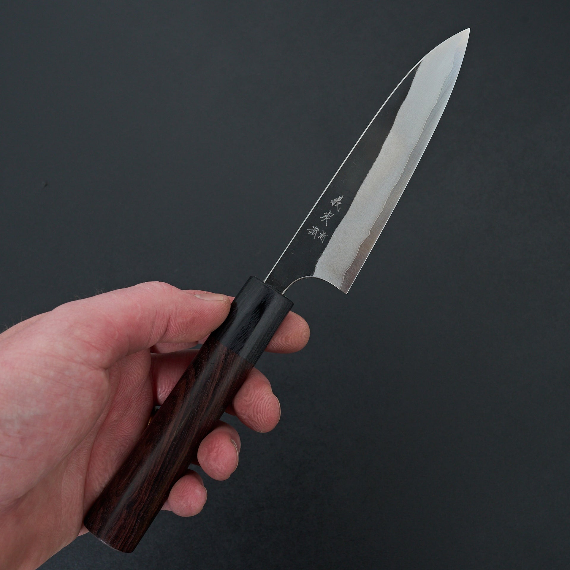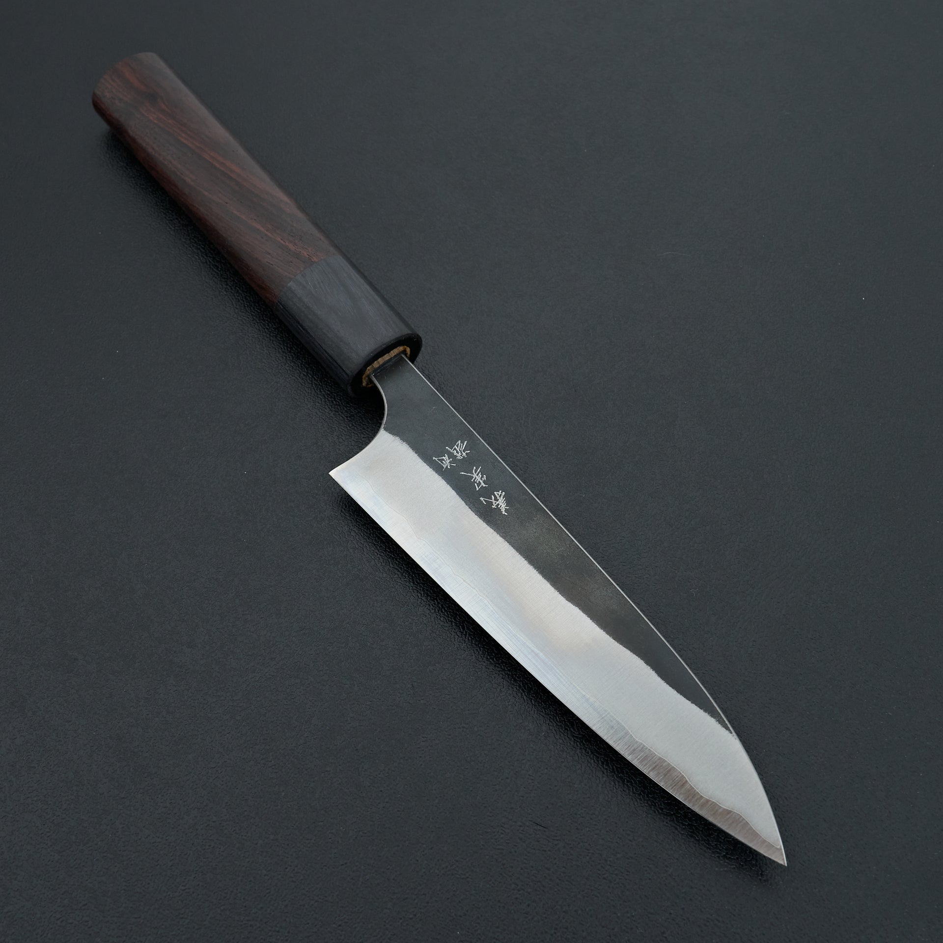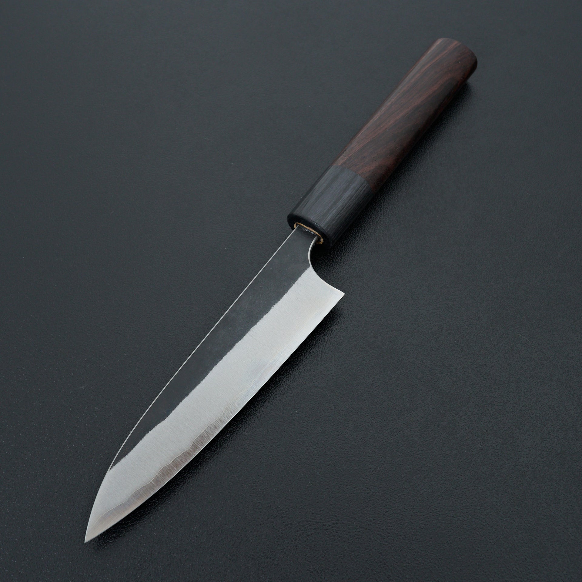 This series is made from aogami super steel (blue super) steel treated to 63-64 HRC and cladded in stainless with a kurouchi finish. This knife is very thin behind the edge and has excellent edge retention. The handle is made from oval rosewood.