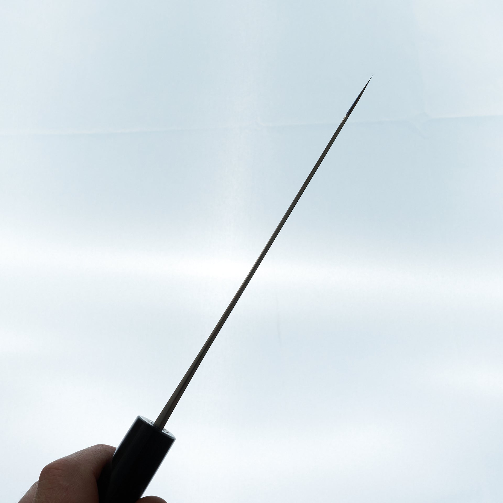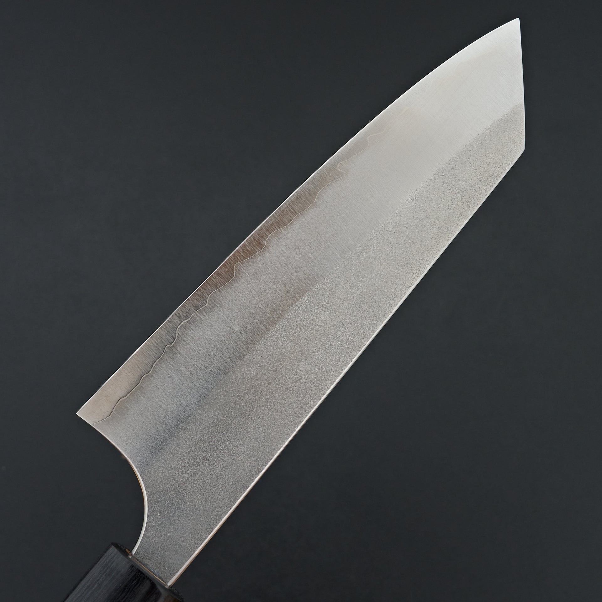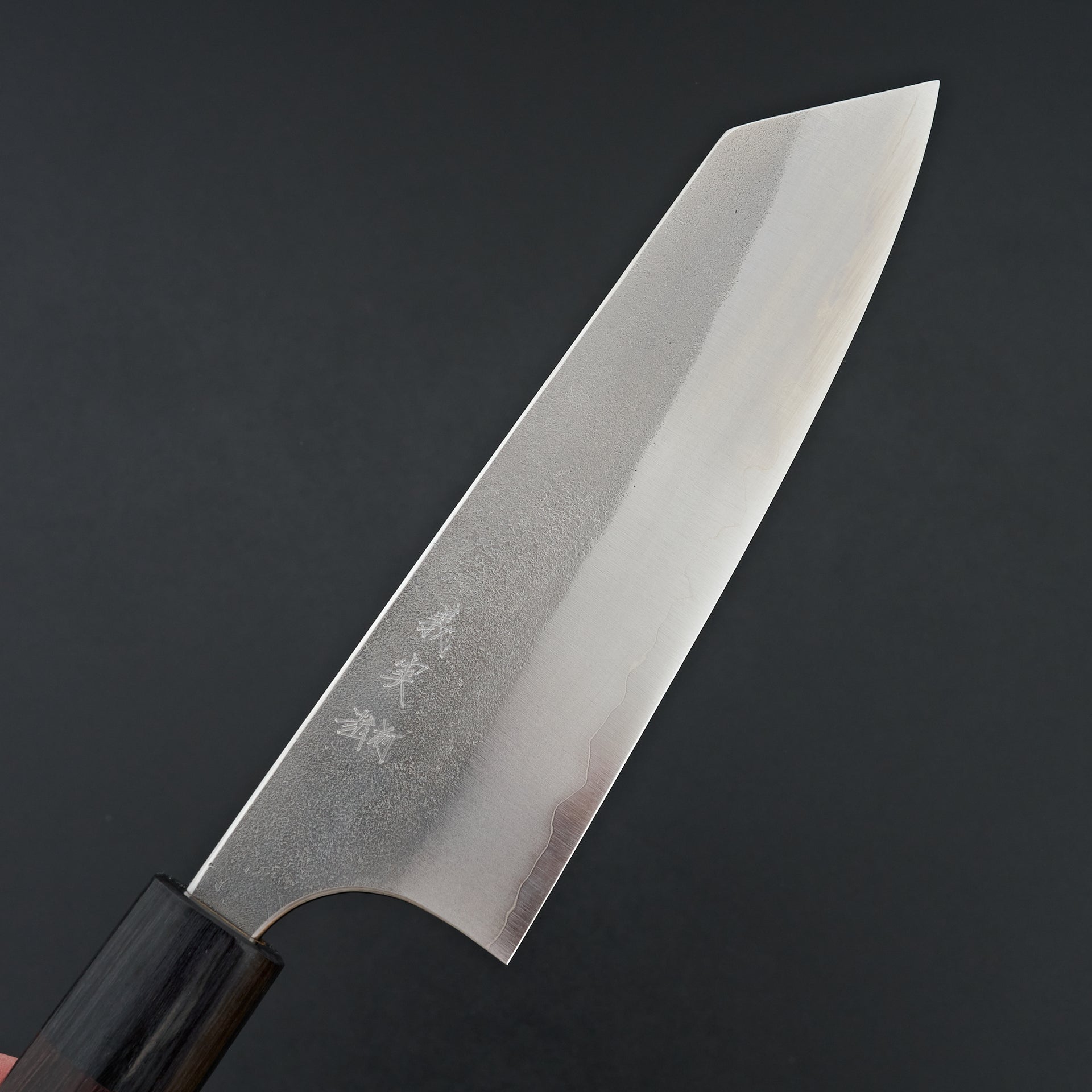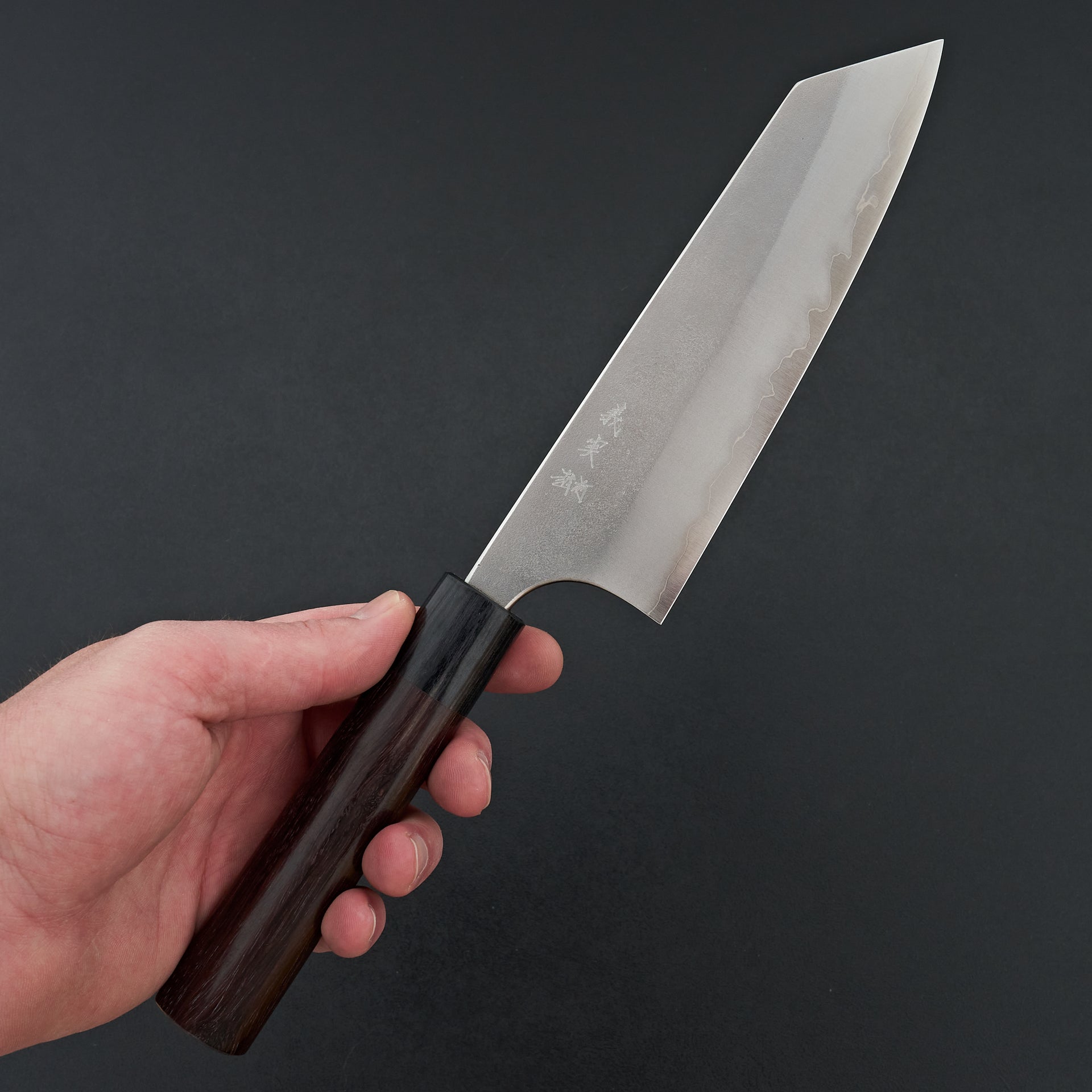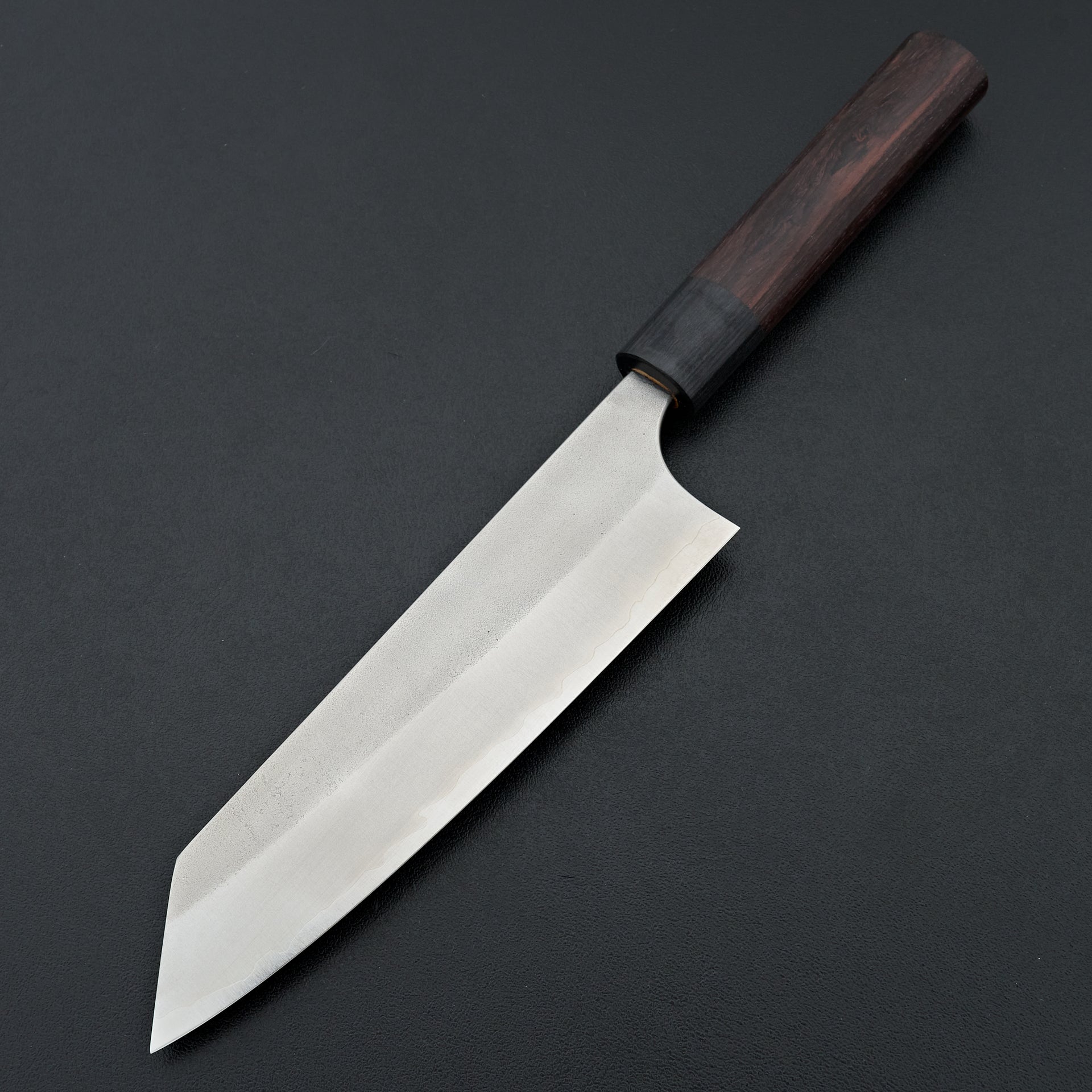 This series is made from aogami super steel (blue super) steel treated to 63-64 HRC and cladded in stainless with a kurouchi finish. This knife is very thin behind the edge and has excellent edge retention. The handle is made from oval rosewood.