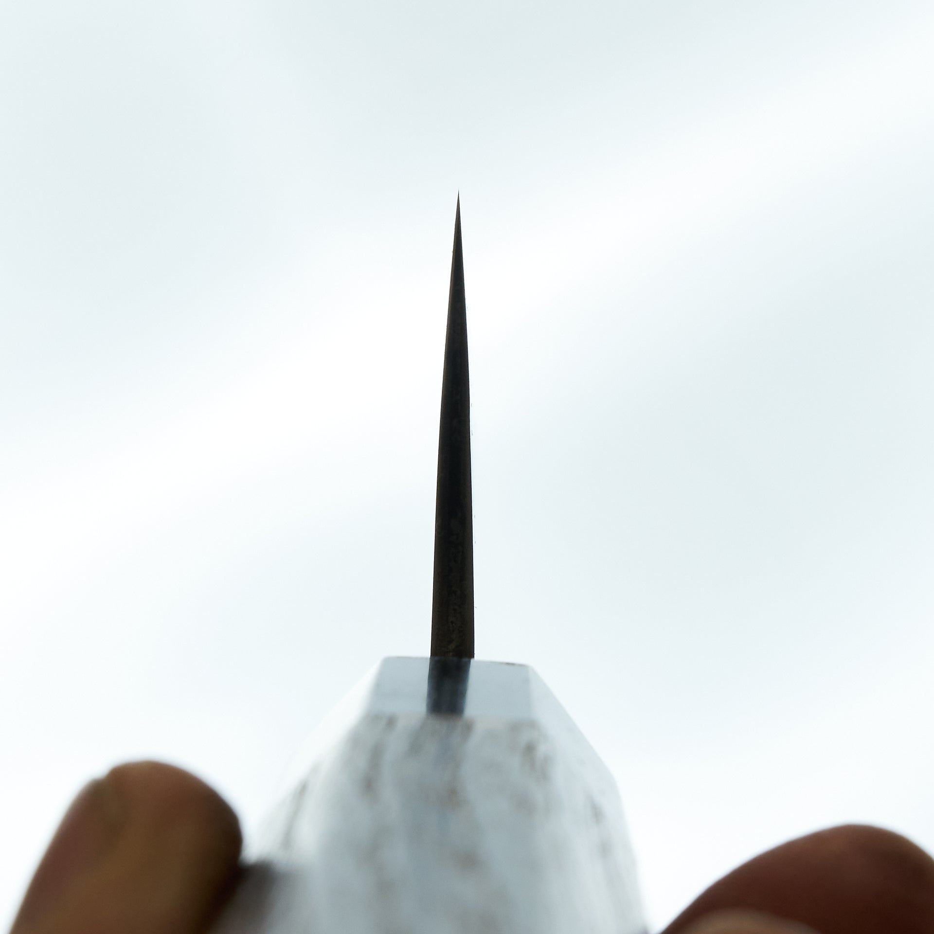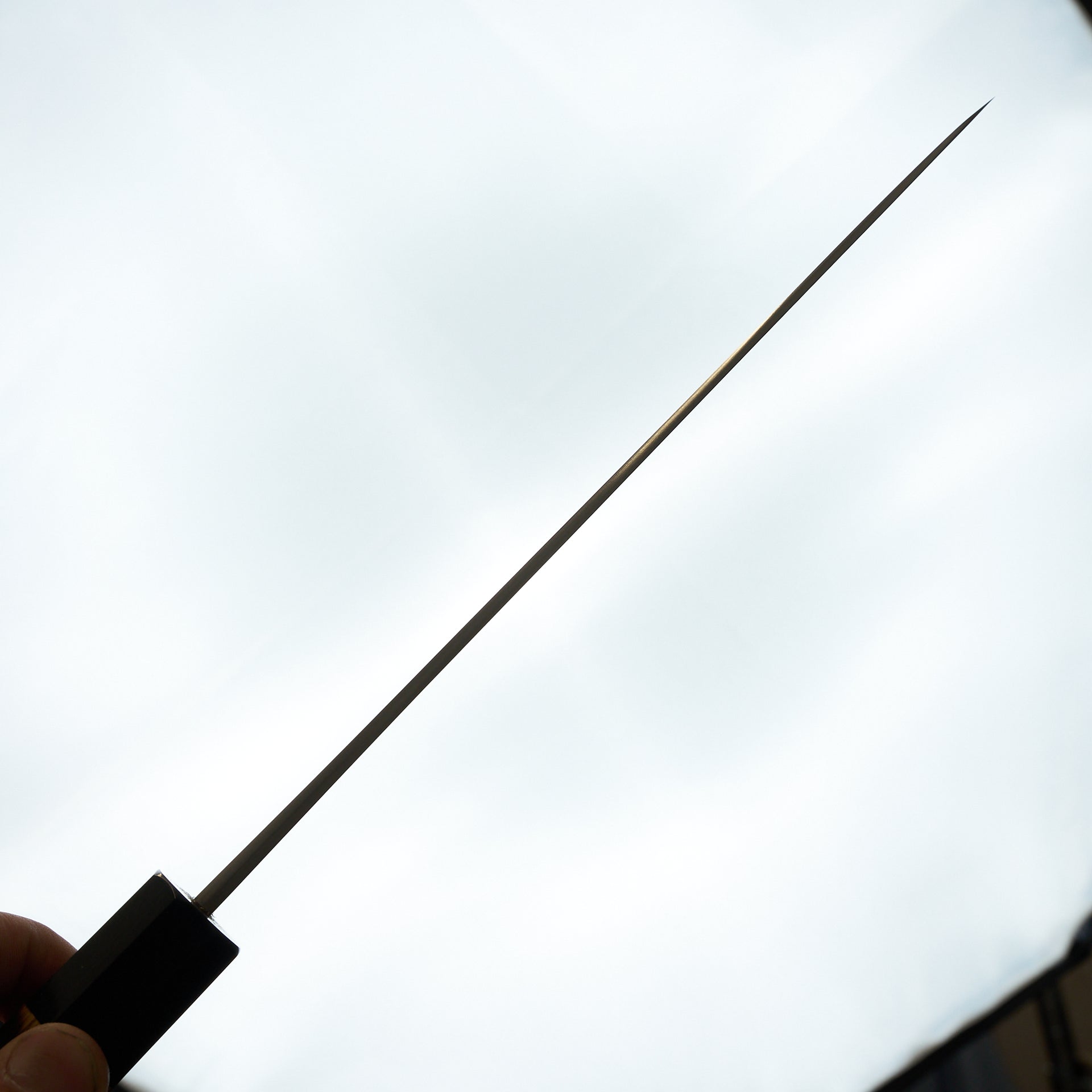 Toshihiro Wakui is a very talented blacksmith who is known for his superb grind and craftmanship. This series is forged from shirogami #2 (white #2) core steel with stainless cladding and a hardness of 63-64 hrc. The blades are very thin behind the edge while still retaining a stiffness at the spine. Wakui's blades have a very enjoyable cutting feel and move through ingredients with ease. Handle is octagonal burnt chestnut.